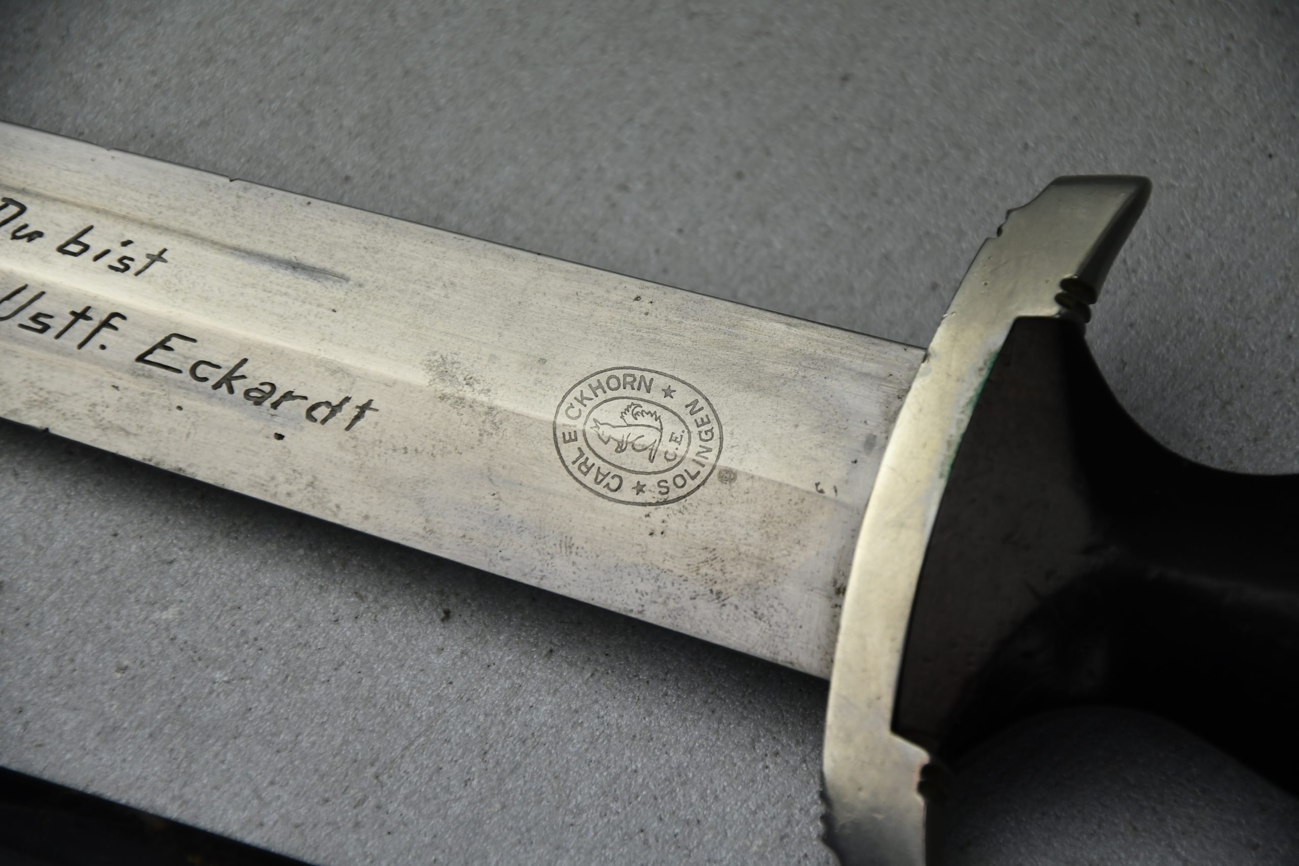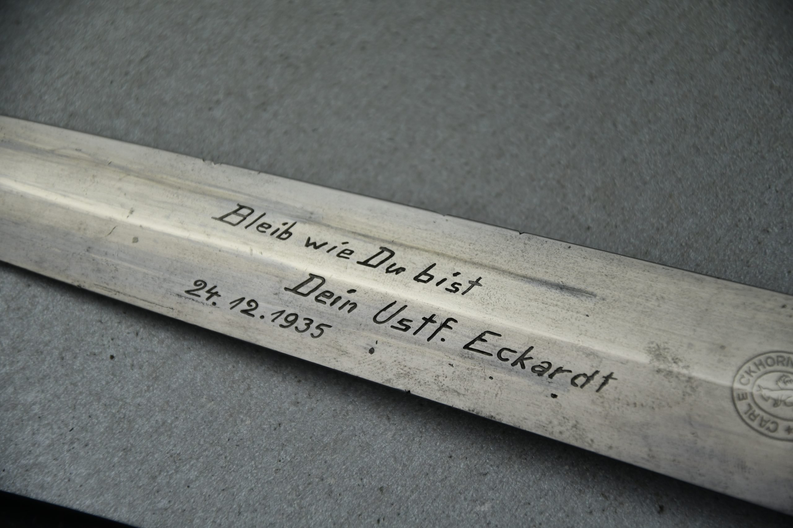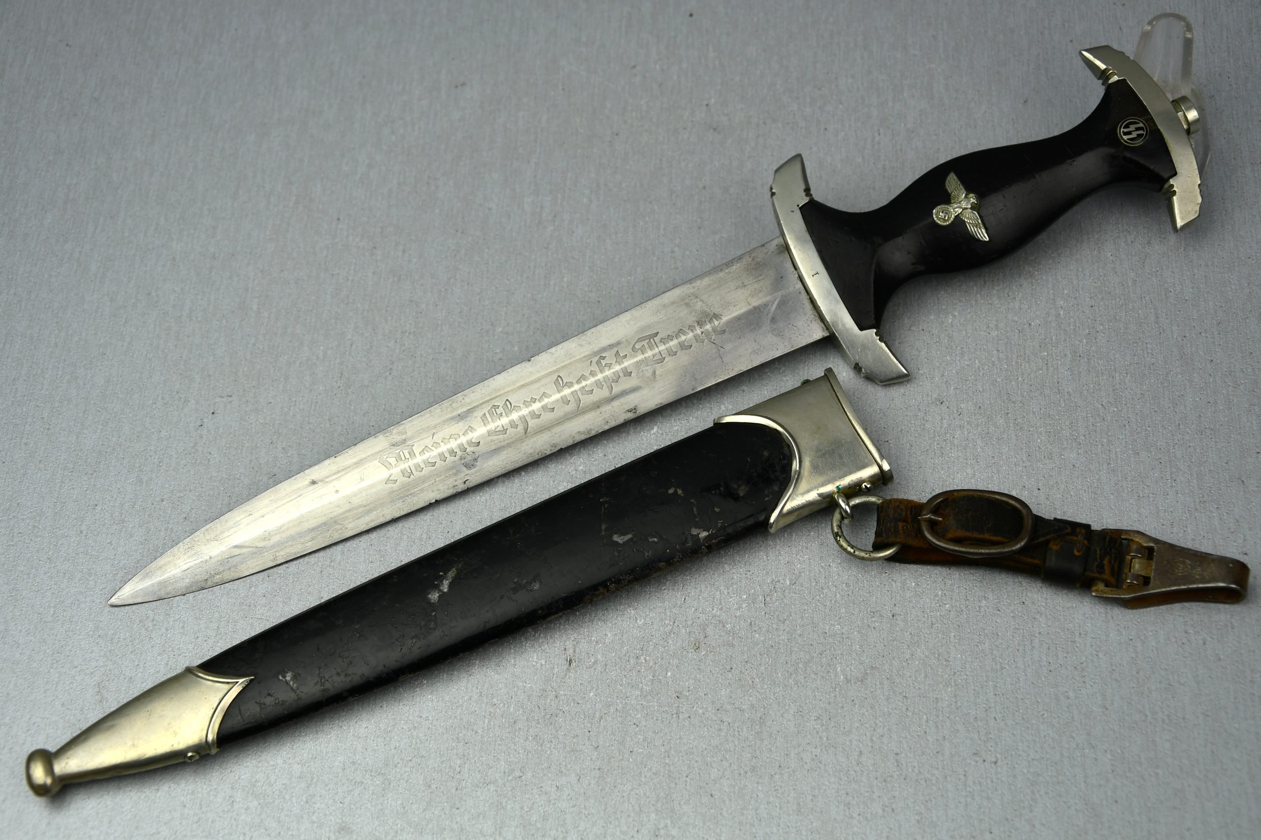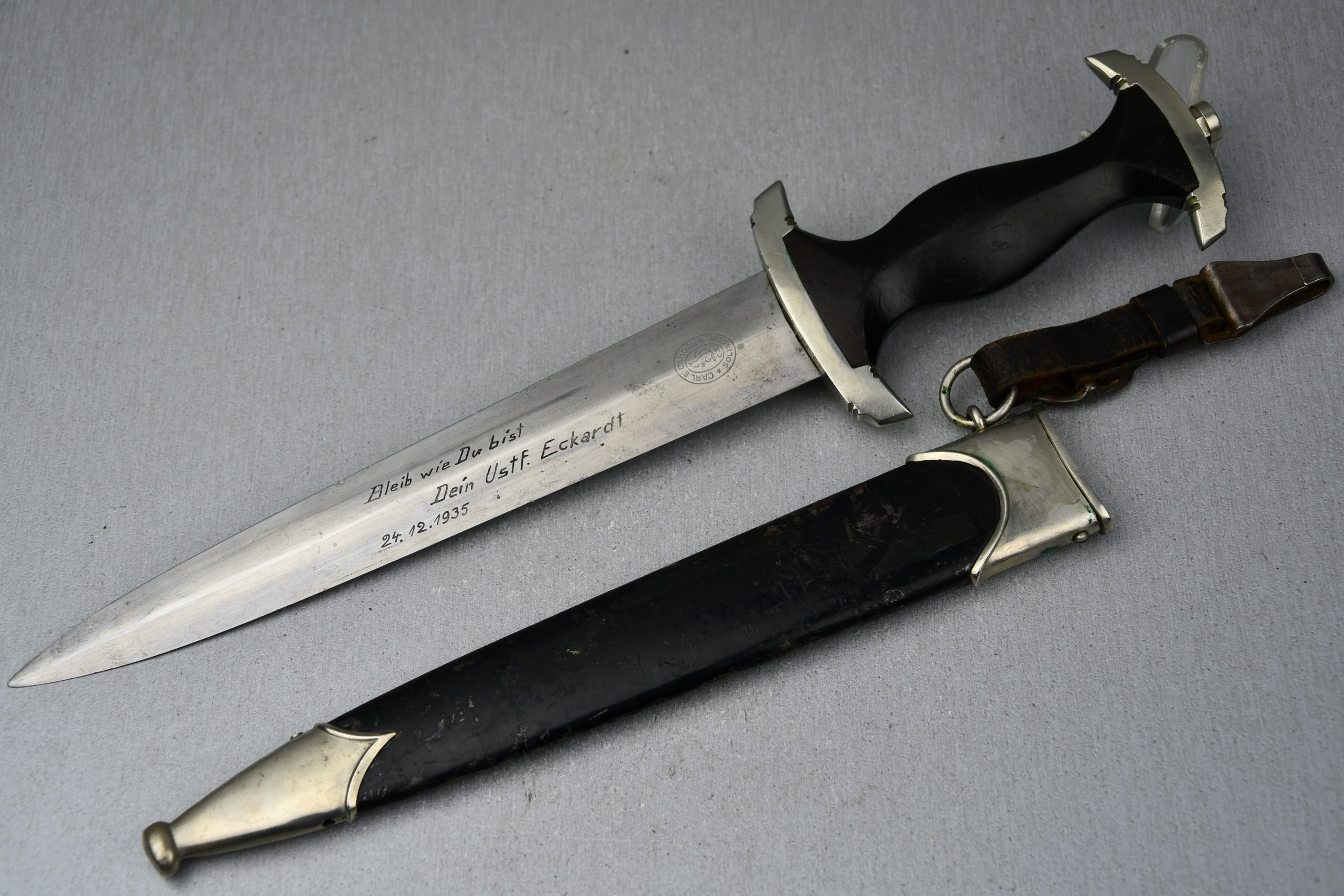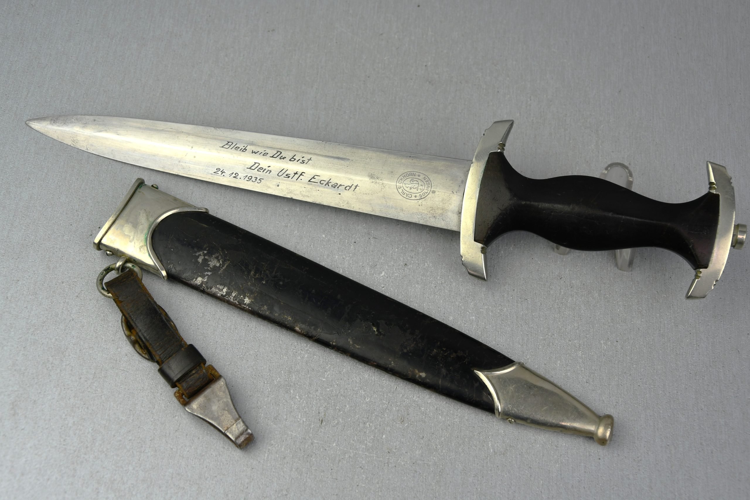 Untouched M33 pattern black colored SS dagger in good condition. The SS dagger is an early example with nickel parts and has roman number I on the cross guard. The blade is worn and maker marked by Carl Eickhorn Solingen. The front of the blade shows the SS motto Meine Ehre heist Treue, etched on it. The best thing is of course te dedication engraved with the text; 'Bleib wie Du bist, Dein Ustf. Eckardt 24.12.1935' (Stay as you are, Your SS-Untersturmfรผhrer Eckardt 24.12.1935), wich must have been a Christman present based on the date. Comes with its original black leather hanger, maker marked RZM M5/71 OLC. The bottom of the crossguard shows the SS soldier's ID number as well, could be a nice research project. Solid early SS dagger with no remarks, a true investment piece that looks great!SHIPPING ONLY IN MAINLAND EUROPE โ COULD BRING THIS TO USA WHEN I FLY OVER