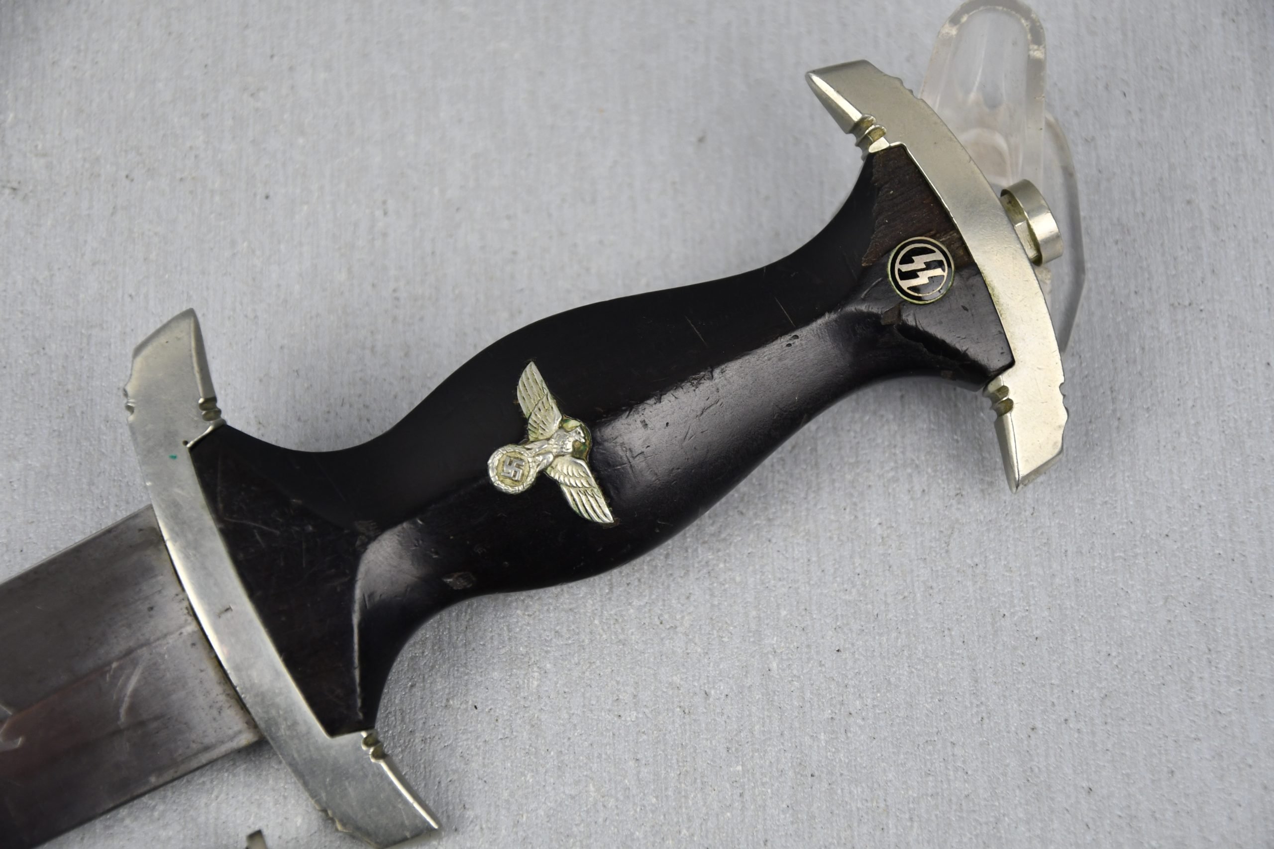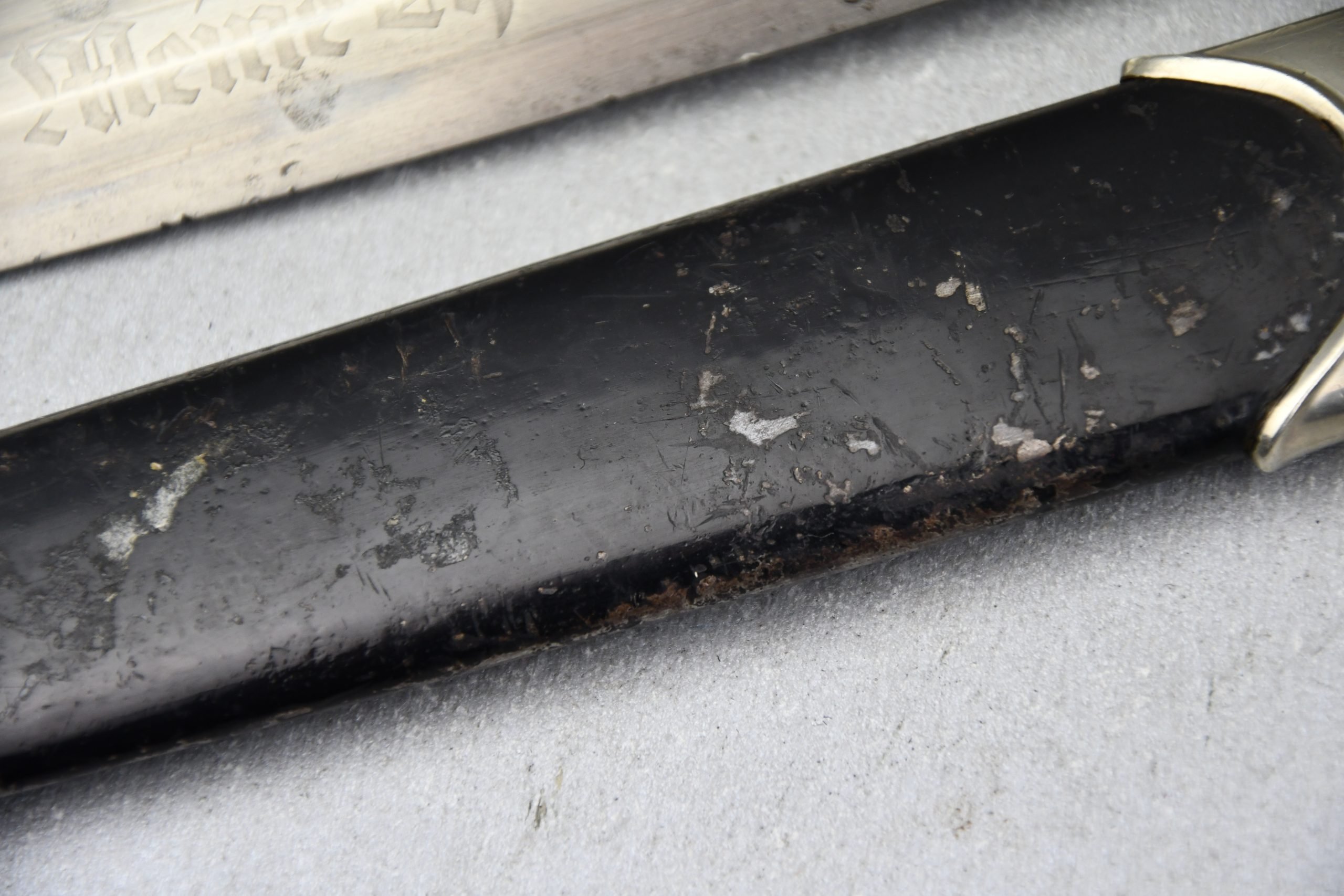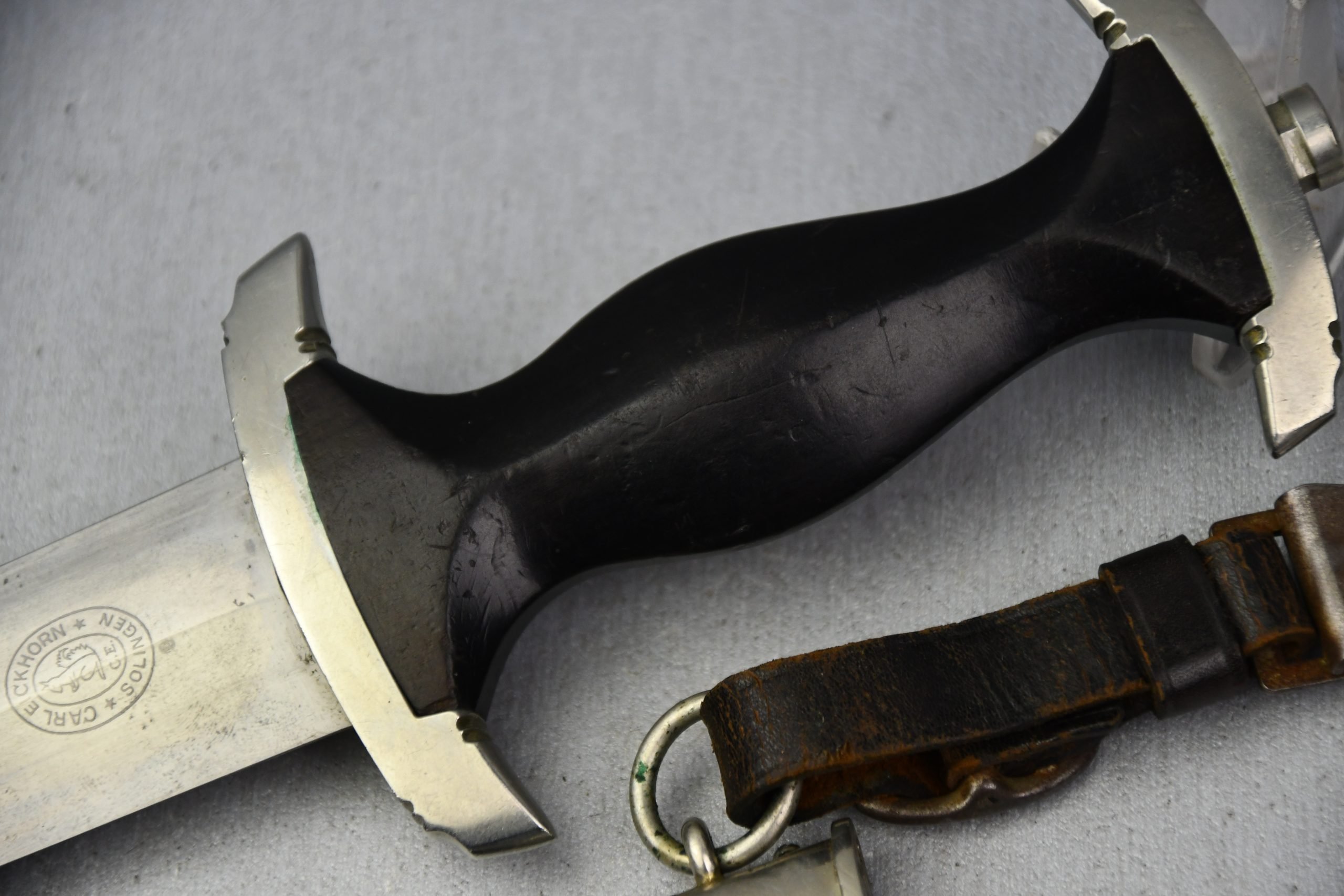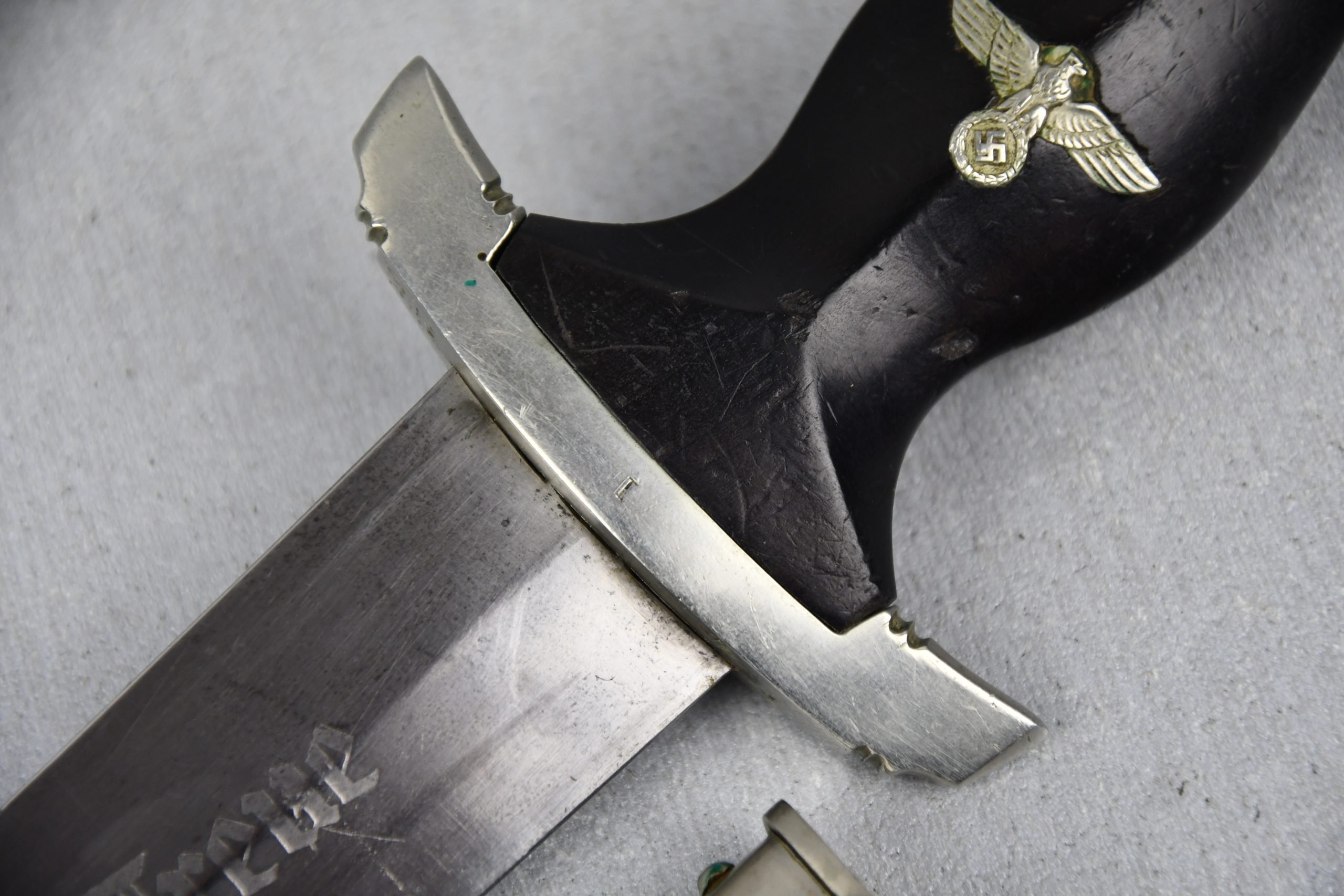 Untouched M33 pattern black colored SS dagger in good condition. The SS dagger is an early example with nickel parts and has roman number I on the cross guard. The blade is worn and maker marked by Carl Eickhorn Solingen. The front of the blade shows the SS motto Meine Ehre heist Treue, etched on it. The best thing is of course te dedication engraved with the text; 'Bleib wie Du bist, Dein Ustf. Eckardt 24.12.1935' (Stay as you are, Your SS-Untersturmfรผhrer Eckardt 24.12.1935), wich must have been a Christman present based on the date. Comes with its original black leather hanger, maker marked RZM M5/71 OLC. The bottom of the crossguard shows the SS soldier's ID number as well, could be a nice research project. Solid early SS dagger with no remarks, a true investment piece that looks great!SHIPPING ONLY IN MAINLAND EUROPE โ COULD BRING THIS TO USA WHEN I FLY OVER
