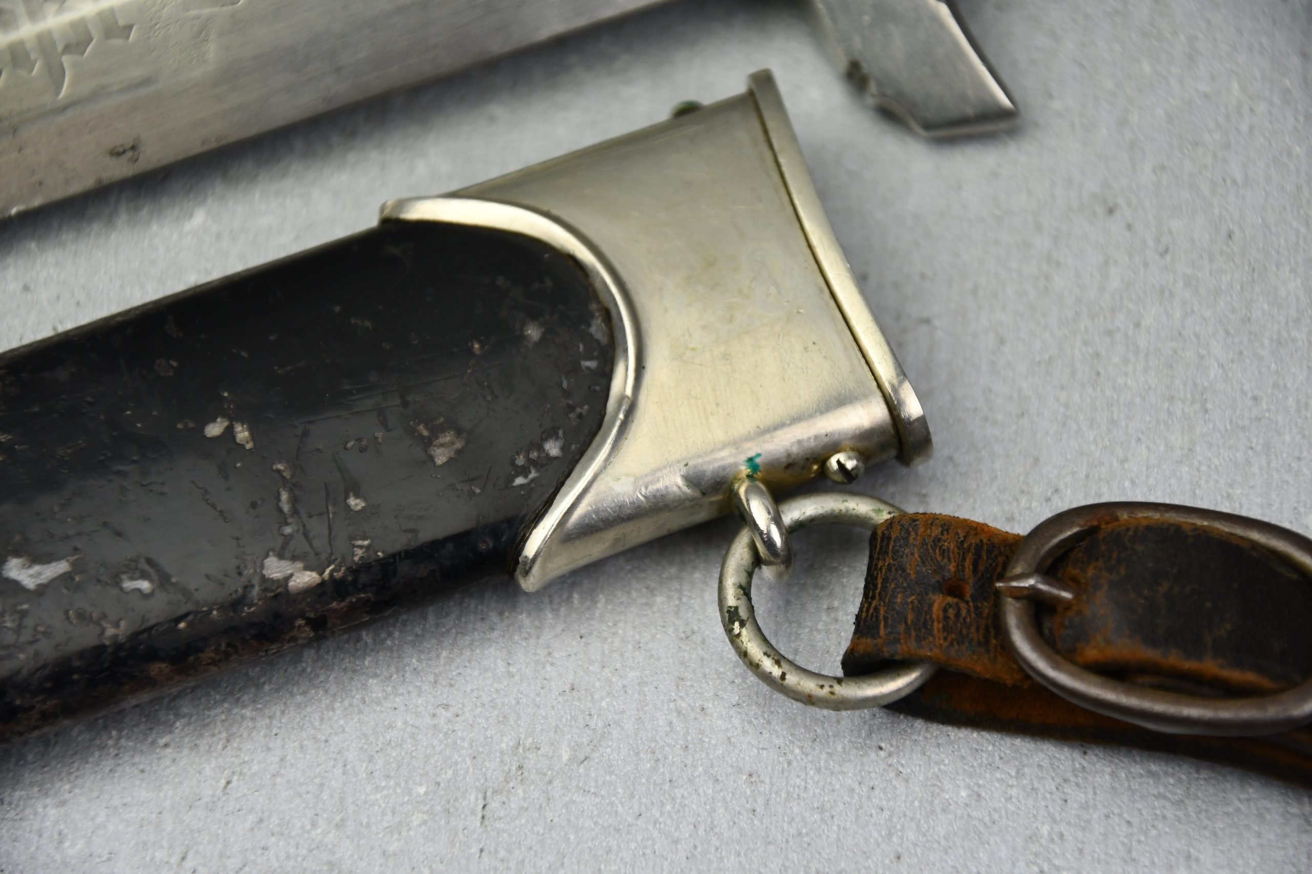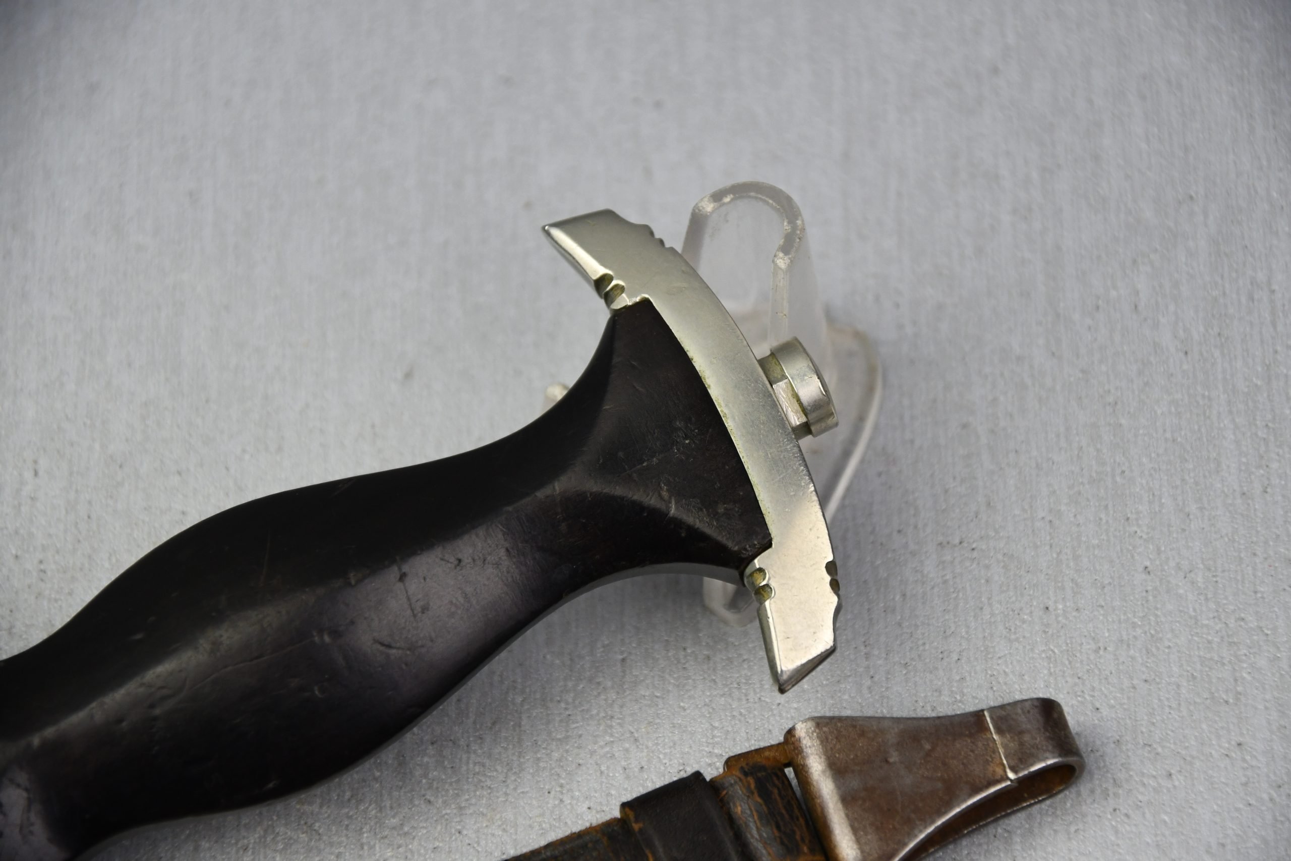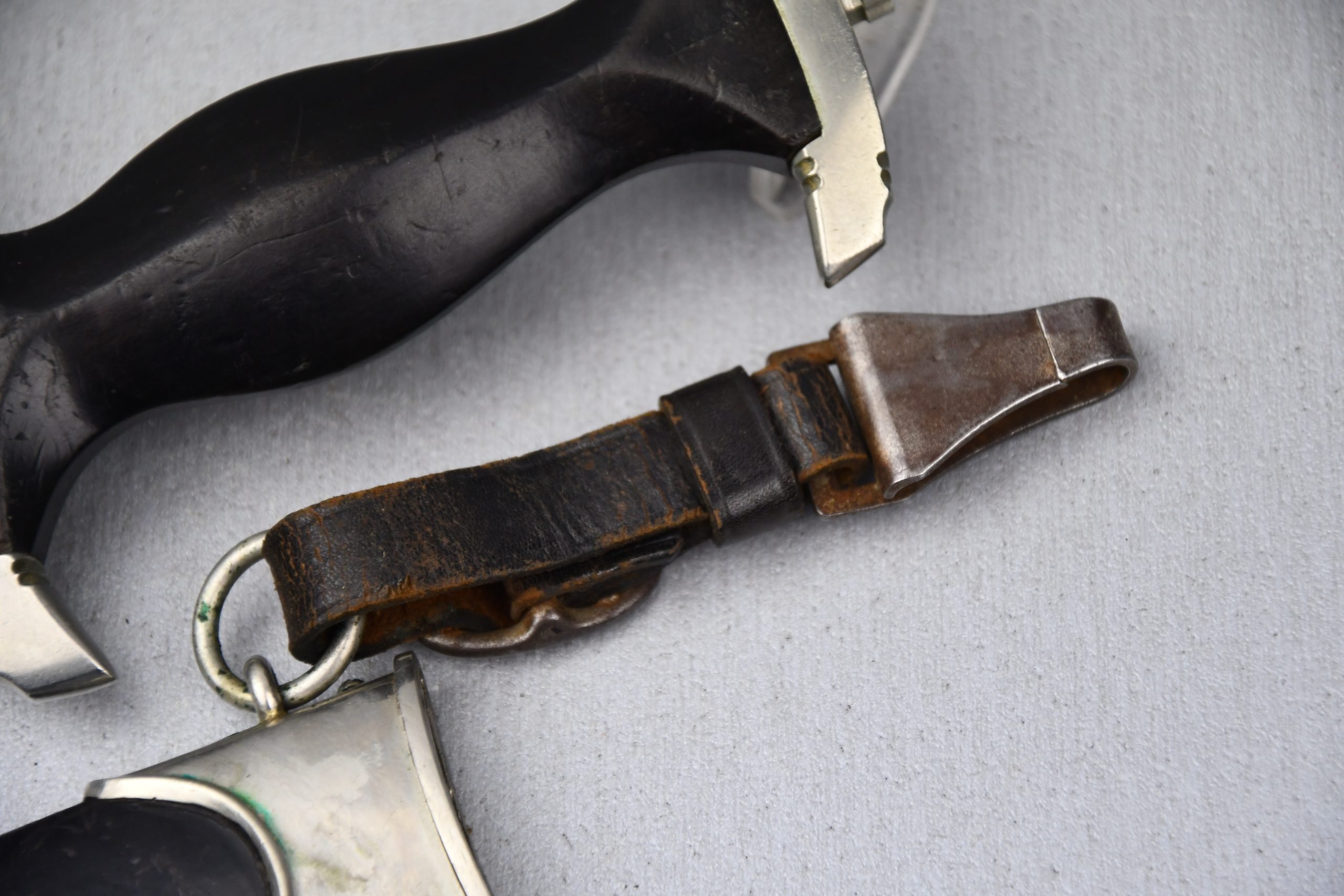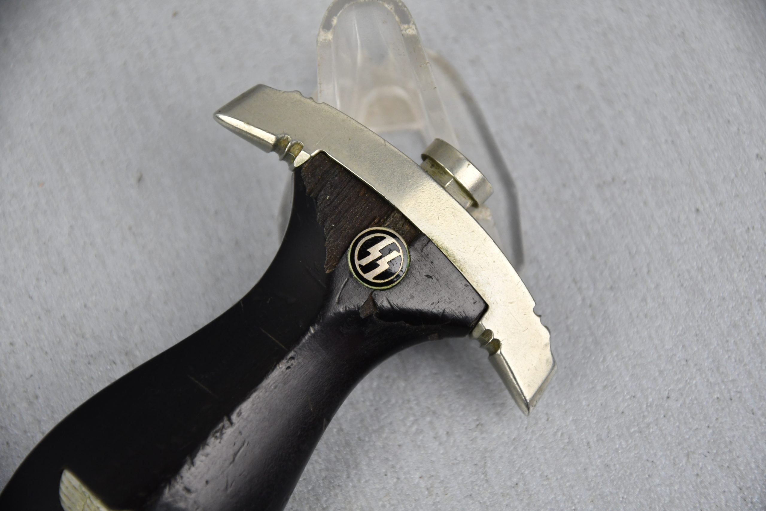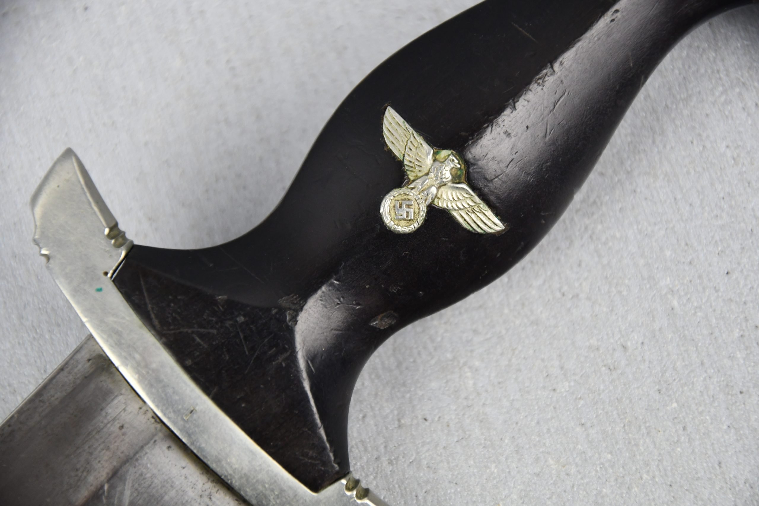 Untouched M33 pattern black colored SS dagger in good condition. The SS dagger is an early example with nickel parts and has roman number I on the cross guard. The blade is worn and maker marked by Carl Eickhorn Solingen. The front of the blade shows the SS motto Meine Ehre heist Treue, etched on it. The best thing is of course te dedication engraved with the text; 'Bleib wie Du bist, Dein Ustf. Eckardt 24.12.1935' (Stay as you are, Your SS-Untersturmfรผhrer Eckardt 24.12.1935), wich must have been a Christman present based on the date. Comes with its original black leather hanger, maker marked RZM M5/71 OLC. The bottom of the crossguard shows the SS soldier's ID number as well, could be a nice research project. Solid early SS dagger with no remarks, a true investment piece that looks great!SHIPPING ONLY IN MAINLAND EUROPE โ COULD BRING THIS TO USA WHEN I FLY OVER