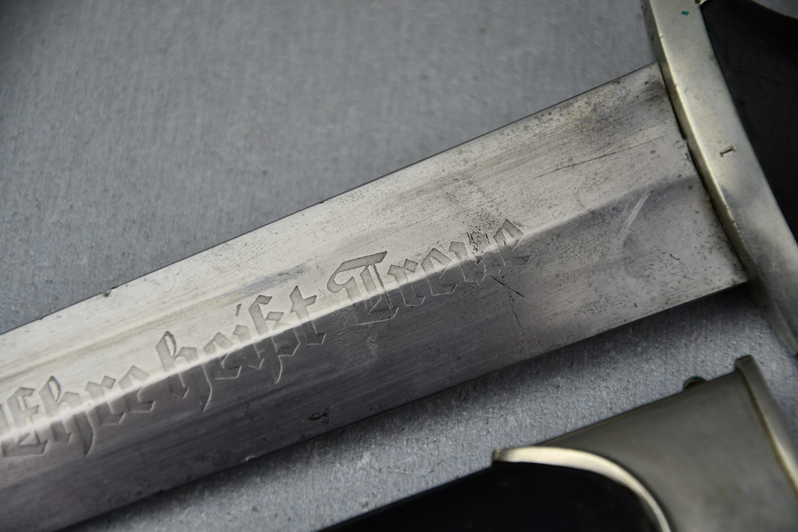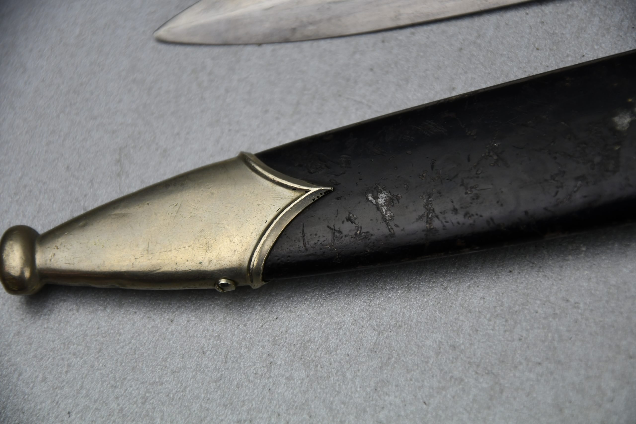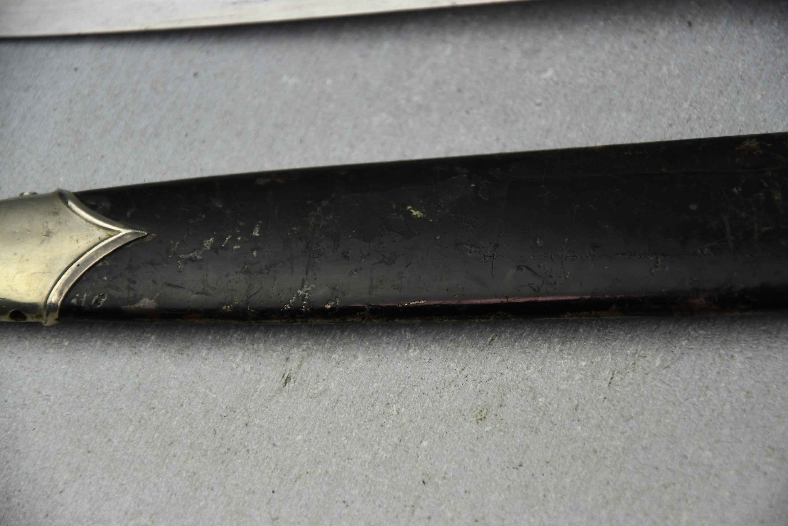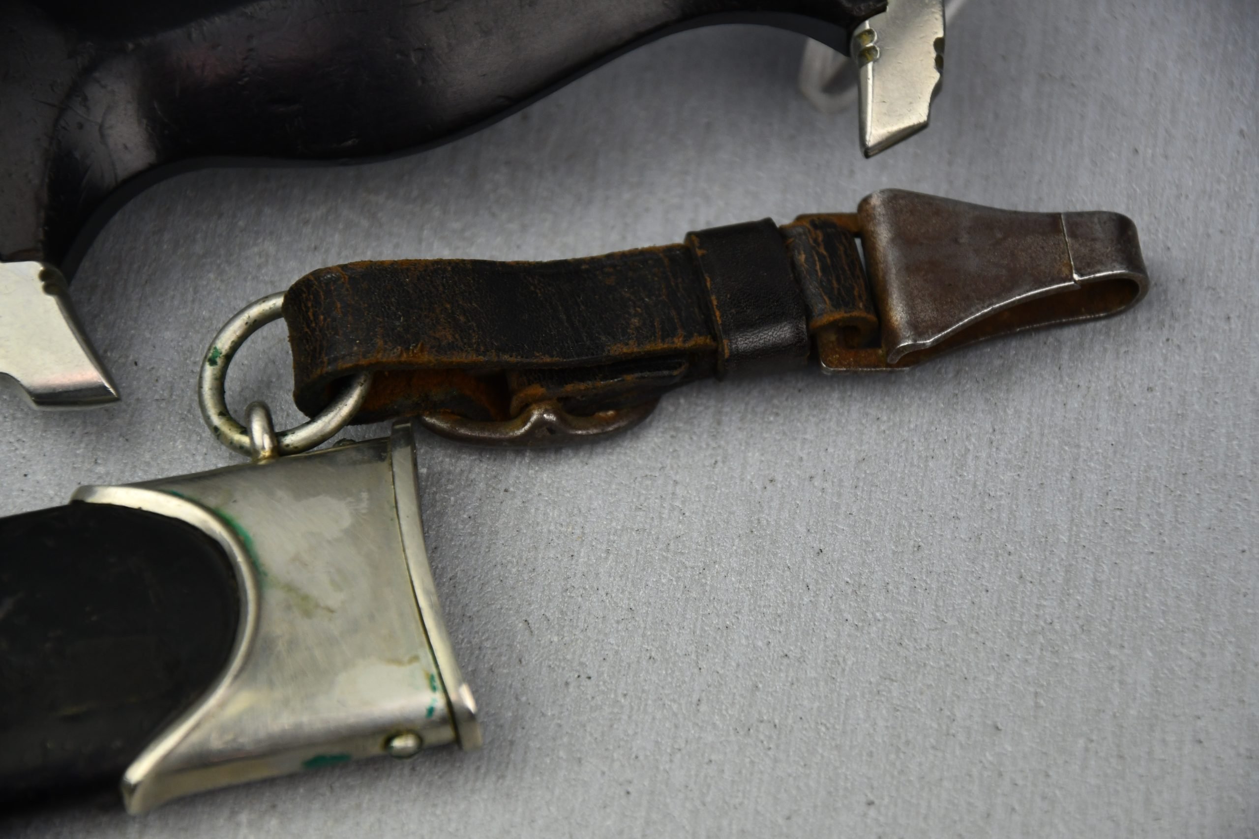 Untouched M33 pattern black colored SS dagger in good condition. The SS dagger is an early example with nickel parts and has roman number I on the cross guard. The blade is worn and maker marked by Carl Eickhorn Solingen. The front of the blade shows the SS motto Meine Ehre heist Treue, etched on it. The best thing is of course te dedication engraved with the text; 'Bleib wie Du bist, Dein Ustf. Eckardt 24.12.1935' (Stay as you are, Your SS-Untersturmfรผhrer Eckardt 24.12.1935), wich must have been a Christman present based on the date. Comes with its original black leather hanger, maker marked RZM M5/71 OLC. The bottom of the crossguard shows the SS soldier's ID number as well, could be a nice research project. Solid early SS dagger with no remarks, a true investment piece that looks great!SHIPPING ONLY IN MAINLAND EUROPE โ COULD BRING THIS TO USA WHEN I FLY OVER