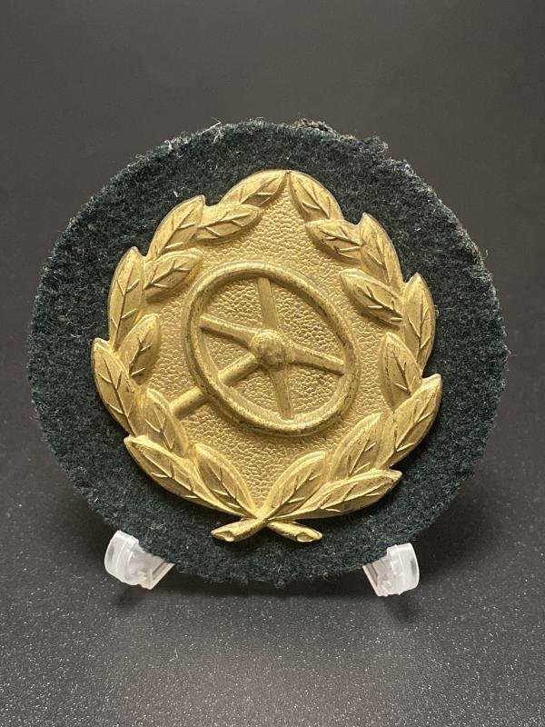 Original Unissued Drivers badge in Gold as worn early war by the German army. Zinc badge with gold finish, with rear plate on bottle green wool. In good condition.