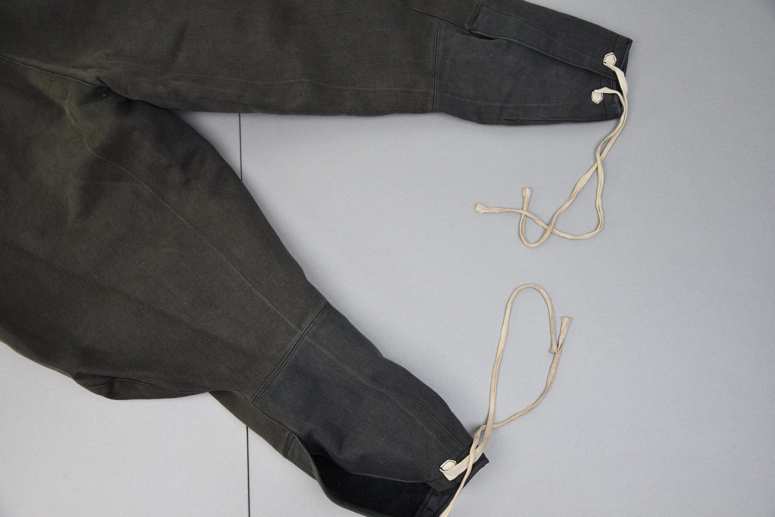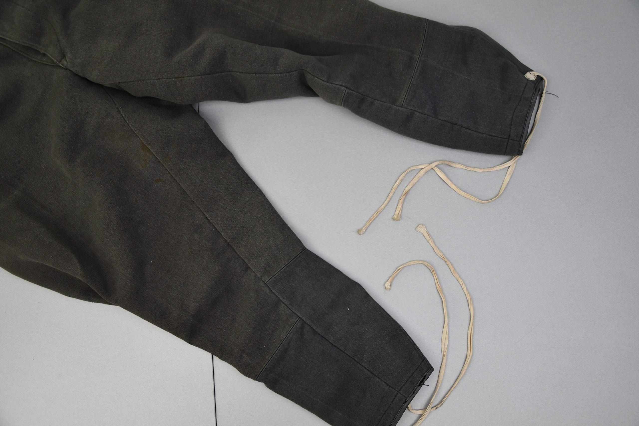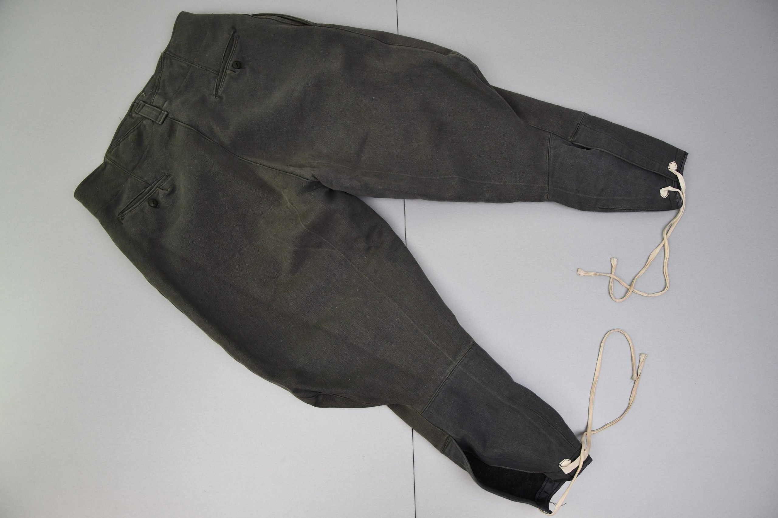 Waffen-SS Gabardine Officer's Breeches (Stiefelhose fΓΌr Offiziere). Made of high quality Italian gabardine. Typical German-style ankle ties original and full length. The breeches are in very good condition, showing only some minor damages from wear. Liner made out of classic SS-style hbt lining materal. Nice and hard to find original pair of Waffen-SS breeches in very good condition!