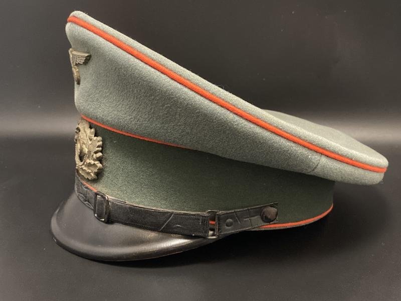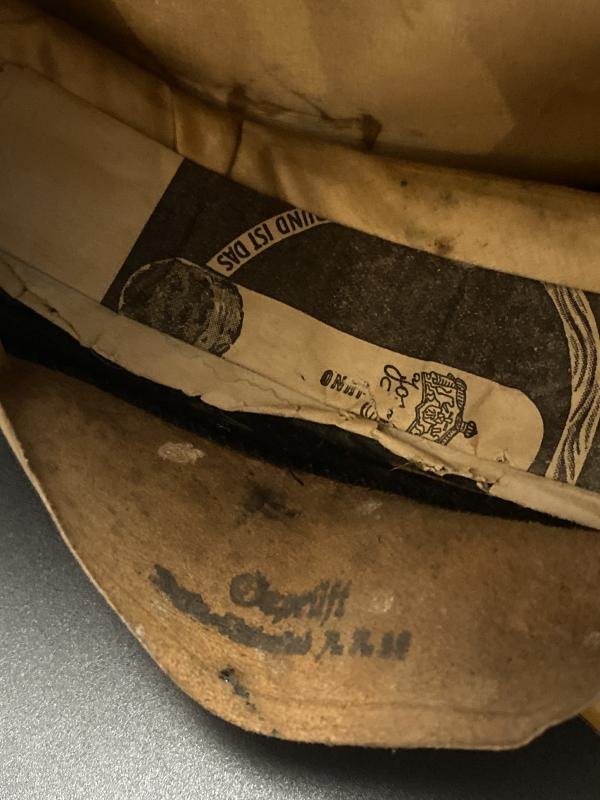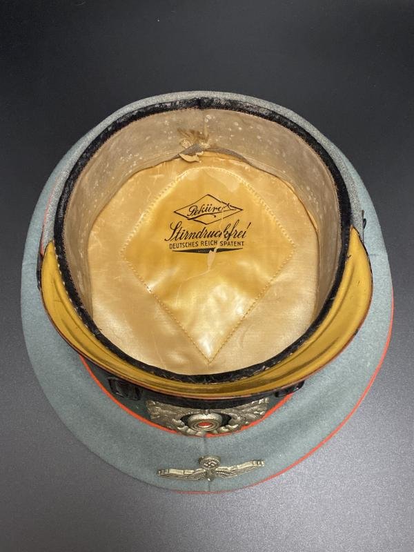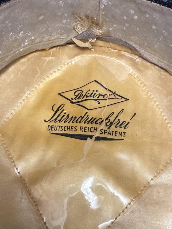 Original German army pre war produced Peküro Artillery NCO visor cap. High quality piece made by Peküro, probably only second to Erel in terms of quality. Nickel plated insignia present with early cockade. Cap is without moth nips and complete with its original chinstrap. Slight damage to the celluloid inside the cap. Evidently the cap has seen extensive service with sweat marks present on the sweatband. Original lining in place. Under the sweatband an illegible unit stamp is present. Under the sweatband the cap is packed with newspaper to help shape, this paper dates to 1934. A really nice pre war cap, likely for best dress of a senior NCO.