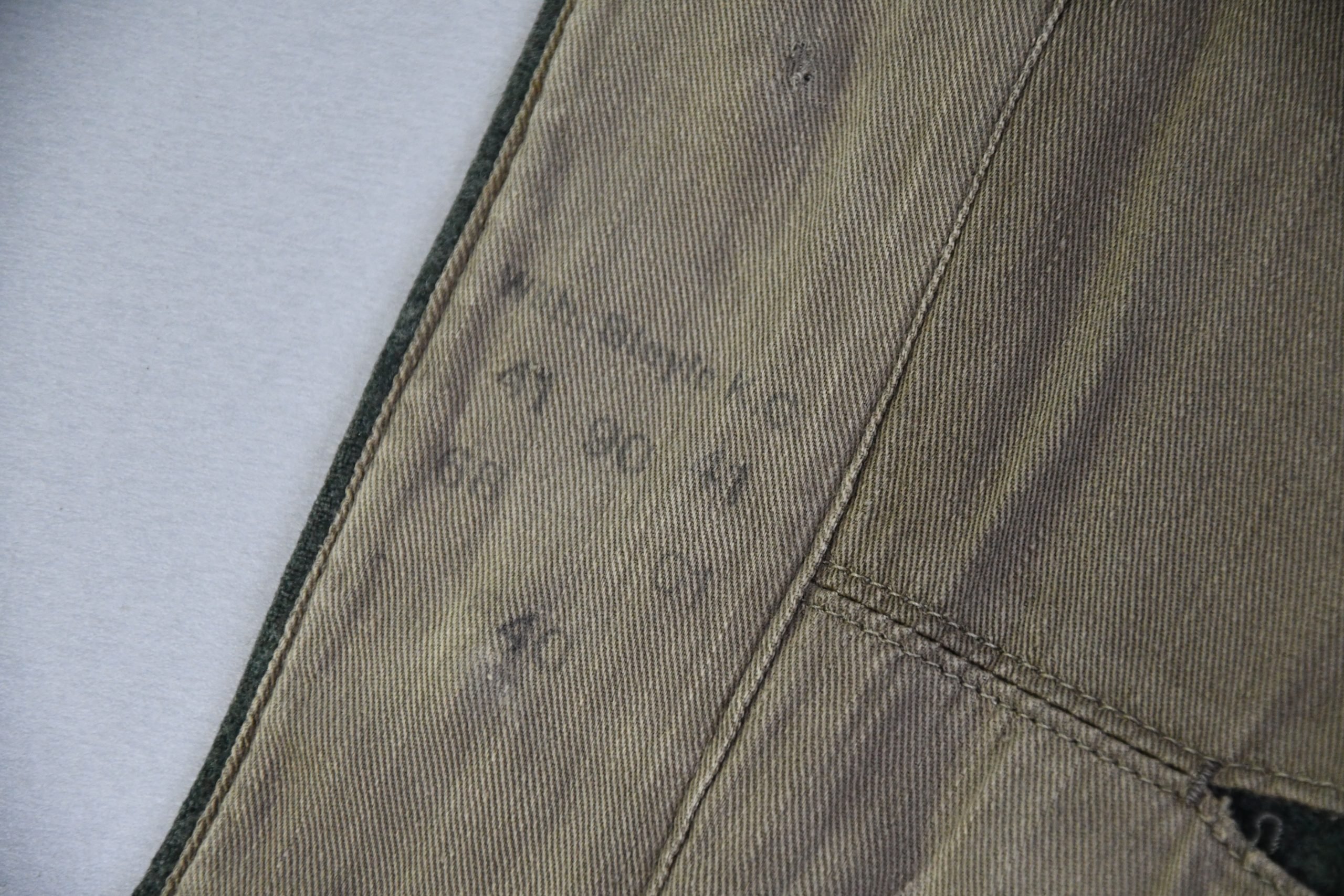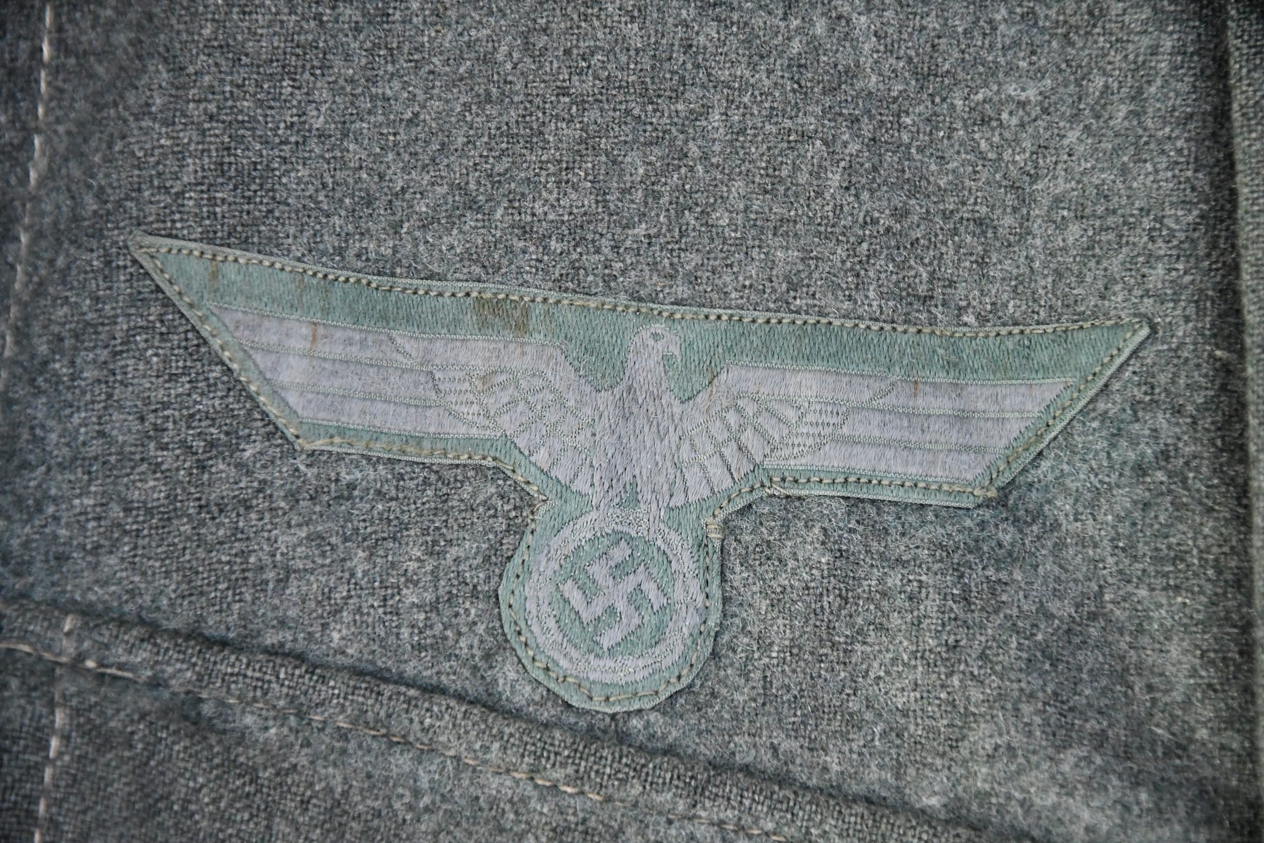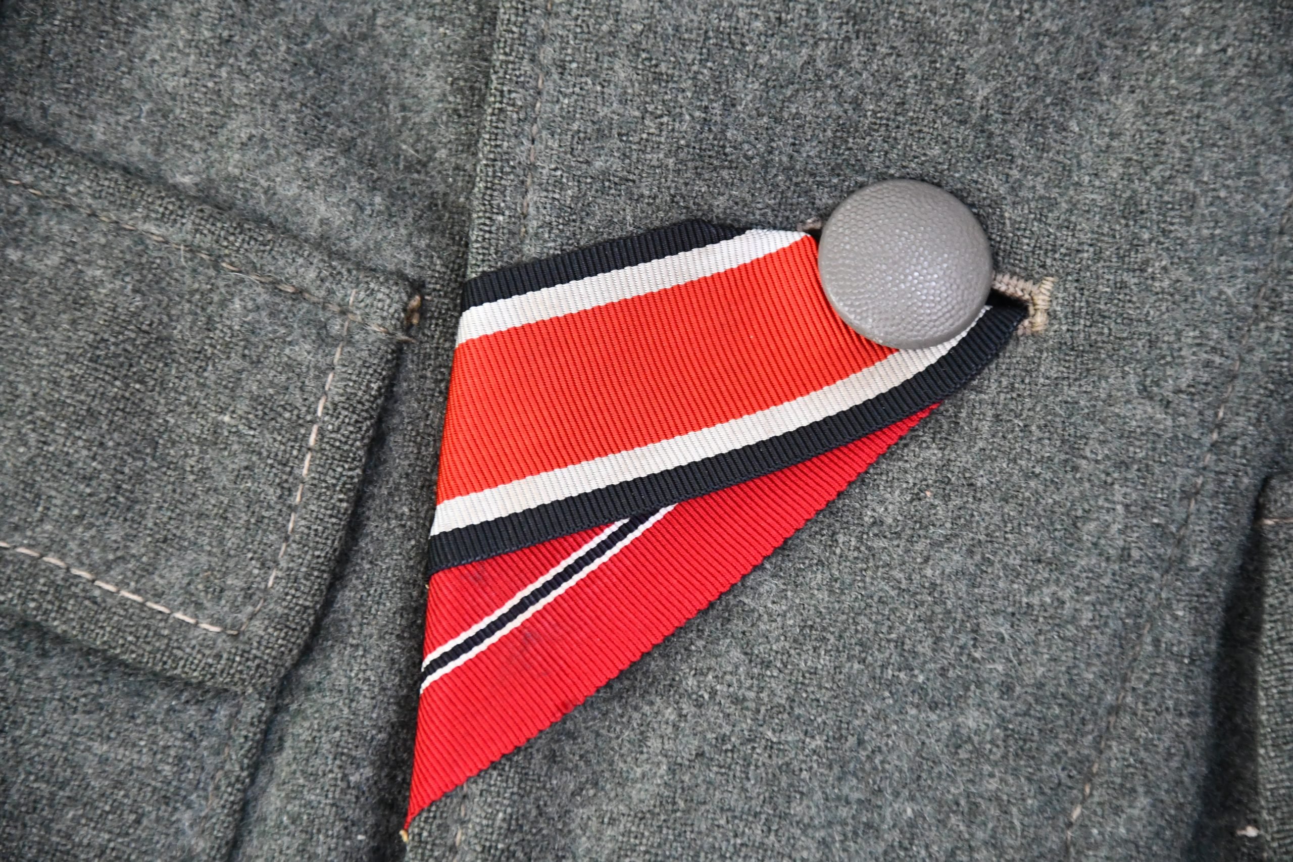 Standard German soldier issue M40 pattern army feldbluse in good condition. Shows normal combat wear and remains void of damage or repairs. Complete with all of its (restored) national insigina; a M40 pattern BeVo breast eagle, machine applied and M40 enlisted collar tabs, hand applied. Great looking cotton liner in very good condition. Maker marked by Wilhelm Bleye K.G. Dated 1940. Normal chest size 90. The tunic has a great mannequin size and would be perfect for nearly any WW2 combat display.
