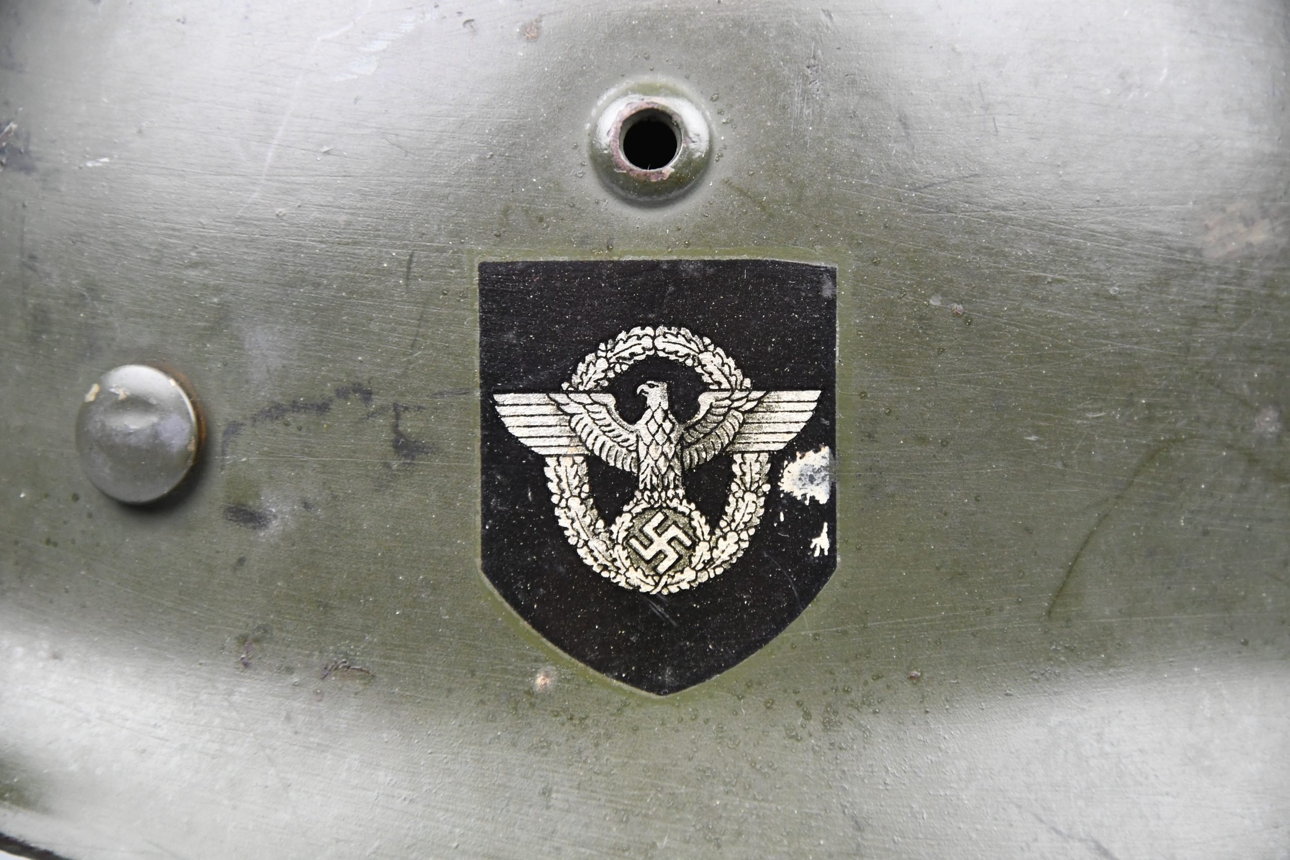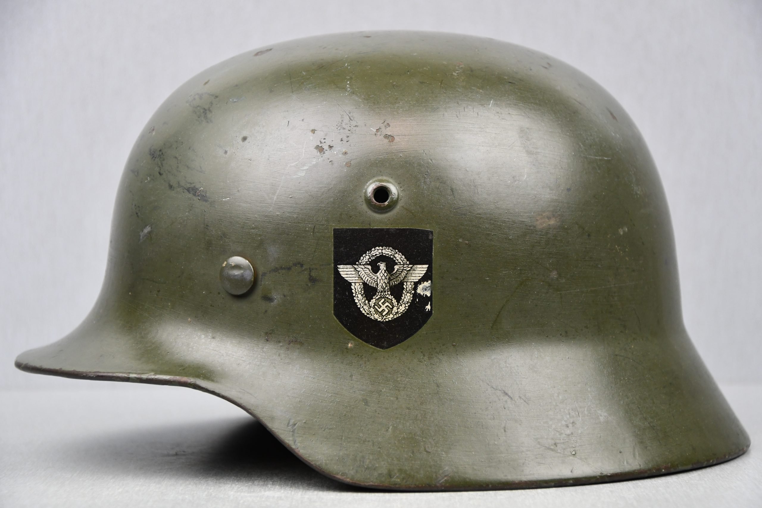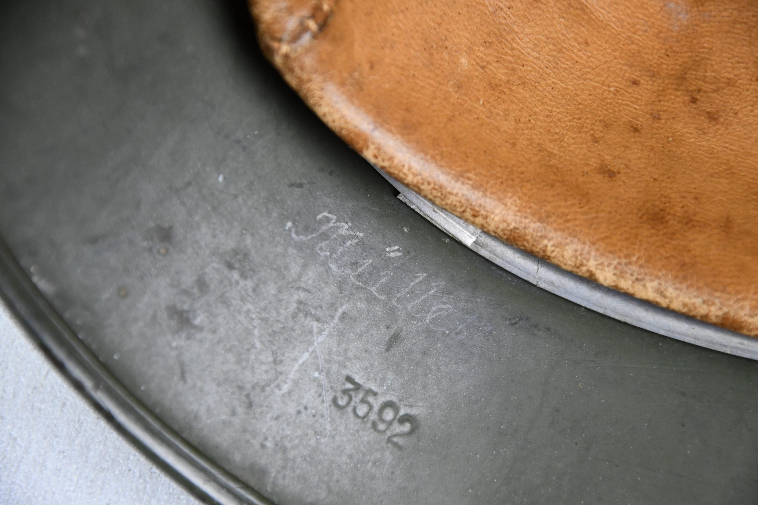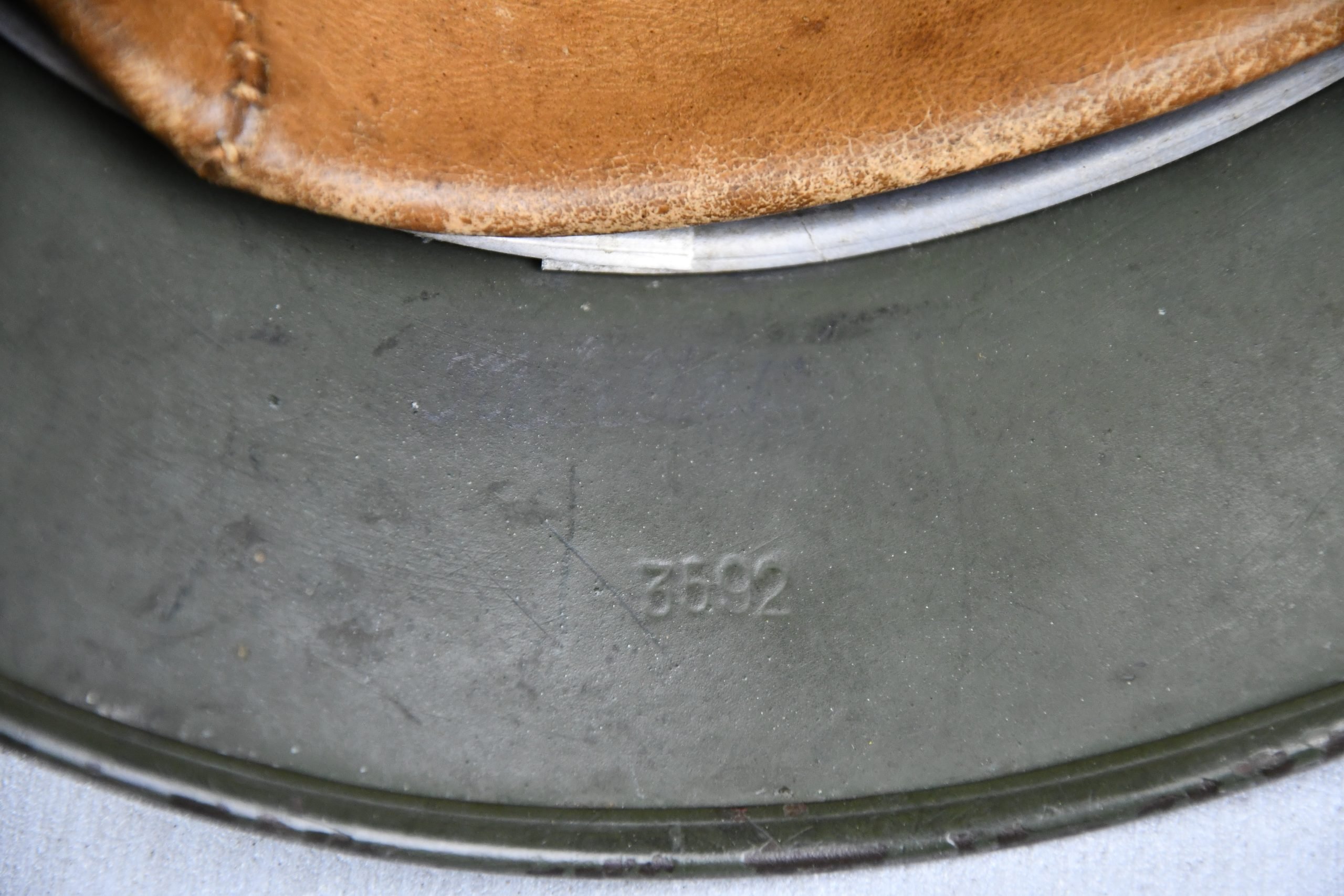 Beautiful nearly mint, minimal worn M35 pattern Police helmet. Double decal example with decals present. Very unusual to find a police helmet made by ET. This helmet has the textbook ET-style decals, not having a silver boarder. Early 1937 single aluminum band dated liner is complete and still feels supple and strong. Draw string is present. Original split pins and washers are present and remain untouched. Great and clear dome stamp visible, dated 1937, just like the liner Maker marked by ET size 62. Lot number 3592. Named multiple times to the police member 'MΓΌller' . A stunning top shelf police helmet β impossible to upgrade!