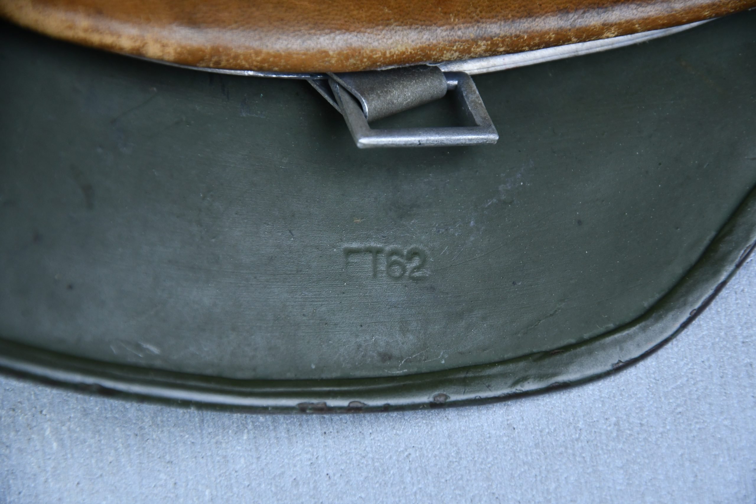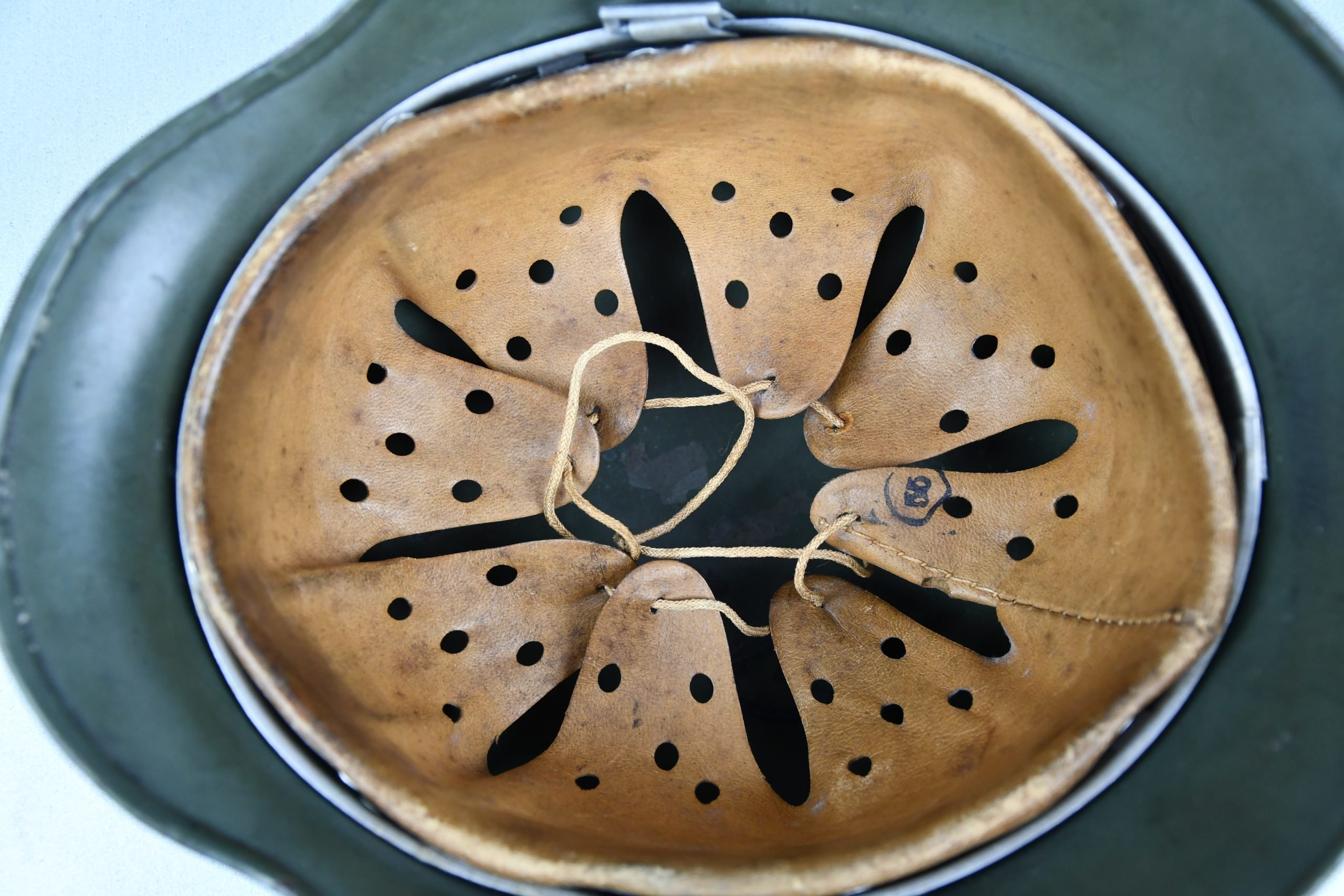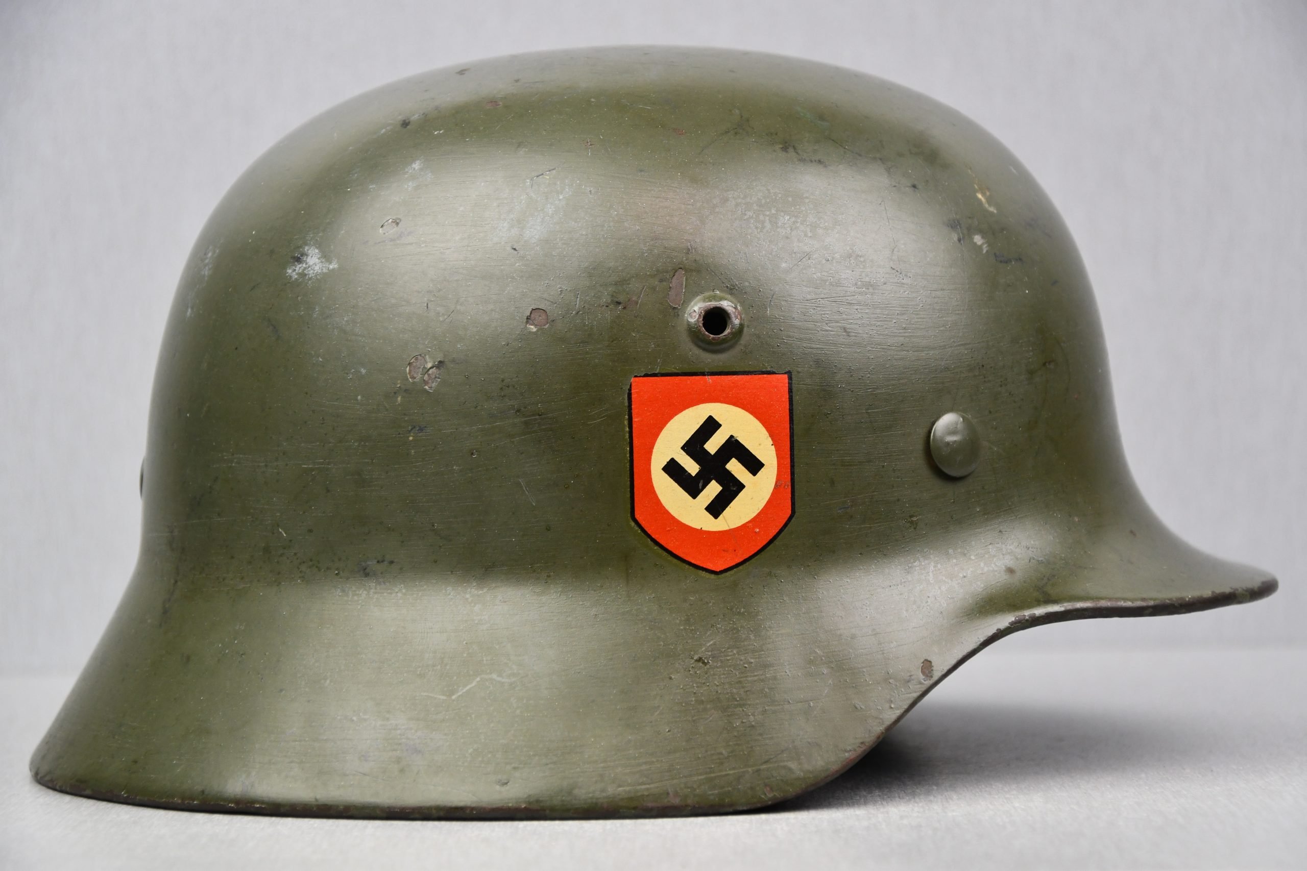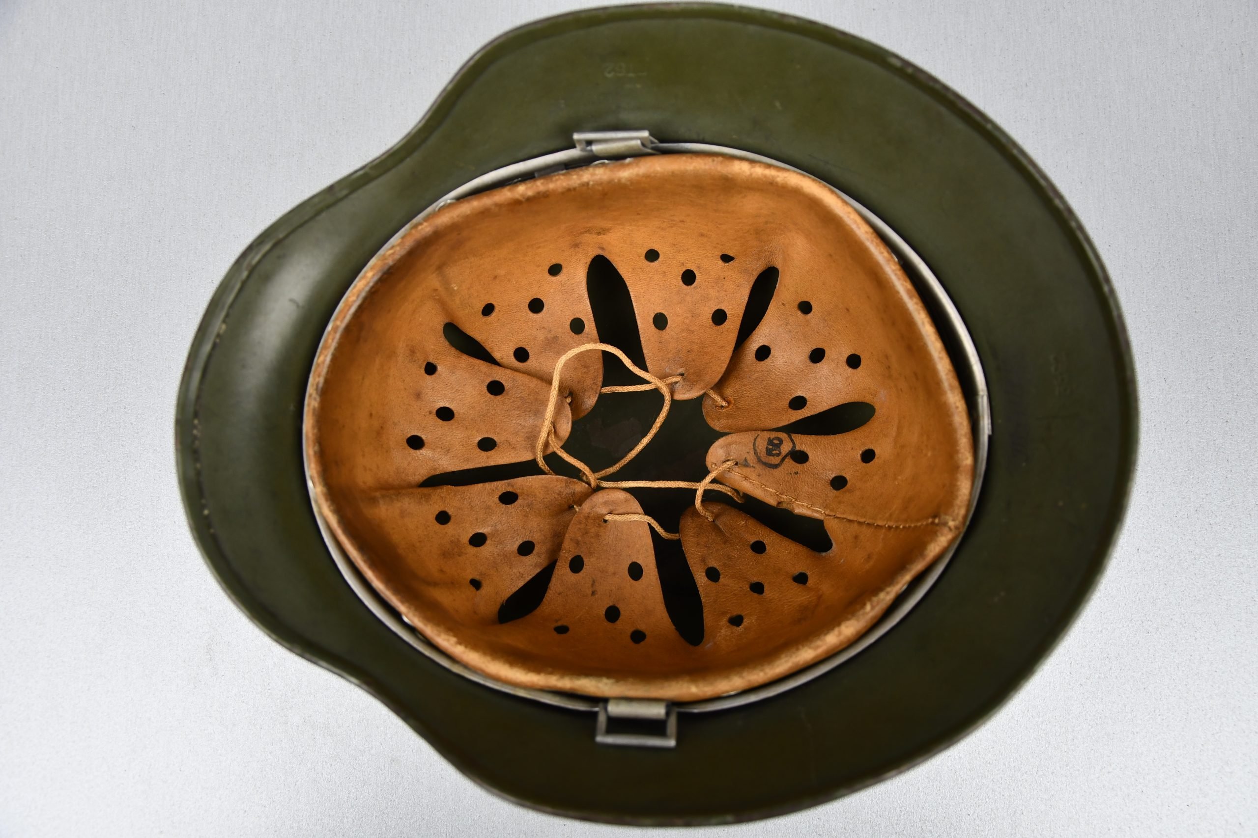 Beautiful nearly mint, minimal worn M35 pattern Police helmet. Double decal example with decals present. Very unusual to find a police helmet made by ET. This helmet has the textbook ET-style decals, not having a silver boarder. Early 1937 single aluminum band dated liner is complete and still feels supple and strong. Draw string is present. Original split pins and washers are present and remain untouched. Great and clear dome stamp visible, dated 1937, just like the liner Maker marked by ET size 62. Lot number 3592. Named multiple times to the police member 'MΓΌller' . A stunning top shelf police helmet β impossible to upgrade!