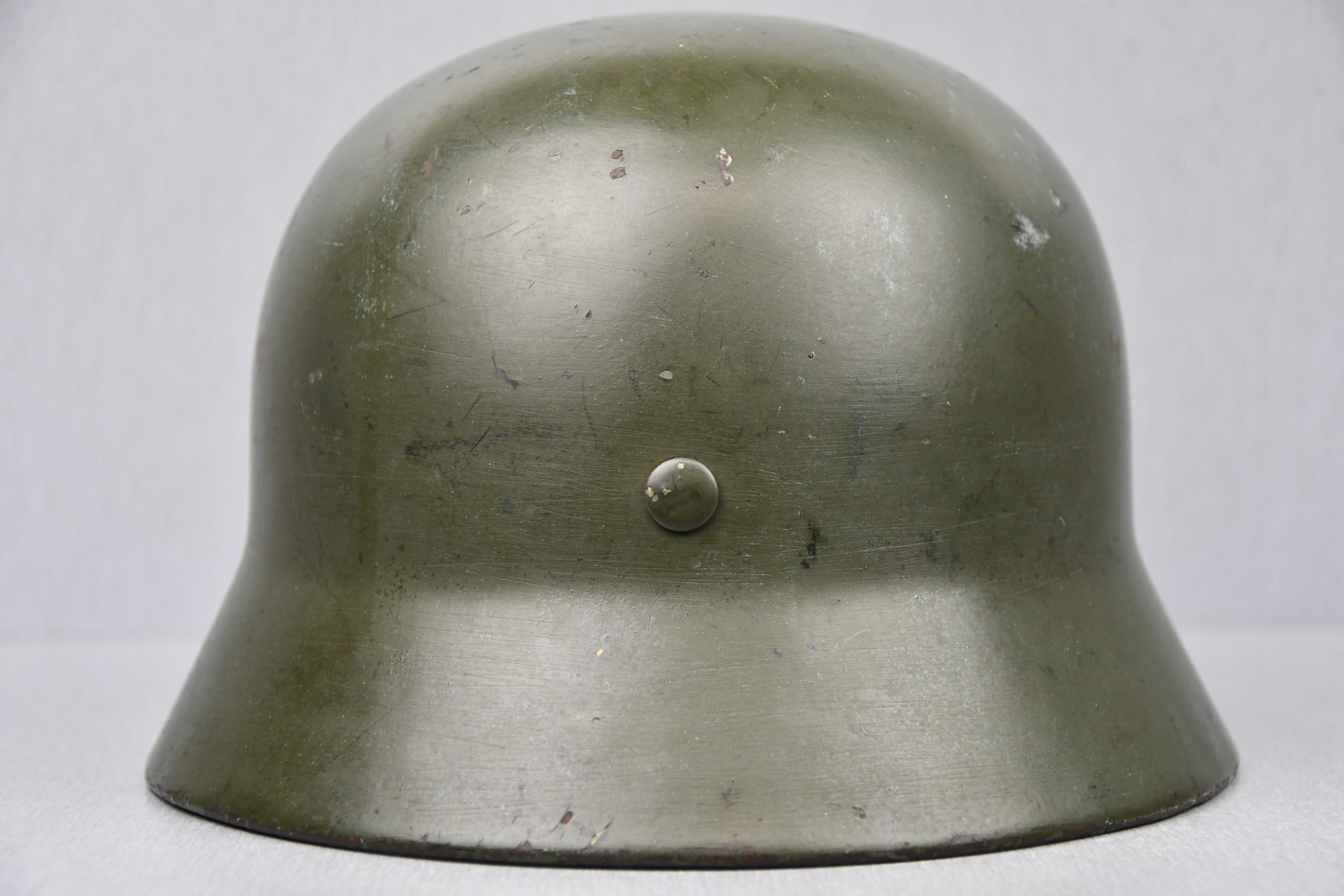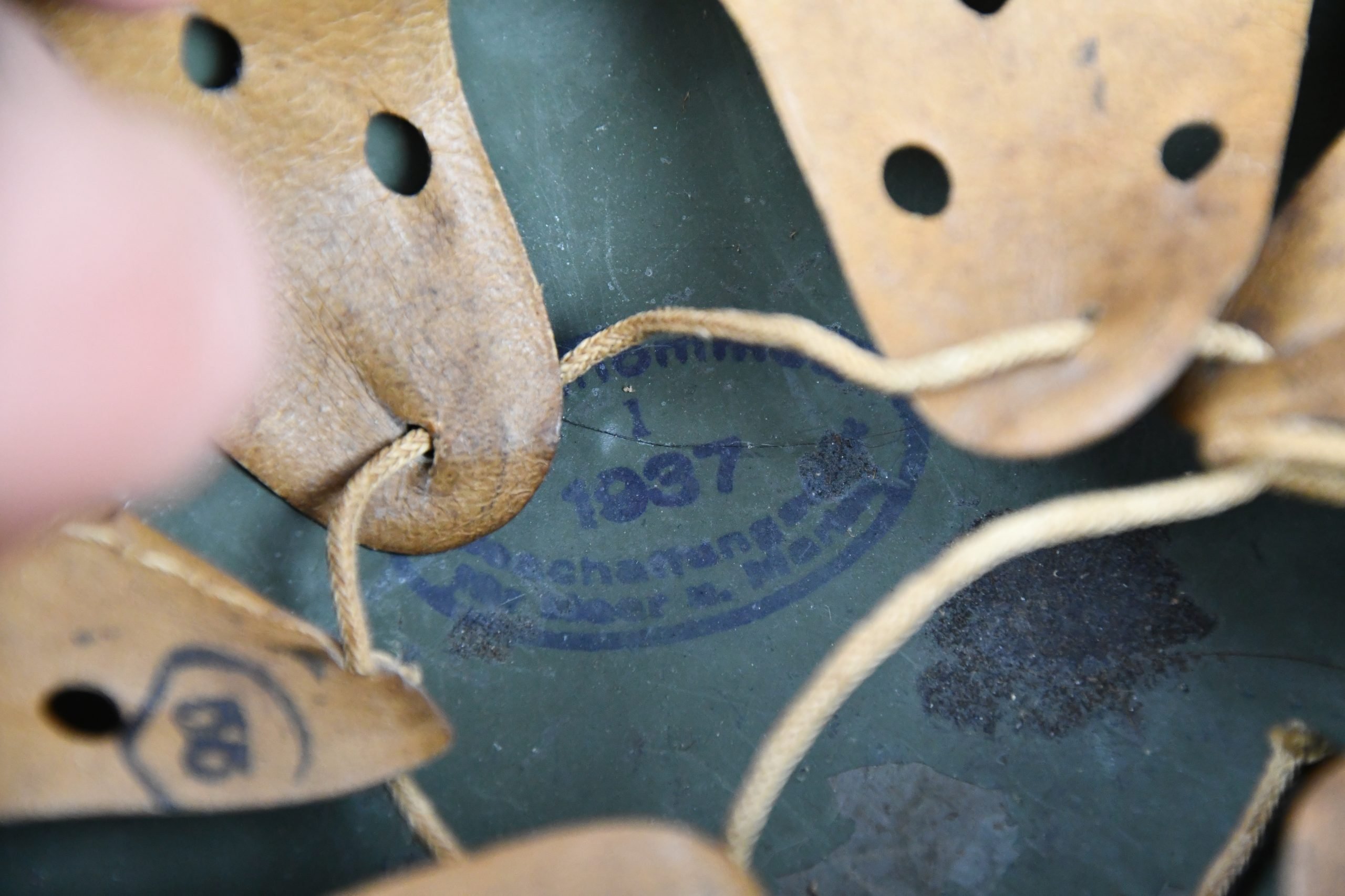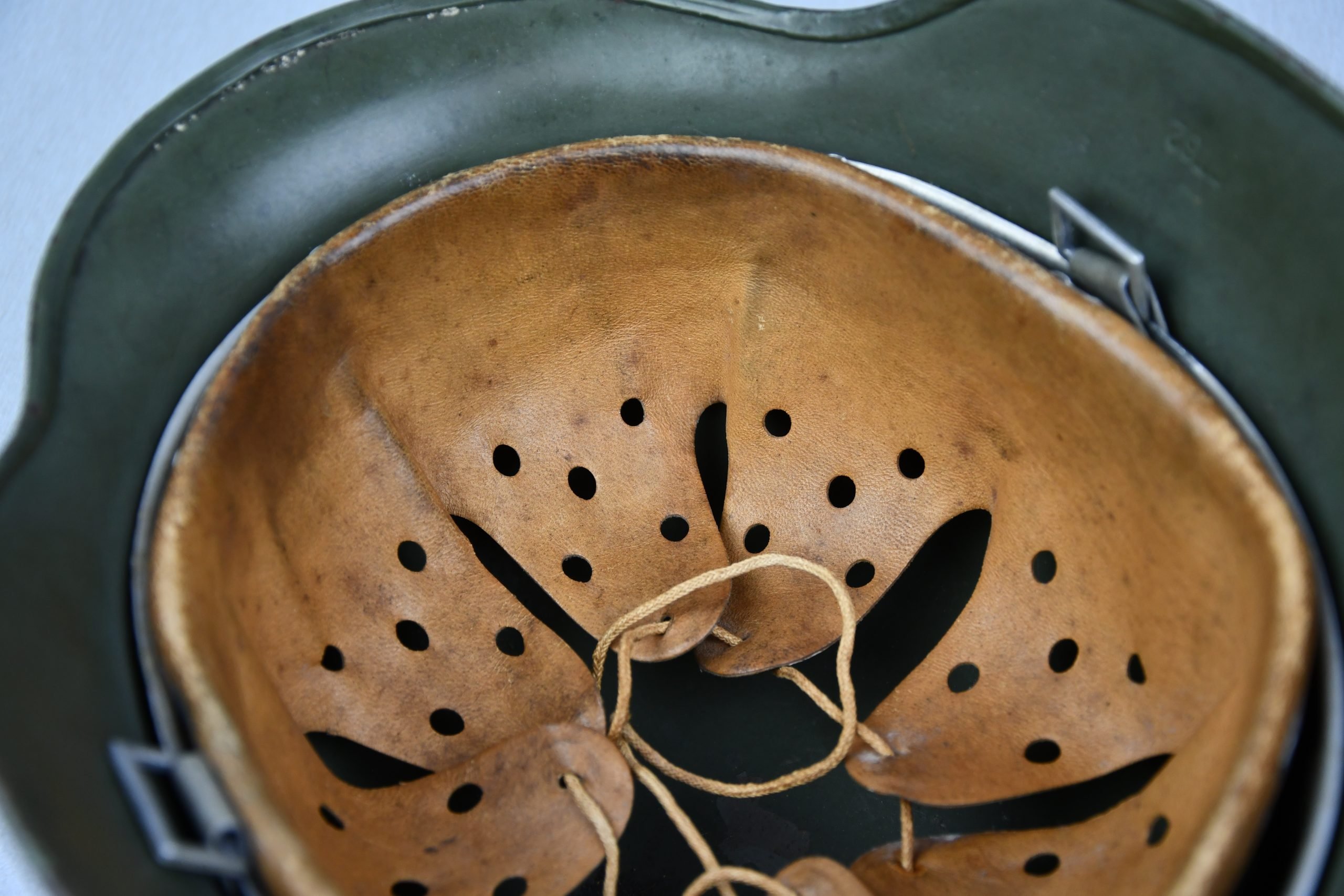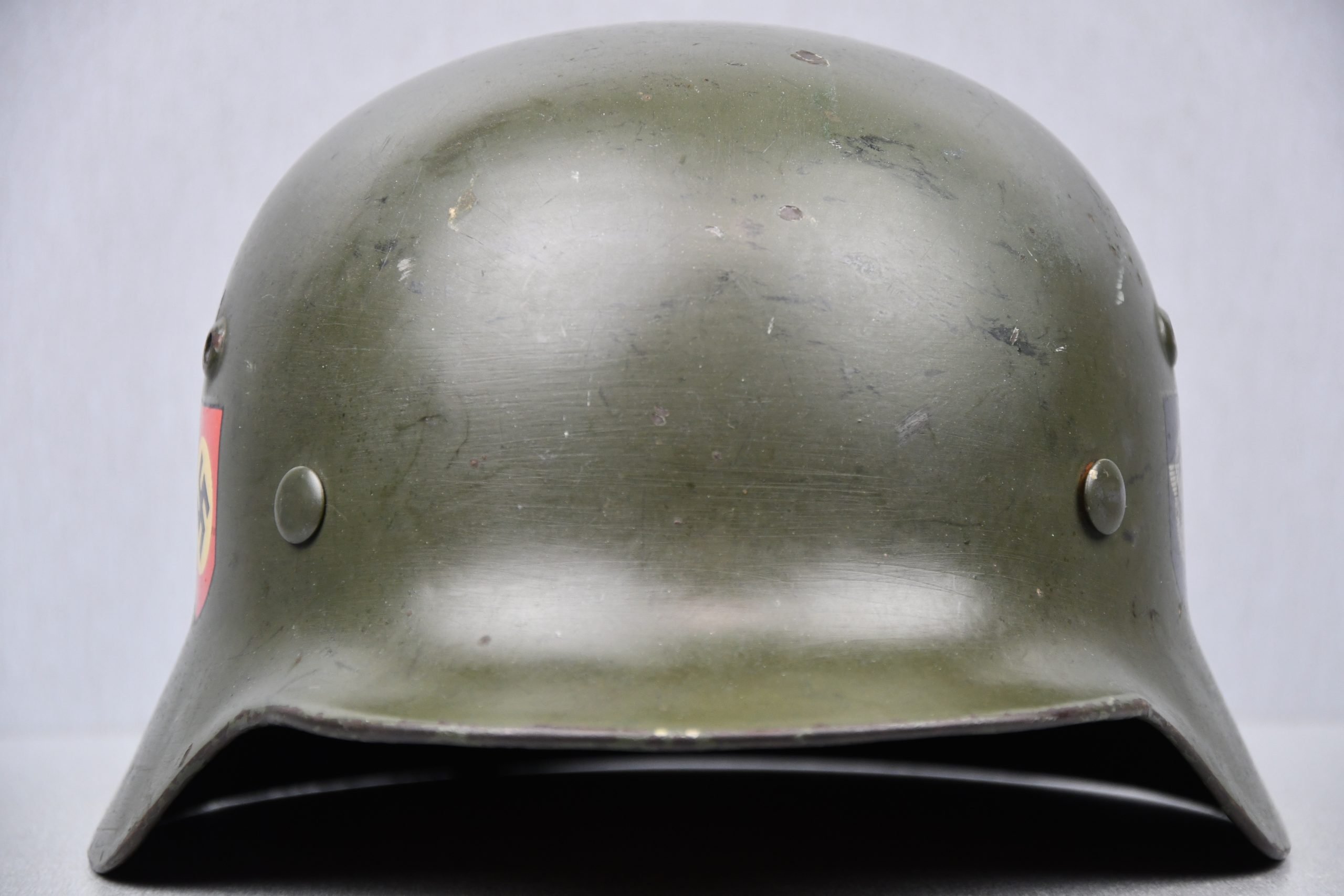 Beautiful nearly mint, minimal worn M35 pattern Police helmet. Double decal example with decals present. Very unusual to find a police helmet made by ET. This helmet has the textbook ET-style decals, not having a silver boarder. Early 1937 single aluminum band dated liner is complete and still feels supple and strong. Draw string is present. Original split pins and washers are present and remain untouched. Great and clear dome stamp visible, dated 1937, just like the liner Maker marked by ET size 62. Lot number 3592. Named multiple times to the police member 'MΓΌller' . A stunning top shelf police helmet β impossible to upgrade!