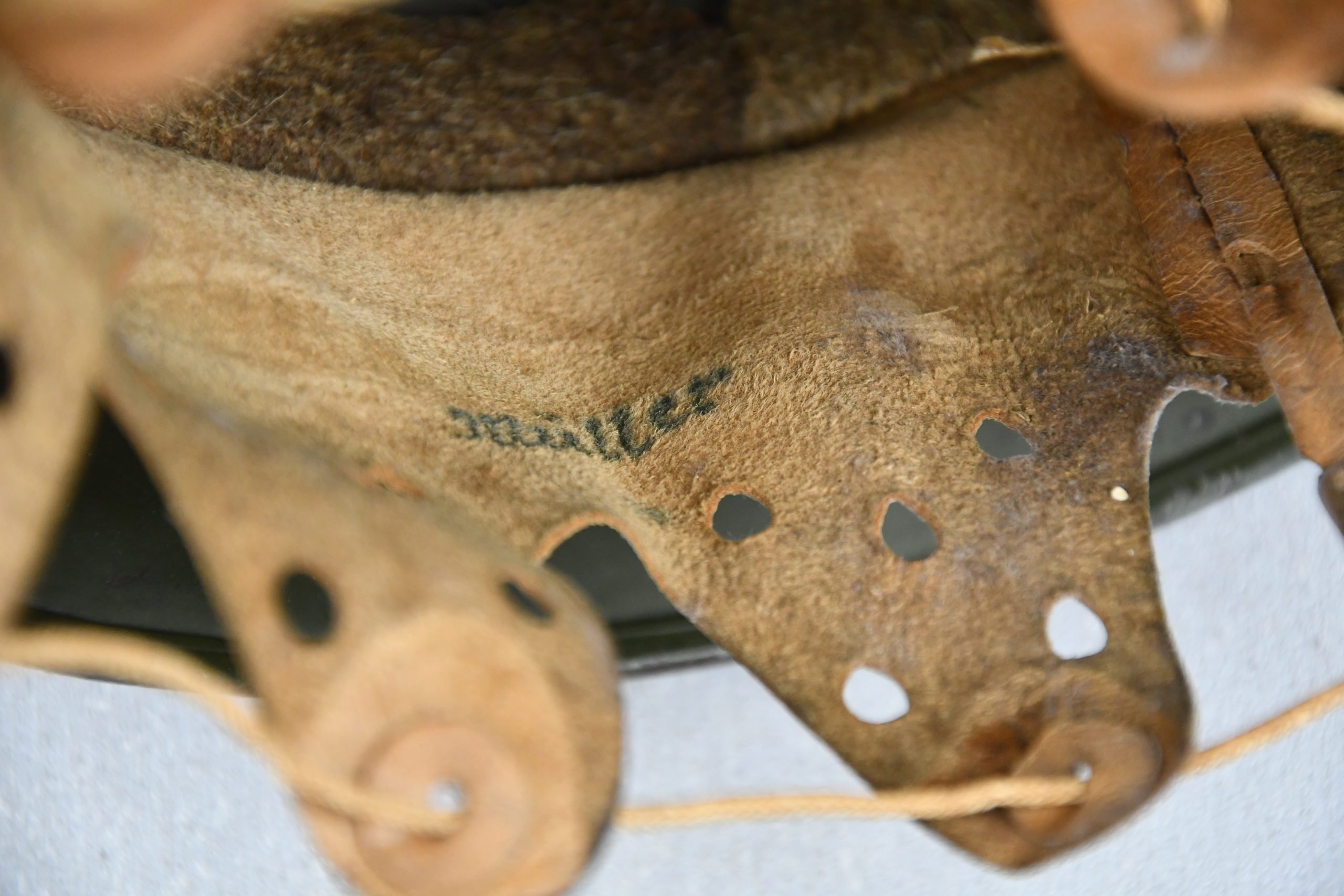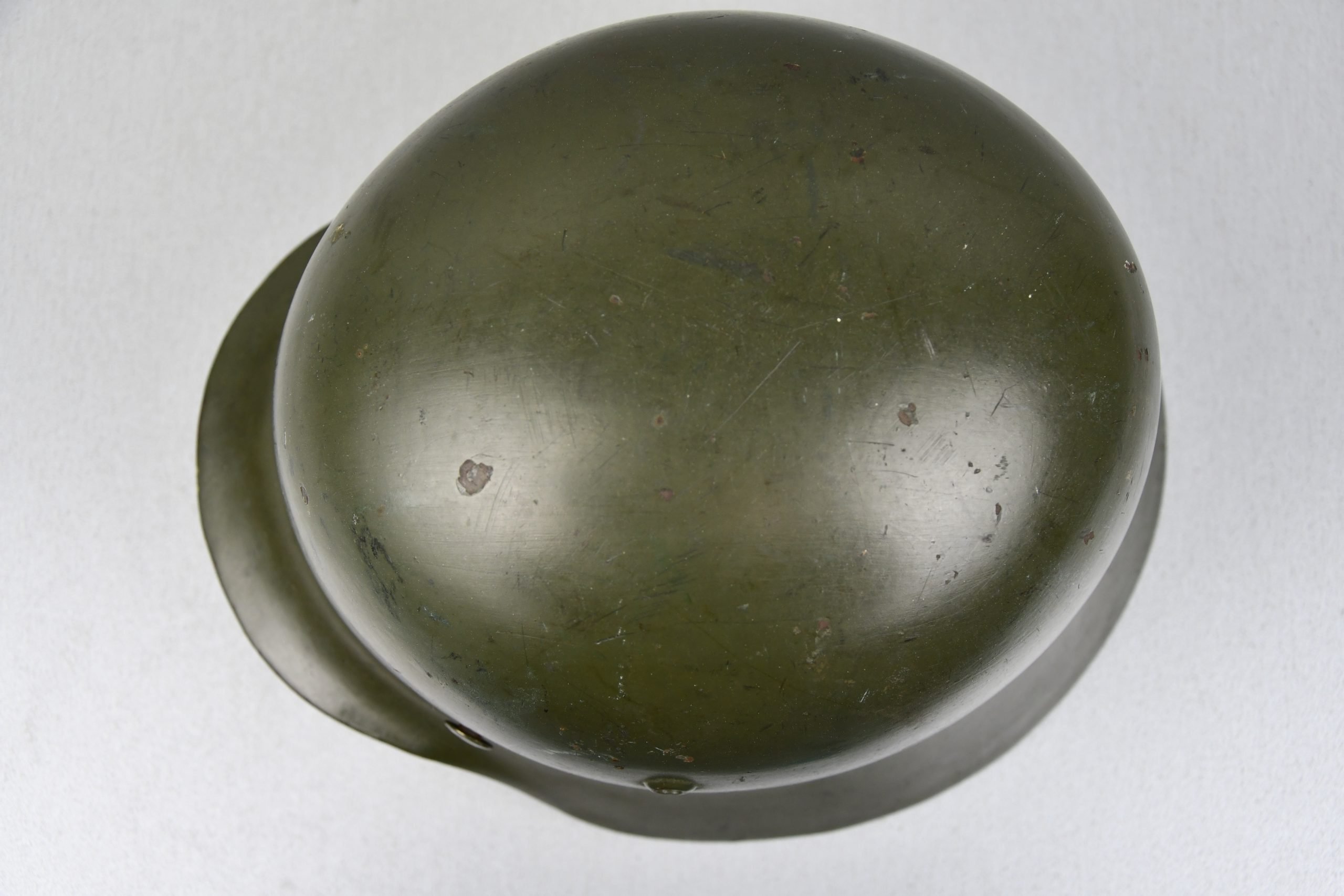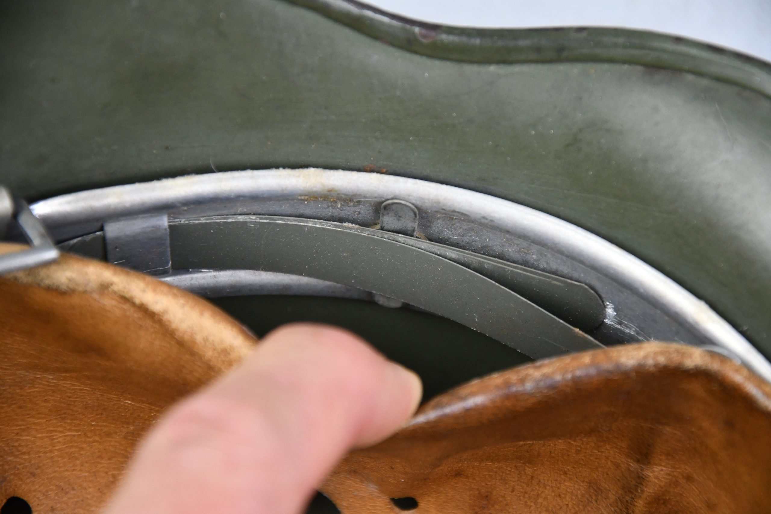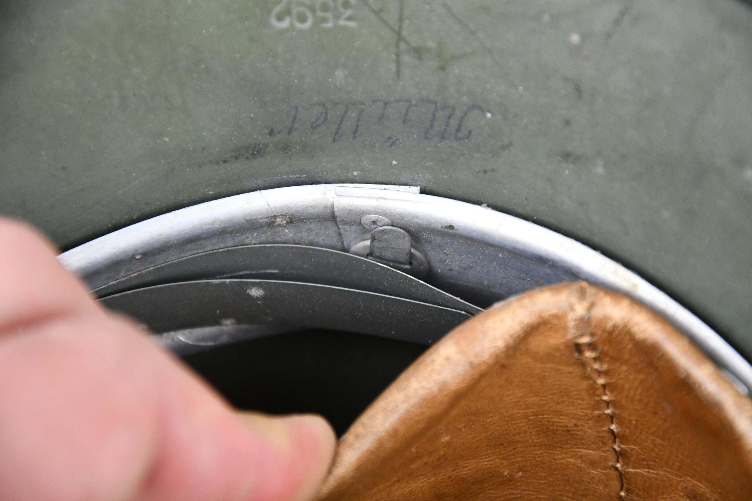 Beautiful nearly mint, minimal worn M35 pattern Police helmet. Double decal example with decals present. Very unusual to find a police helmet made by ET. This helmet has the textbook ET-style decals, not having a silver boarder. Early 1937 single aluminum band dated liner is complete and still feels supple and strong. Draw string is present. Original split pins and washers are present and remain untouched. Great and clear dome stamp visible, dated 1937, just like the liner Maker marked by ET size 62. Lot number 3592. Named multiple times to the police member 'MΓΌller' . A stunning top shelf police helmet β impossible to upgrade!