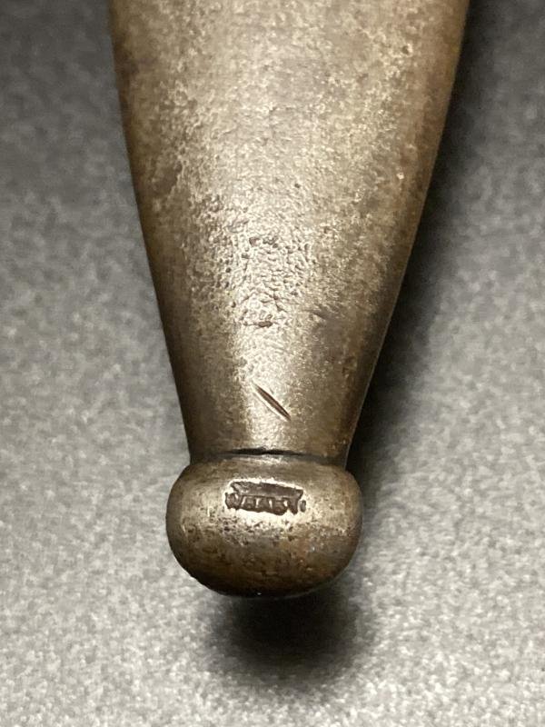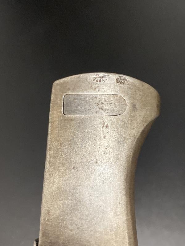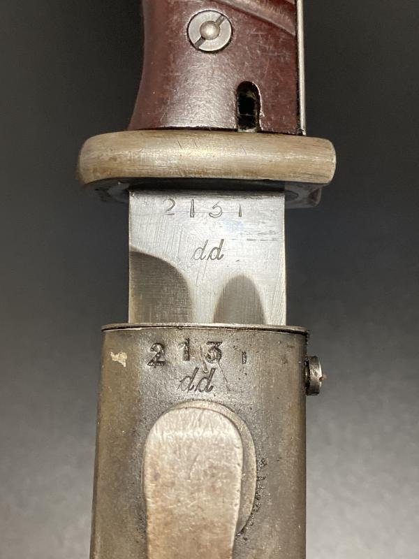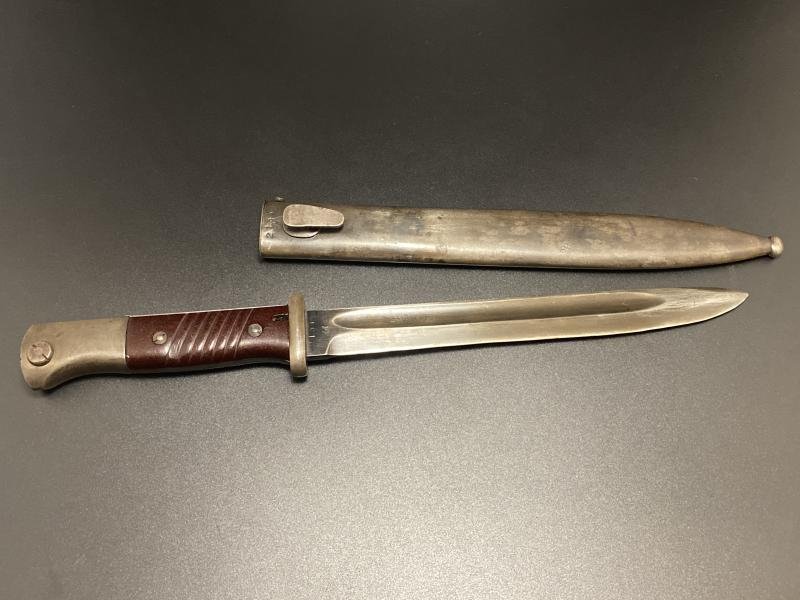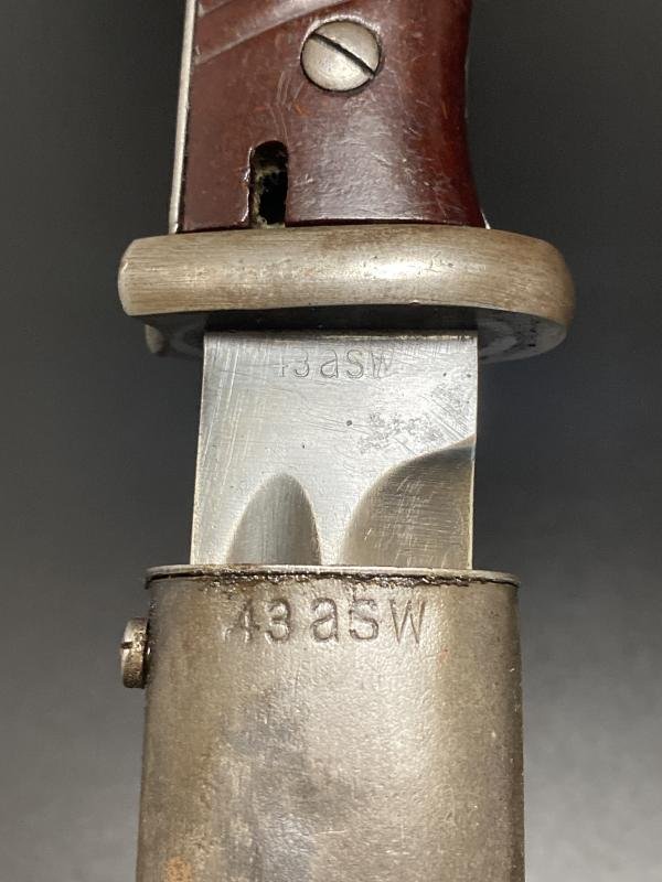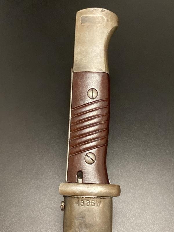 Original WW2 German K98K bayonet marked ASW43 with matching numbers on the blade and scabbard 2131dd. Blade has been very neatly shorted by about one and a half inches. I assume this has been done period. Blade is really clean with majority of the bluing present. Original brown Bakerlite grips present. Waffenamt present on bayonet and scabbard. Priced accordingly due to the shortening of the blade.*Due to the nature of this item, shipping is only permitted to the UK mainland.*