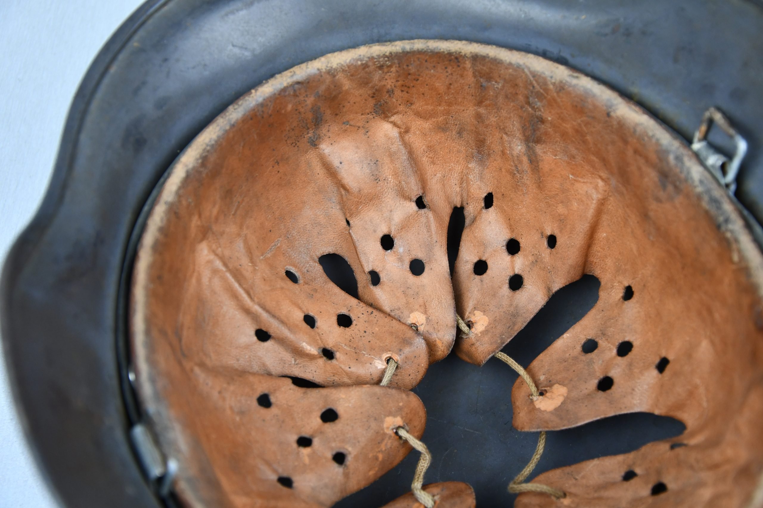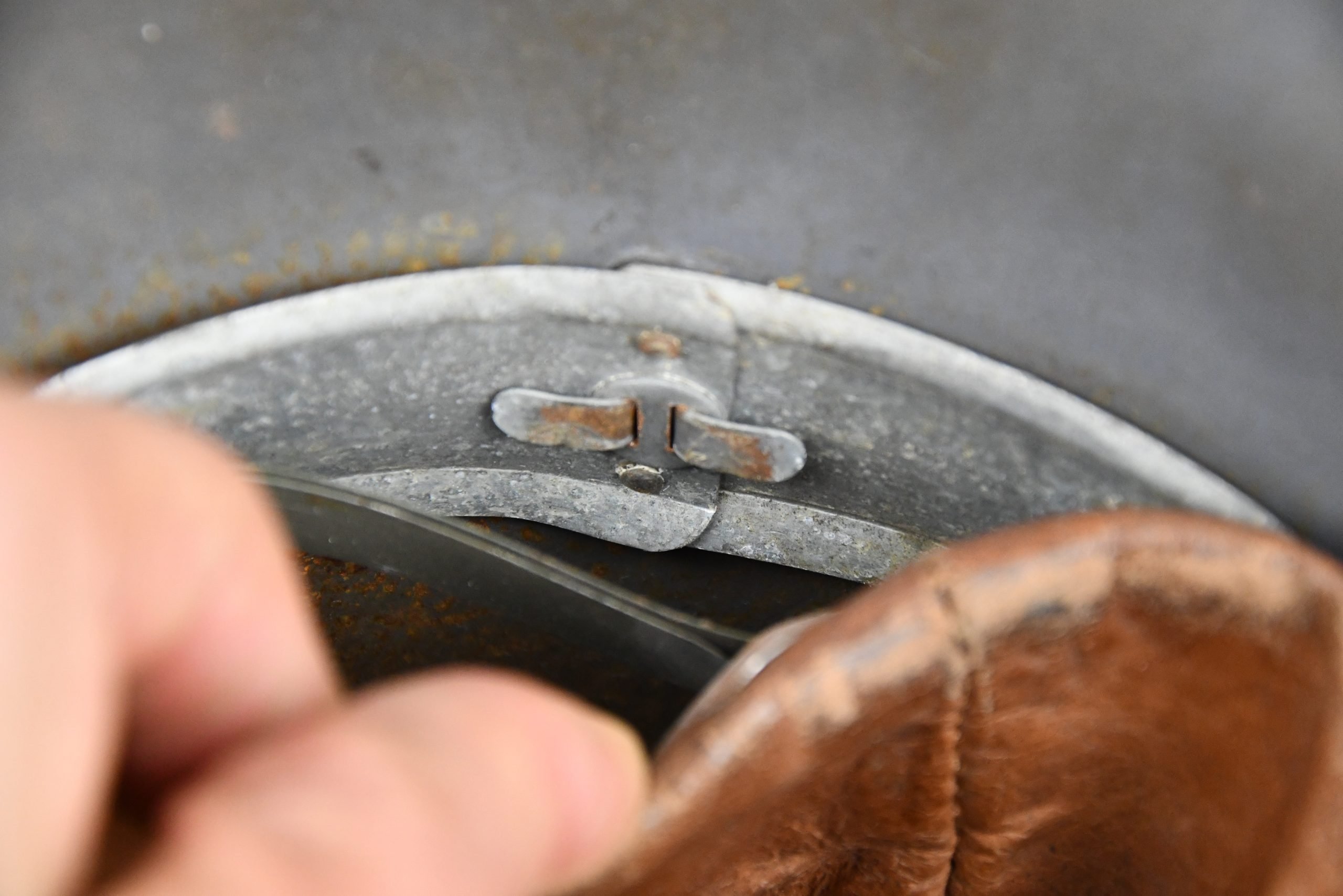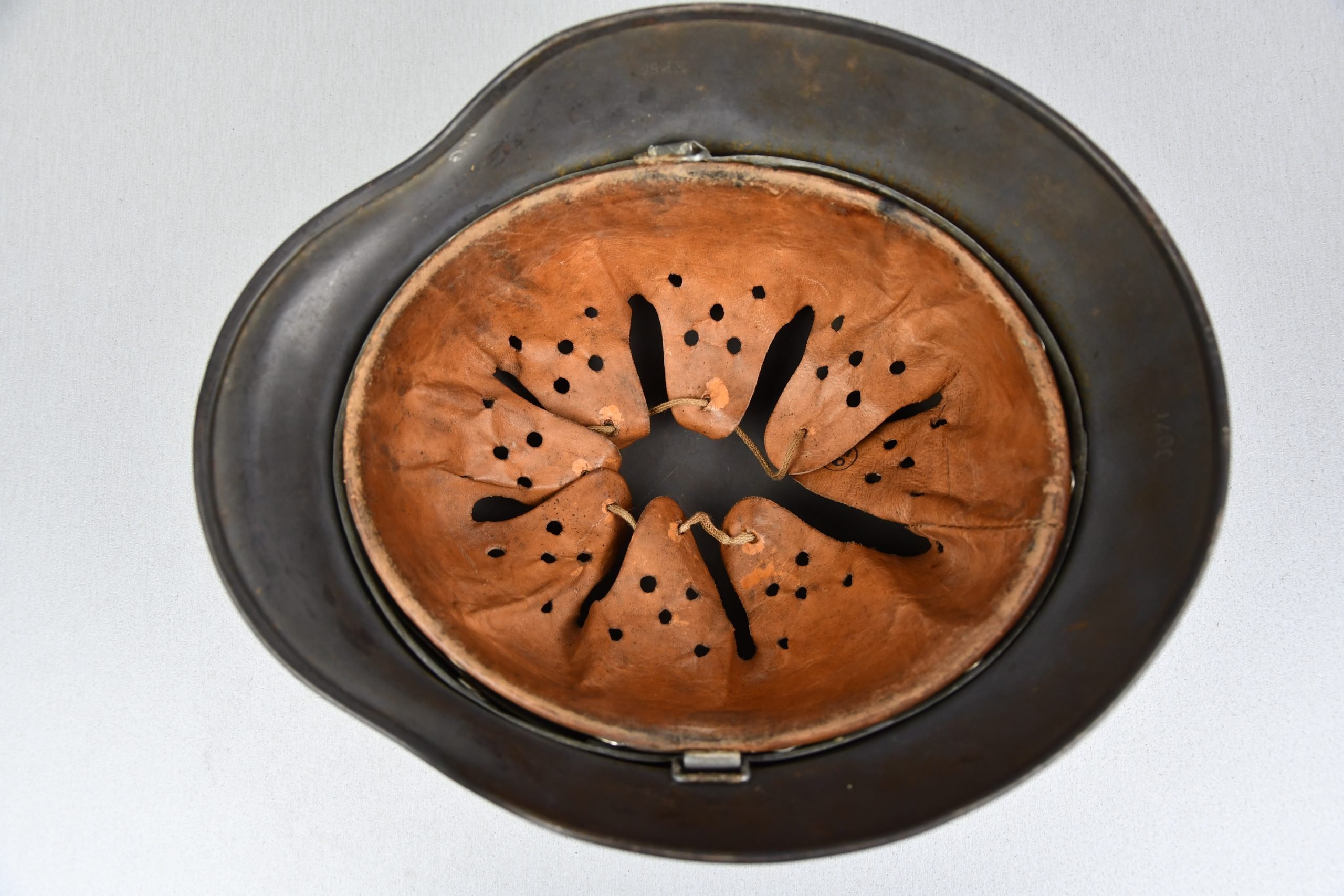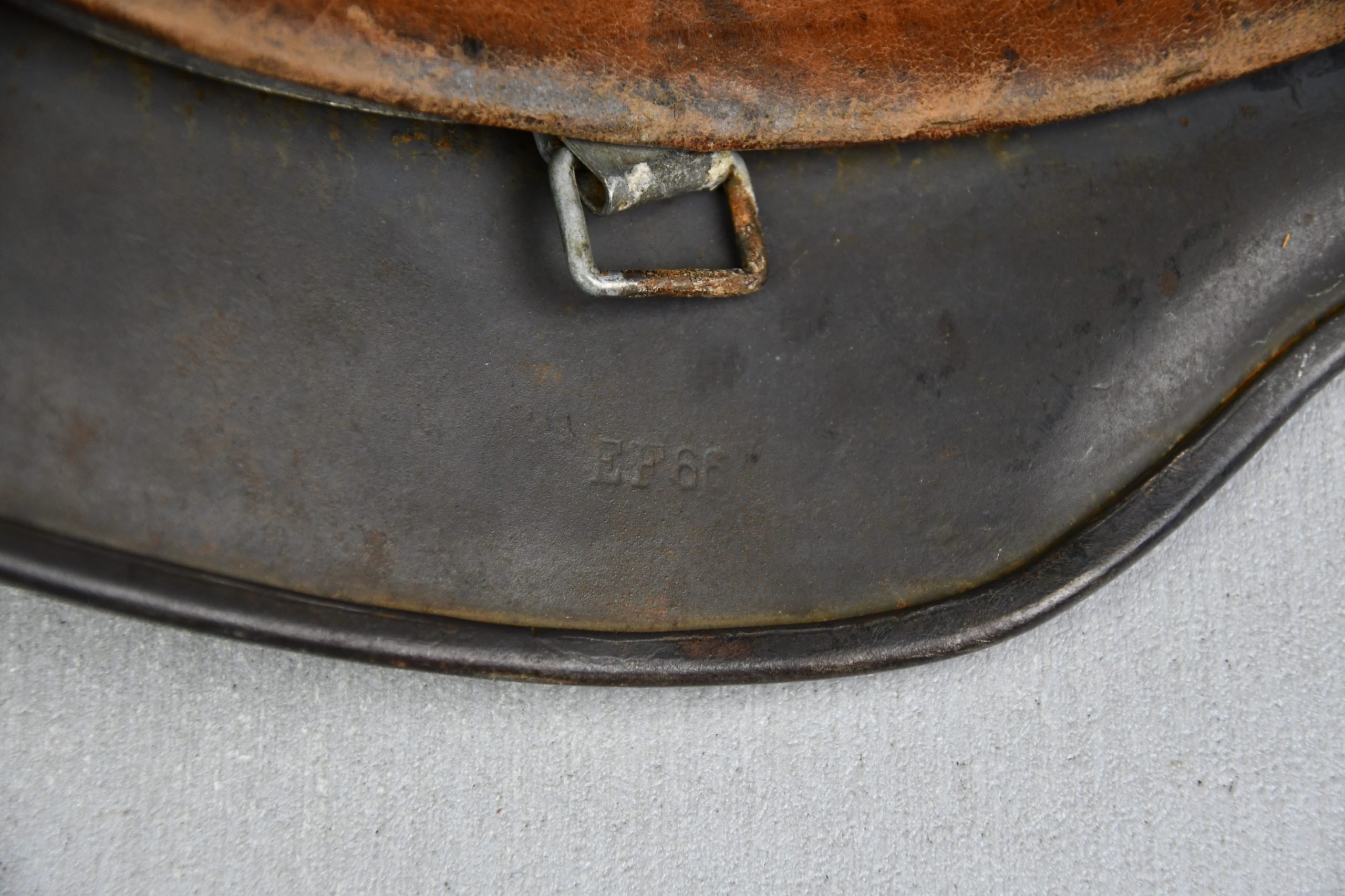 Excellent and very well preserved M40 pattern Luftwaffe steel helmet. The Luftwaffe decal on the left is nearly 100% intact, shows crisp details and nice toning! The exterior paint shows almost no damages and has a nice textured surface. The liner shows light wear and the leather is supple and strong. It comes with a full length draw string. The split pins remain straight and unmessed with. The steel liner band is dated 1940 (I deem!). Maker marked on the side by EF, size 66. Lot number in the rear hard to tell looks like 8070 โ EF is known for their odd and bad markings. A stunning helmet, hard to upgrade! EF is also a rare maker for LW helmets.