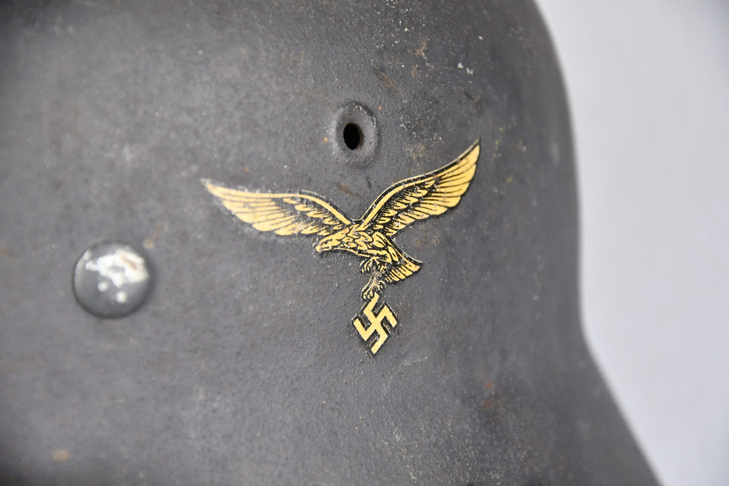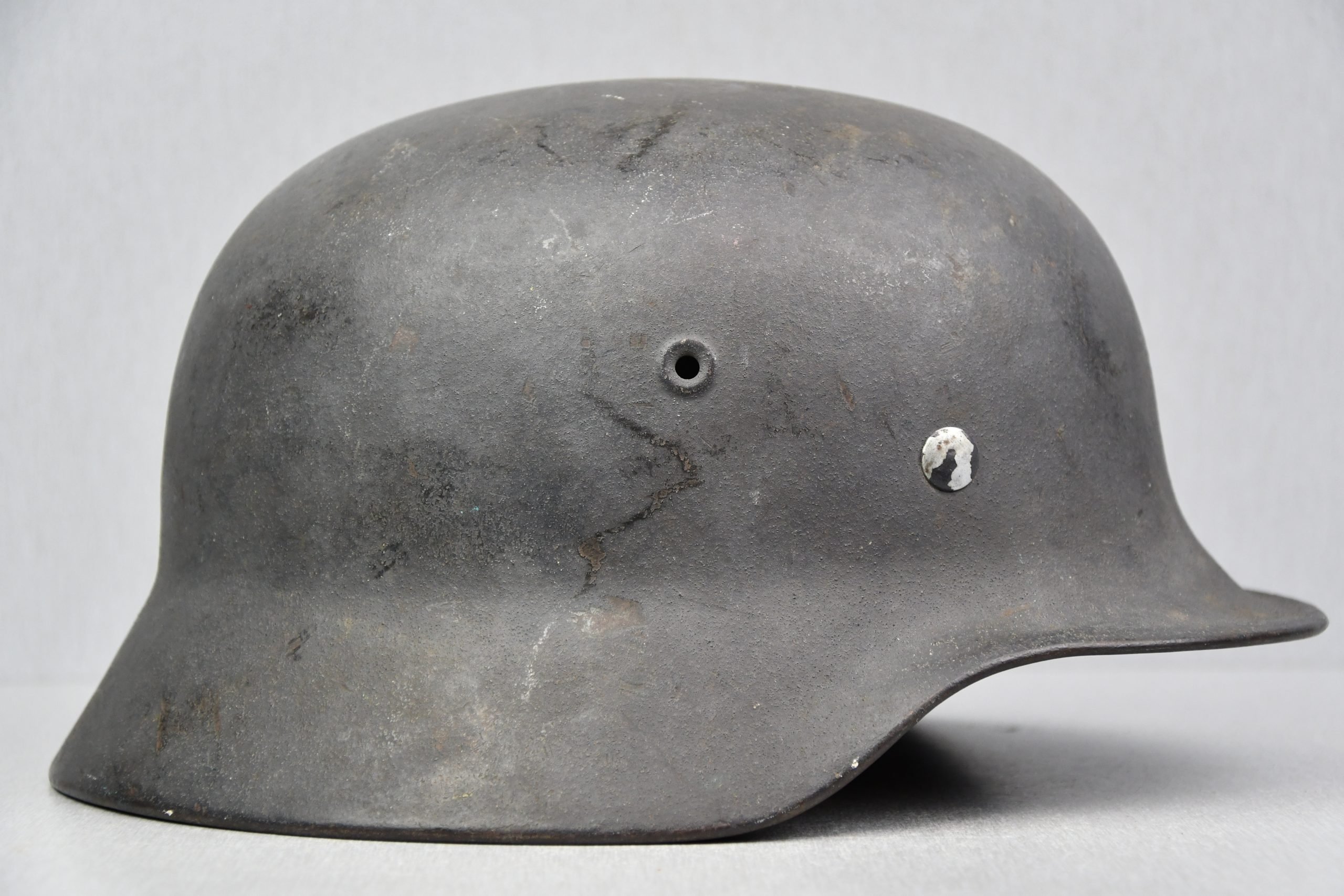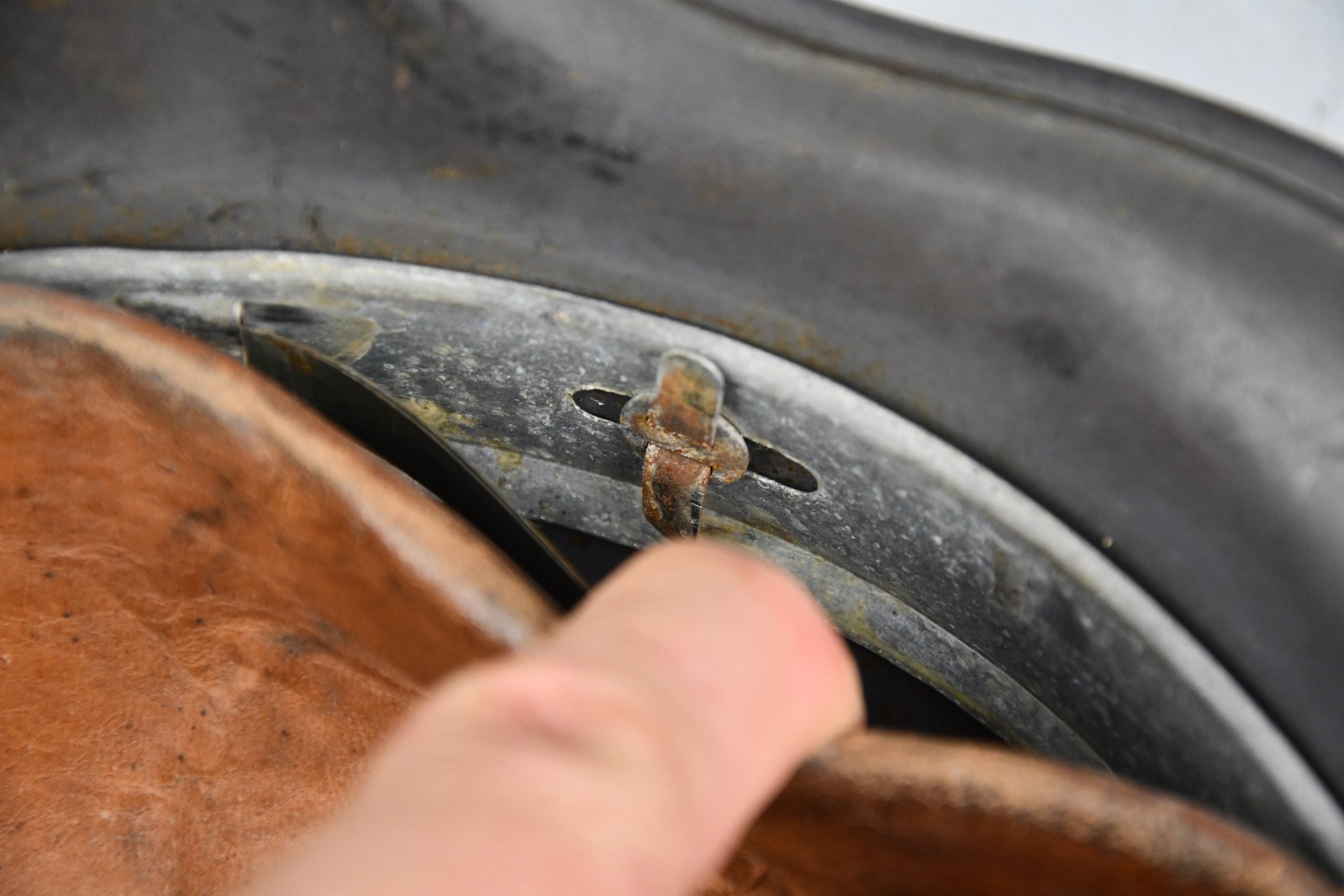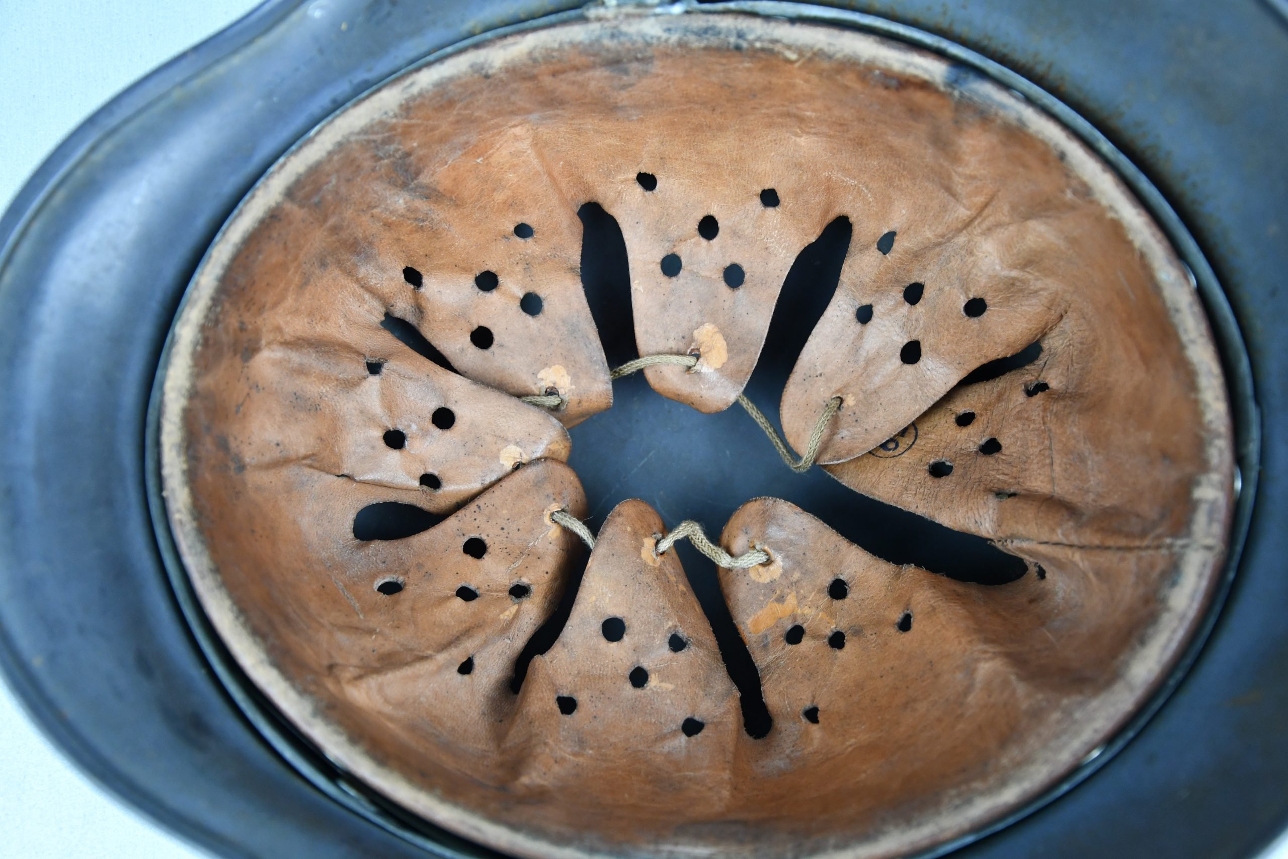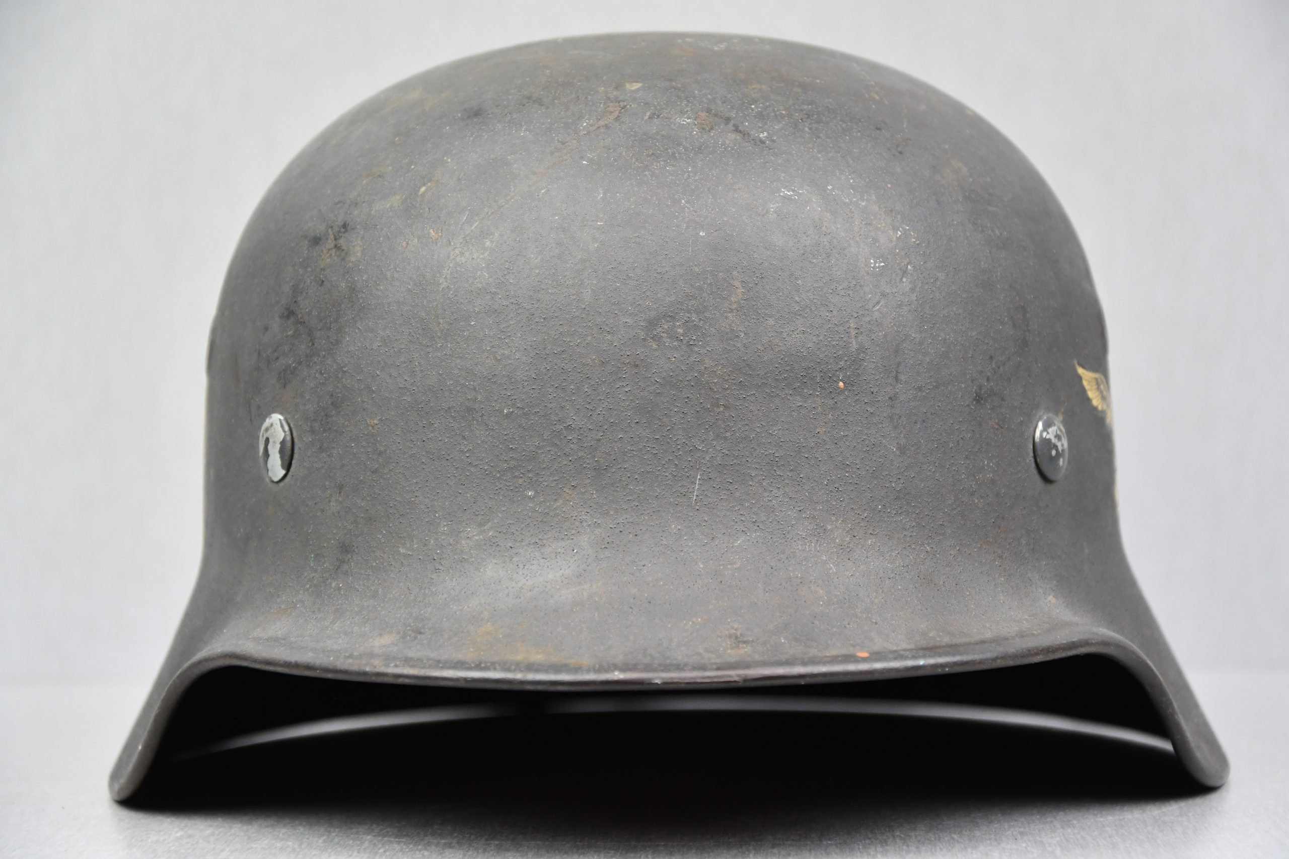 Excellent and very well preserved M40 pattern Luftwaffe steel helmet. The Luftwaffe decal on the left is nearly 100% intact, shows crisp details and nice toning! The exterior paint shows almost no damages and has a nice textured surface. The liner shows light wear and the leather is supple and strong. It comes with a full length draw string. The split pins remain straight and unmessed with. The steel liner band is dated 1940 (I deem!). Maker marked on the side by EF, size 66. Lot number in the rear hard to tell looks like 8070 โ EF is known for their odd and bad markings. A stunning helmet, hard to upgrade! EF is also a rare maker for LW helmets.