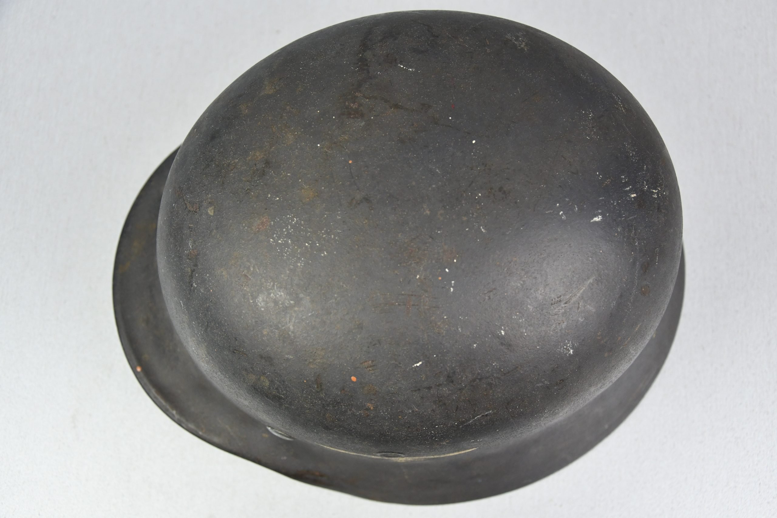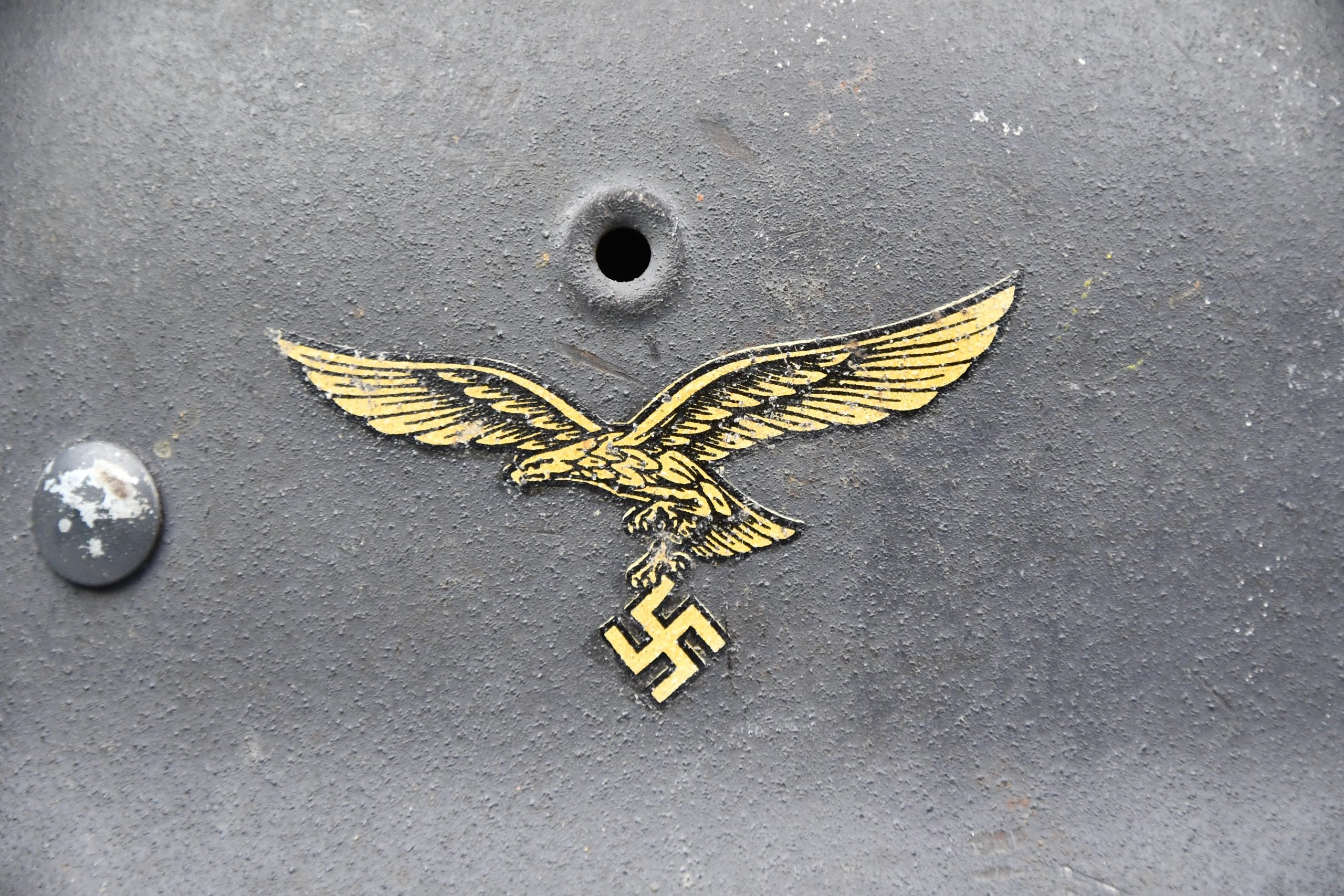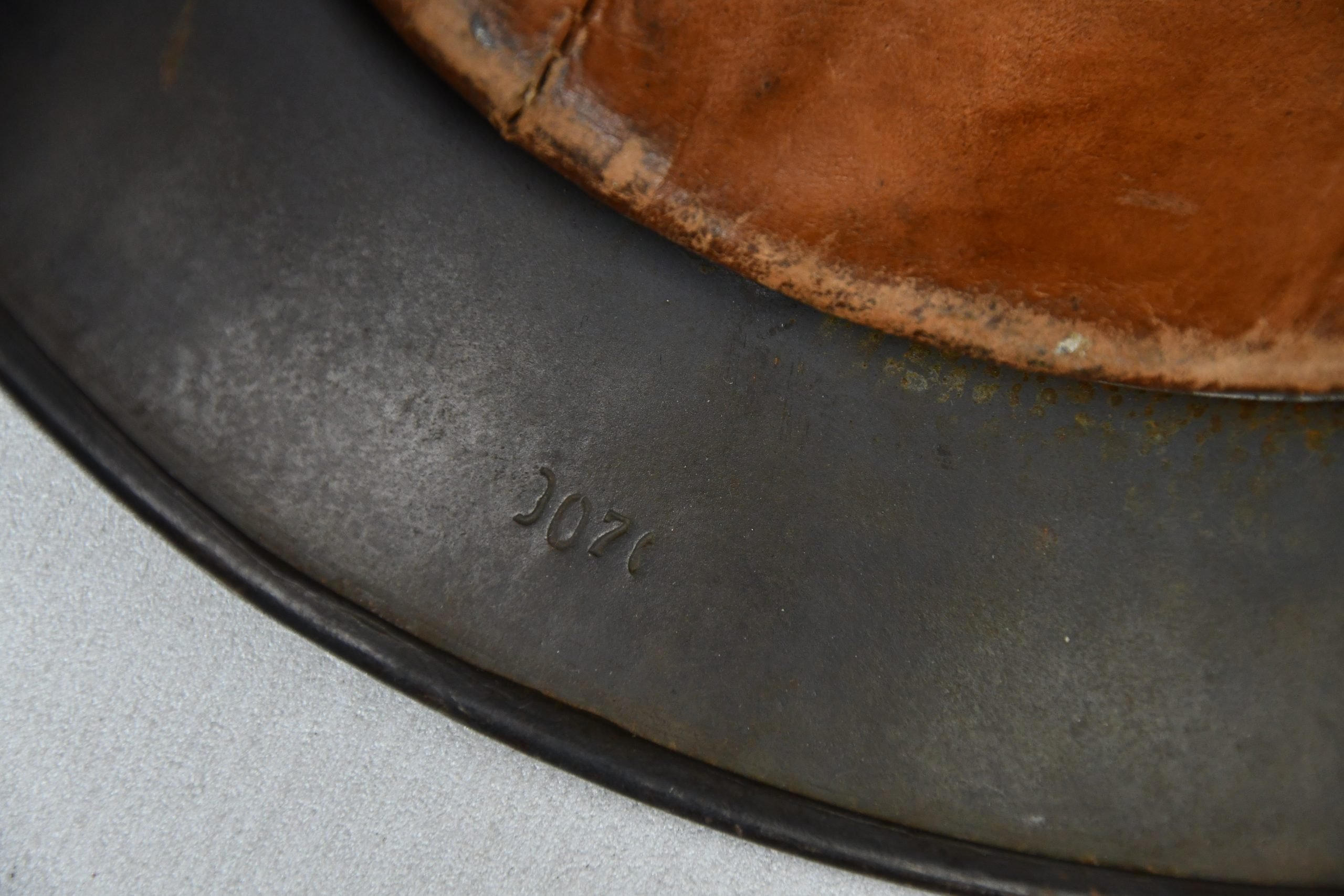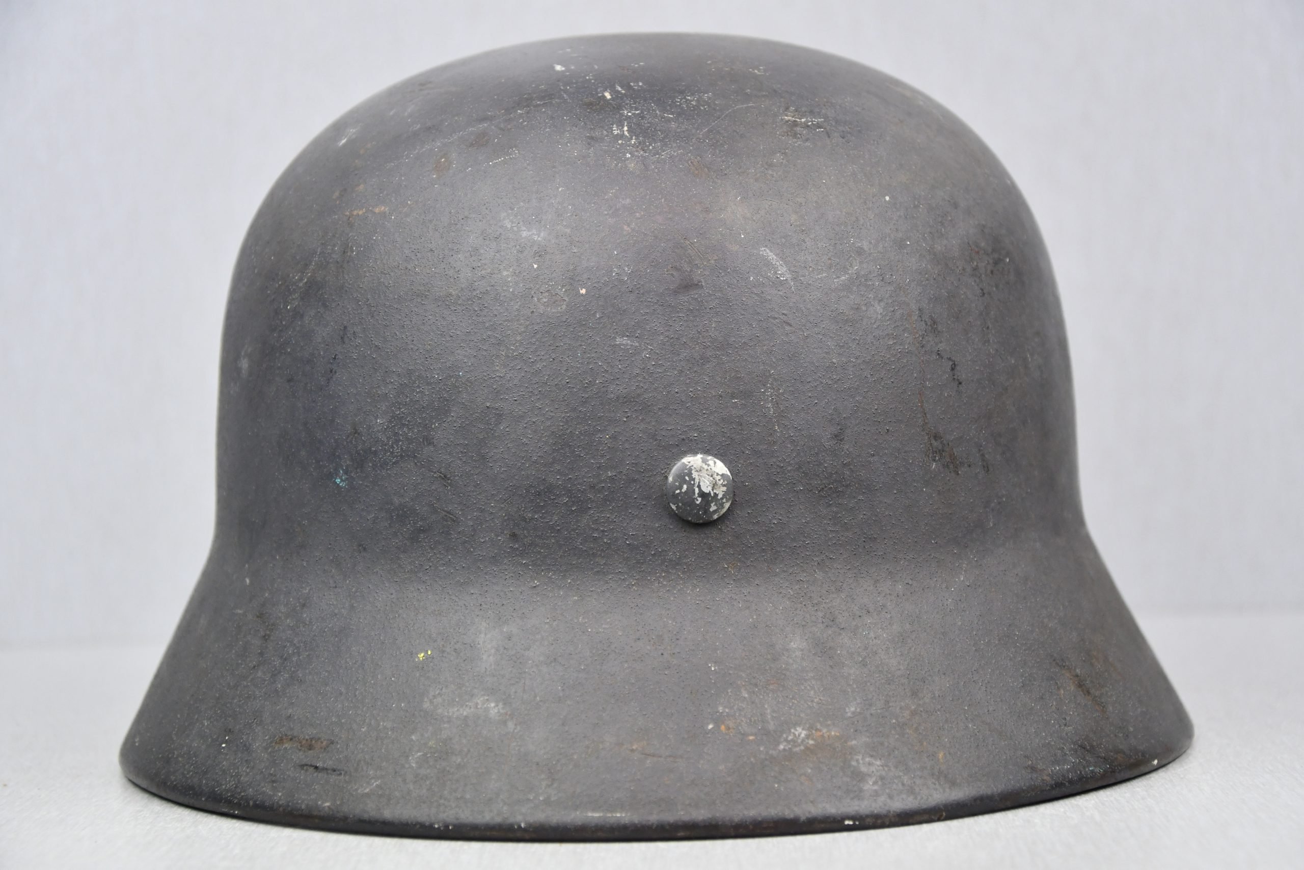 Excellent and very well preserved M40 pattern Luftwaffe steel helmet. The Luftwaffe decal on the left is nearly 100% intact, shows crisp details and nice toning! The exterior paint shows almost no damages and has a nice textured surface. The liner shows light wear and the leather is supple and strong. It comes with a full length draw string. The split pins remain straight and unmessed with. The steel liner band is dated 1940 (I deem!). Maker marked on the side by EF, size 66. Lot number in the rear hard to tell looks like 8070 โ EF is known for their odd and bad markings. A stunning helmet, hard to upgrade! EF is also a rare maker for LW helmets.