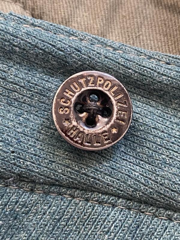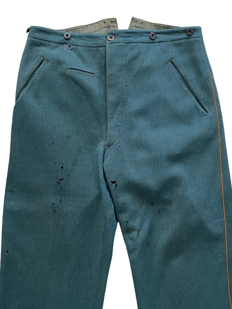 Original WW2 period German 'Schutzpolizei' Police straight leg trousers. Complete with all buttons. Made of grey green wool with orange piping. Well worn pair, without stamps present on the lining. Some moth nips present, notably around the groin area.