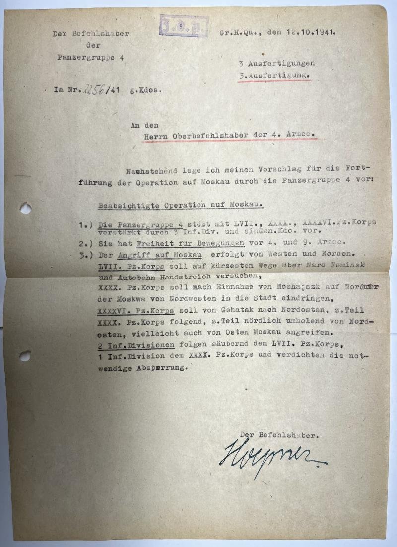 'Fortführung der Operation auf Moskau' (continuation of the operation on Moscow) by Panzergruppe 4.This proposal was meant for the commander of '4.Armee' ,'GFM' Günther von Kluge.The proposal has been signed by Erich Hoepner (RK 27-10-1939)Hoepner was discharged of service by Hitler due to disobedience and cowardice.Hoepner participated in the unsuccessful coup on A.H. and was hanged on 8-8-1944.