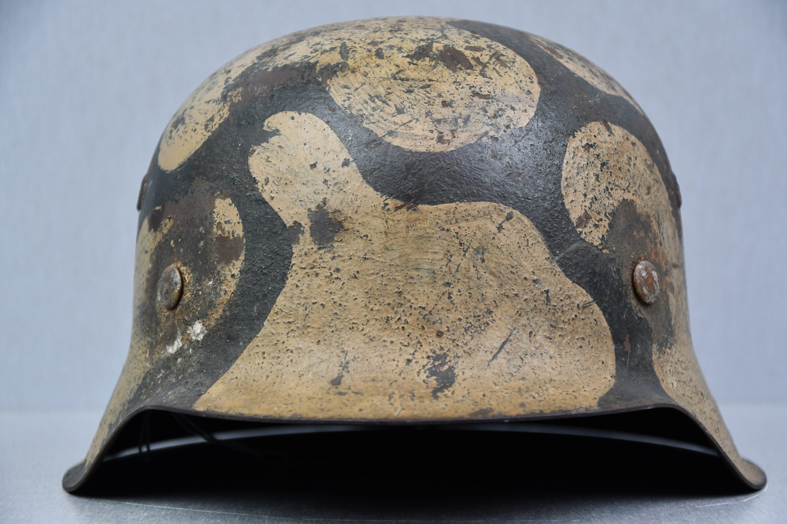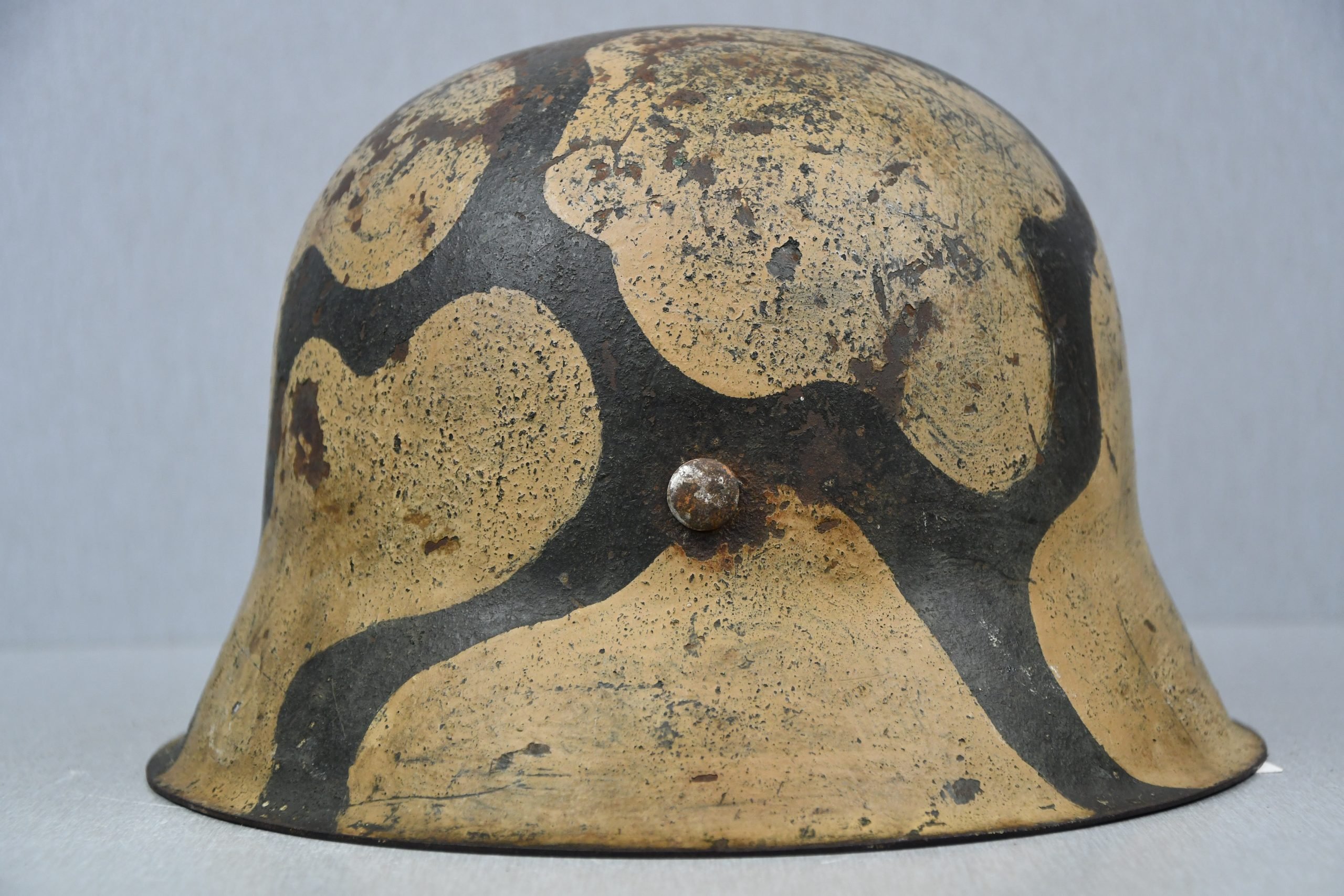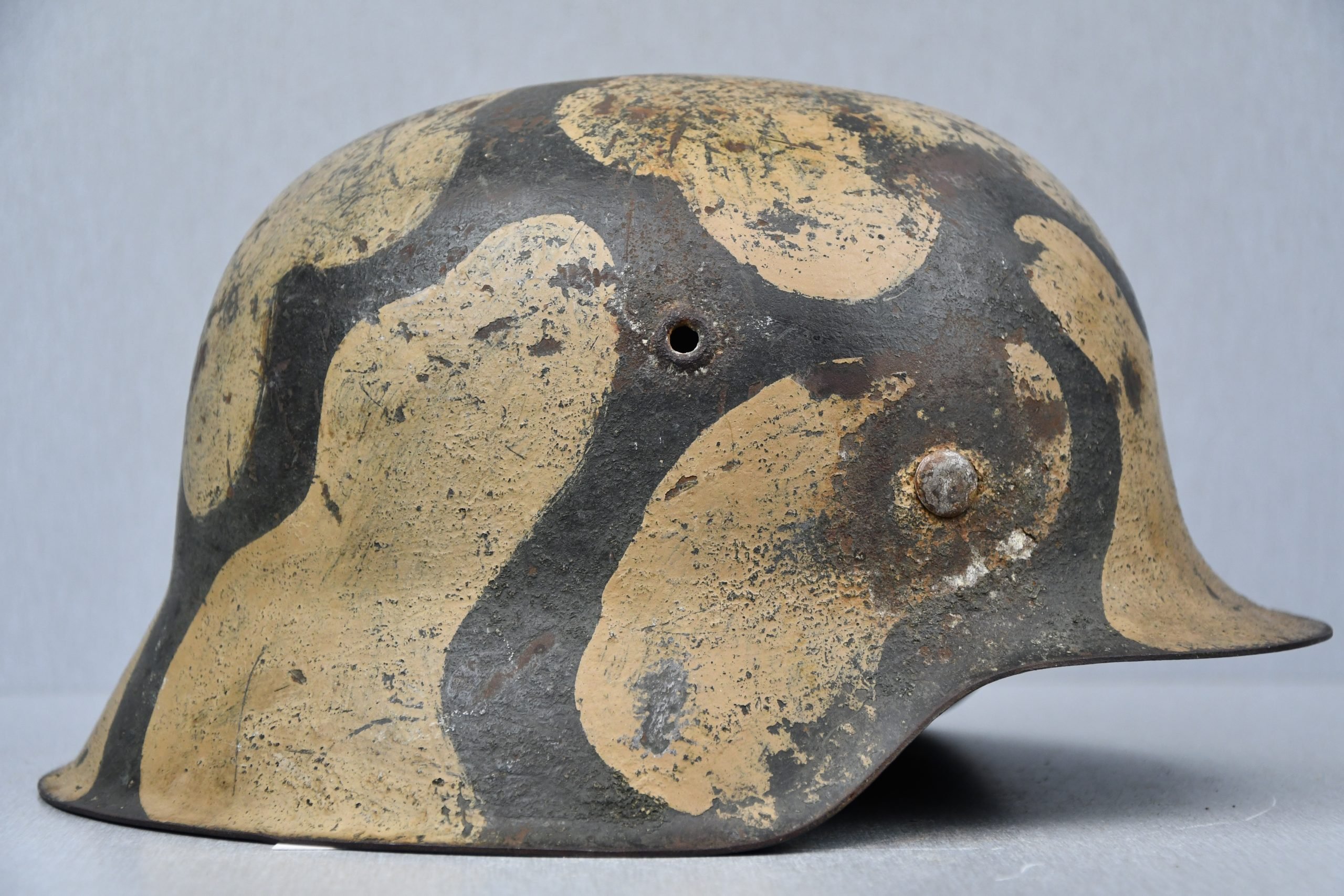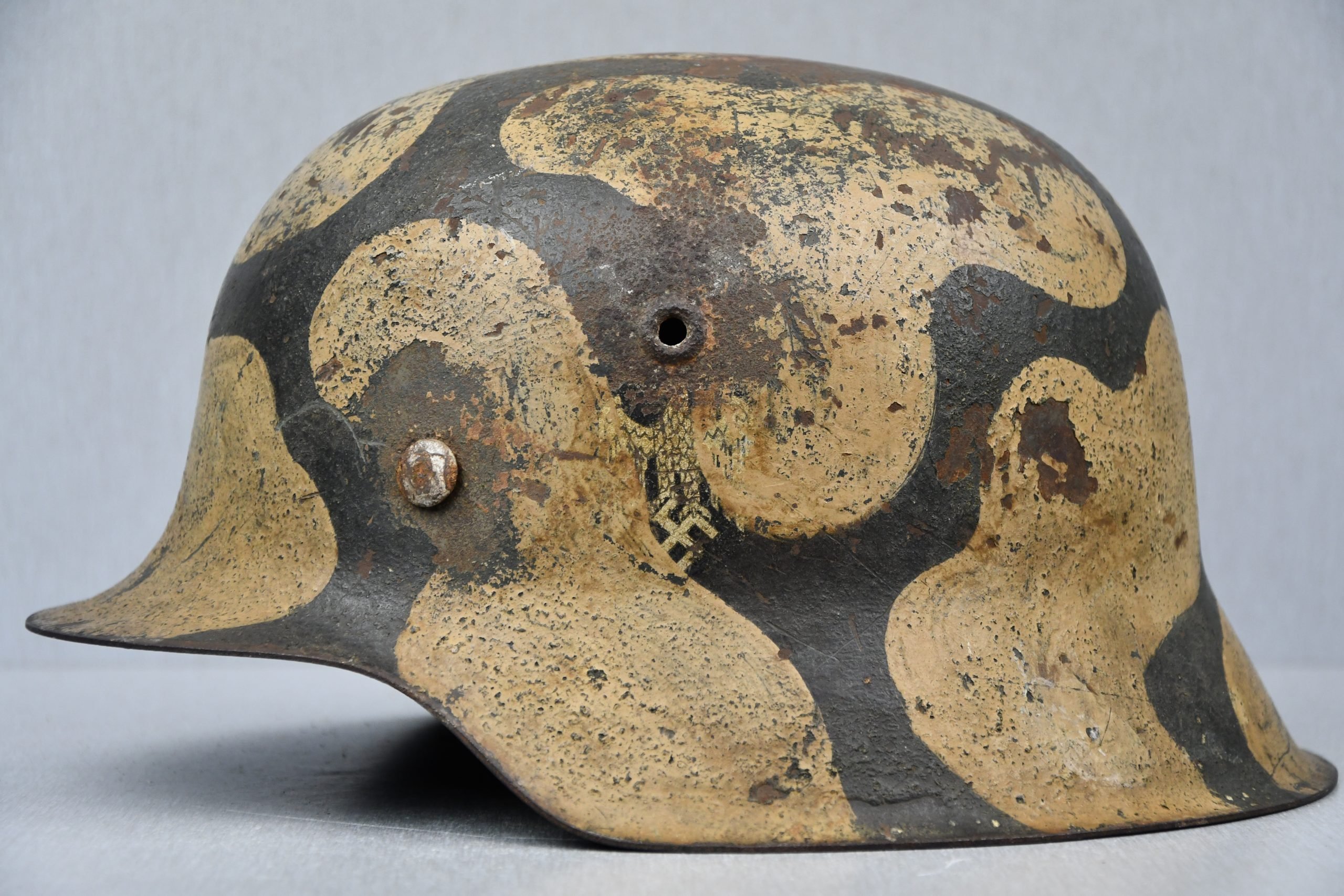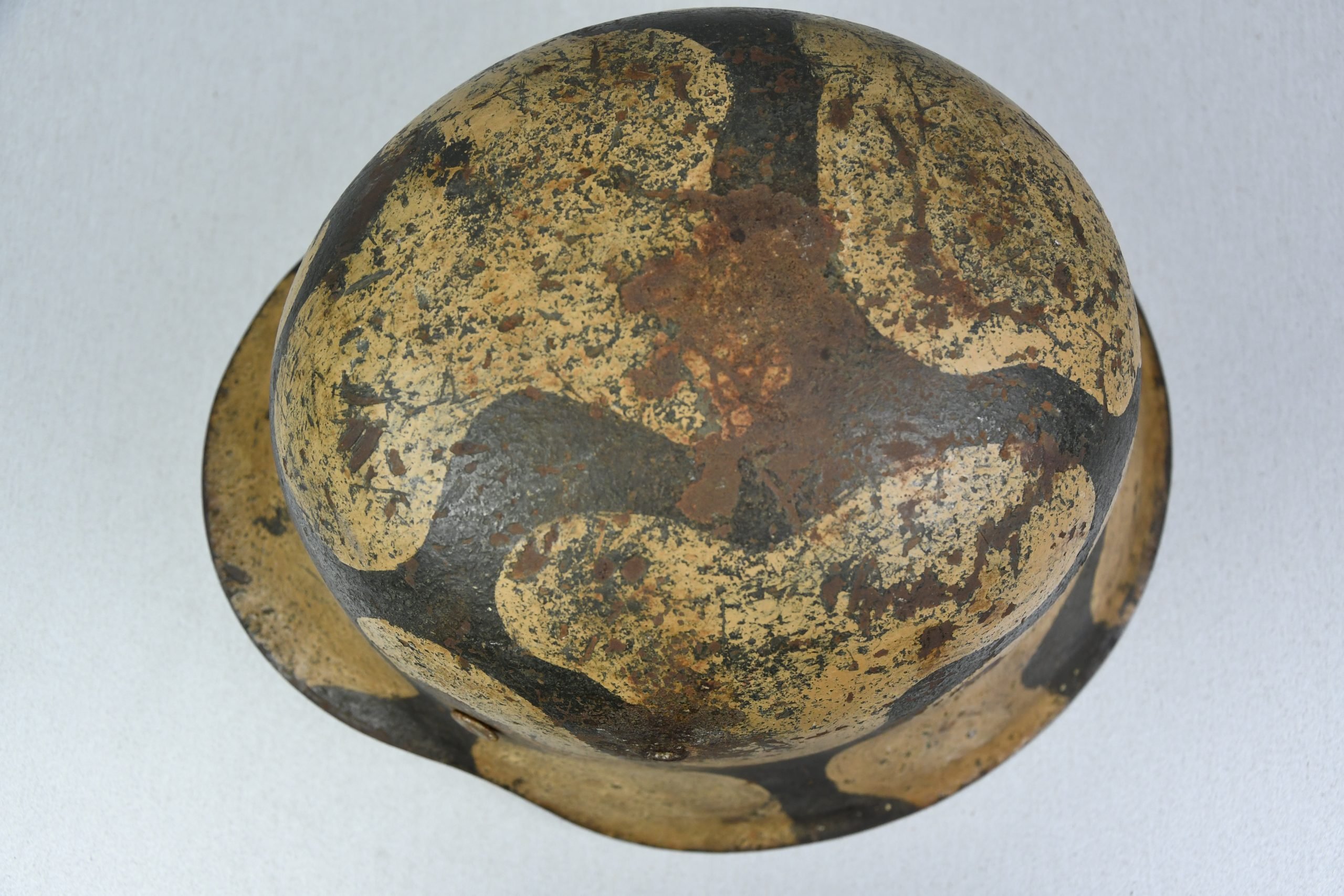 Offering a very attractive M42 army single decal helmet with so called turtle camouflage. A known pattern, see attachment with similar published example. The army decal, being an ET-pattern eagle, is still clearly visible through the cruvy camouflage figures. The helmet is complete with an original liner in good condition. The leather is made out of pig skin, a more desirable variant. Draw string is present. The liner was most likely added to the helmet at one point in time in my opinion. Nevertheless this is an ultra rare, extremely desirable camouflage helmet! Shell markings are difficult to read but based on the decal and design I would say this is an ET64 helmet.