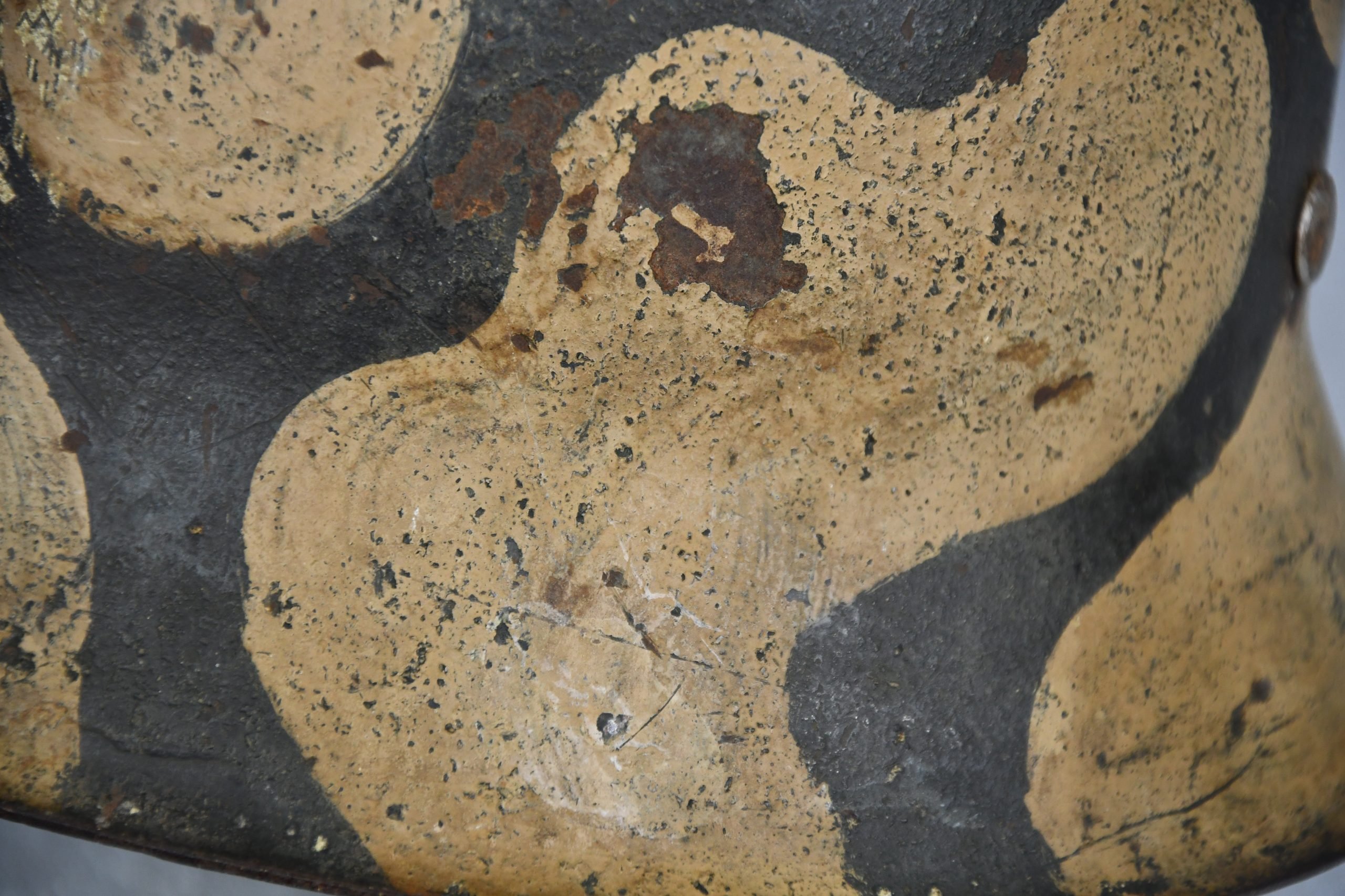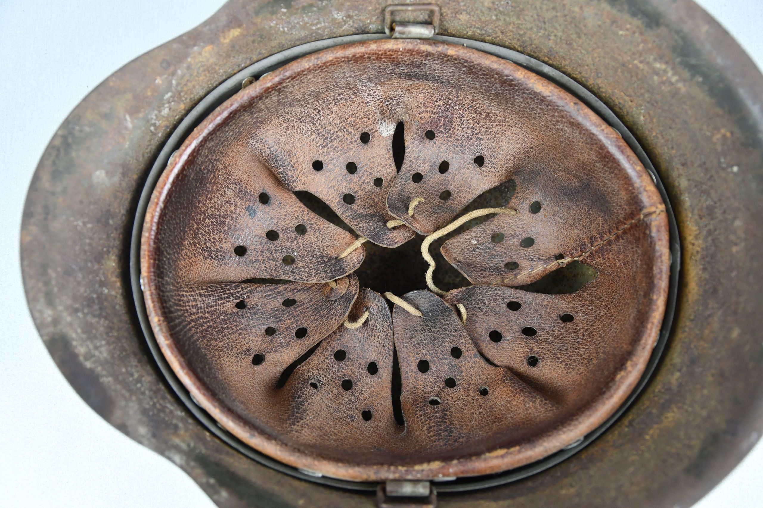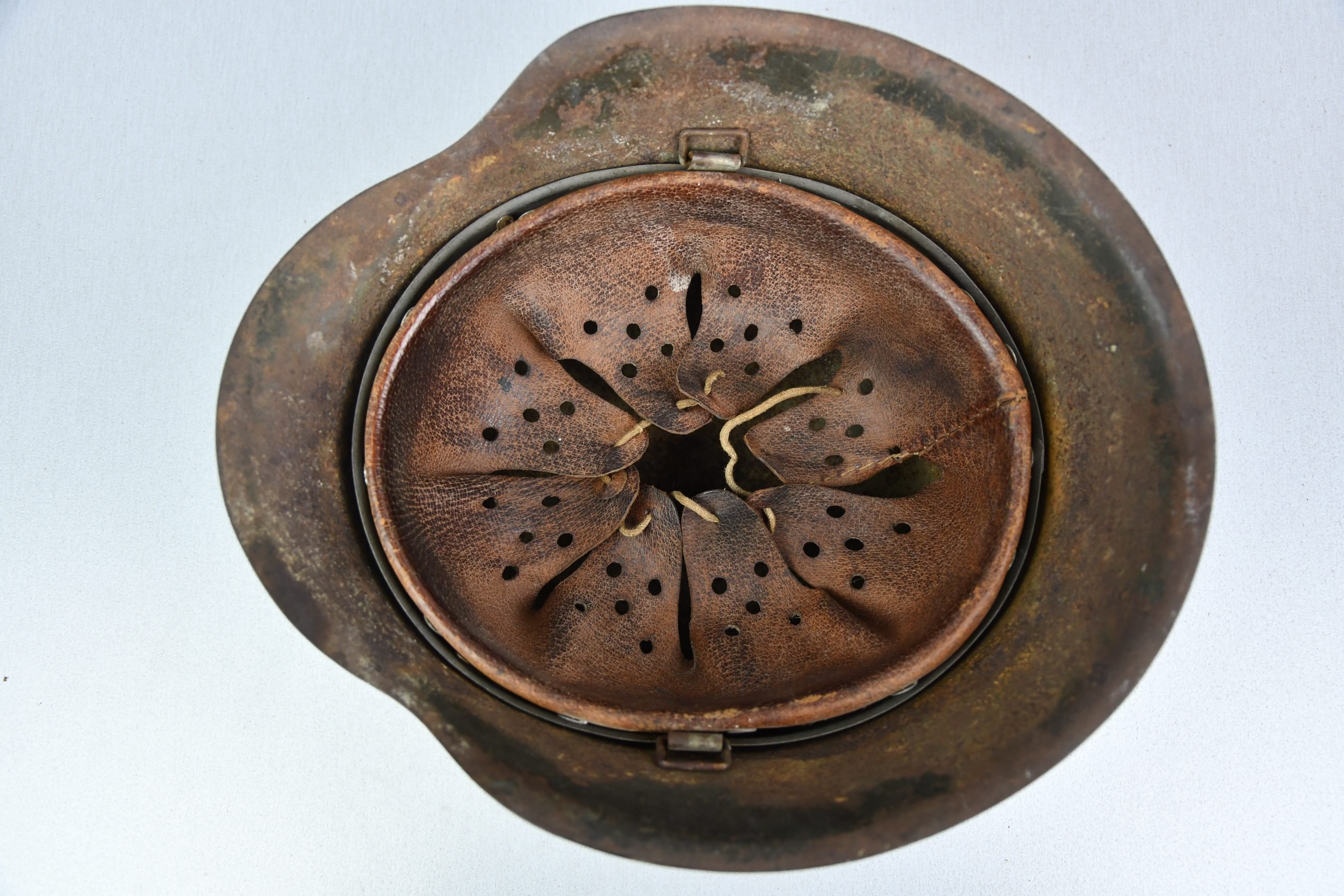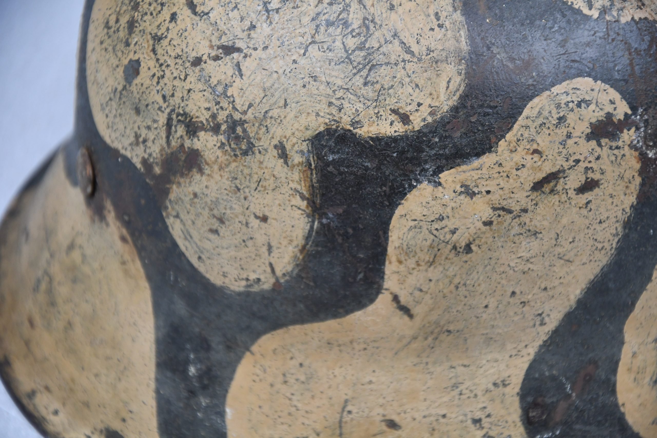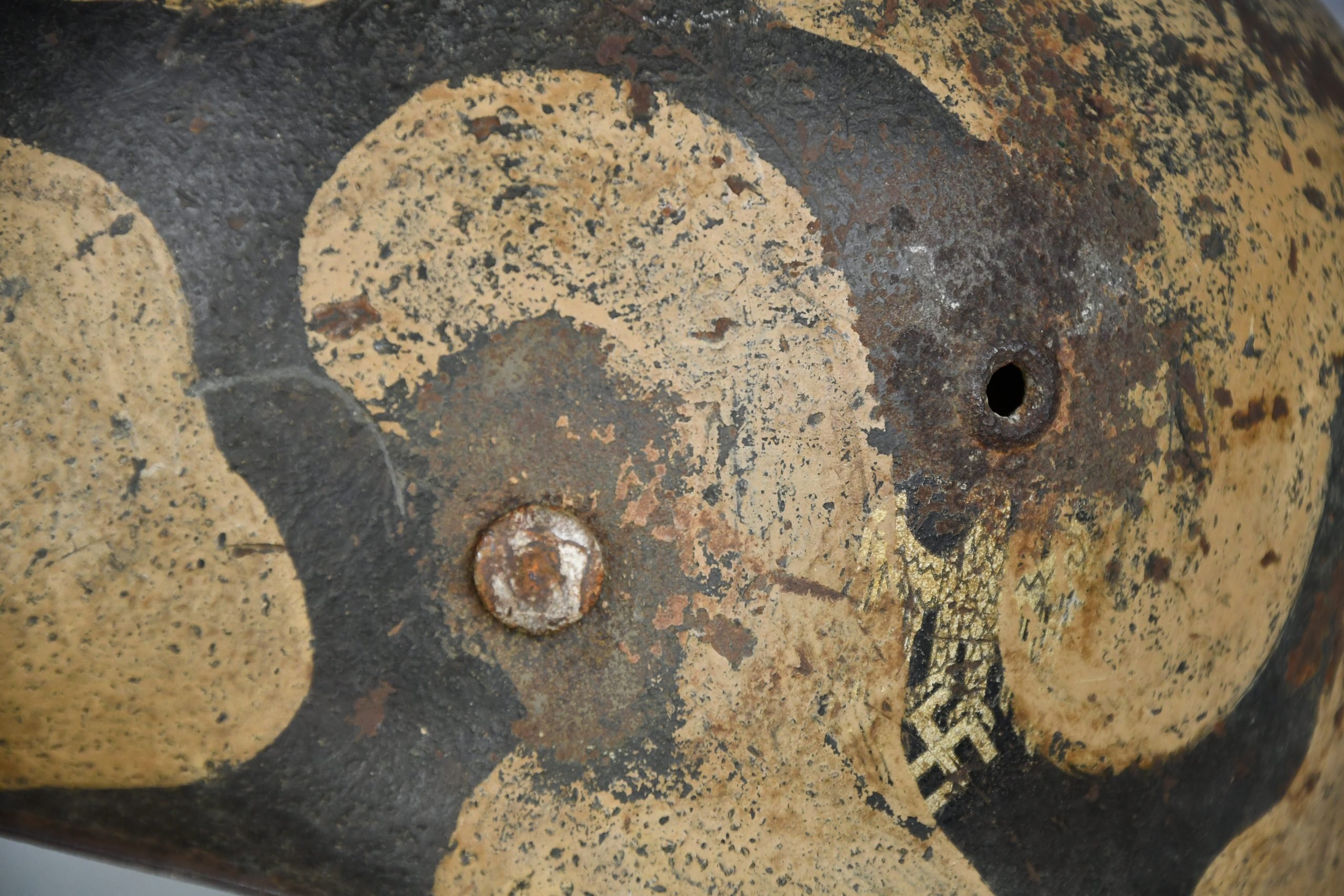 Offering a very attractive M42 army single decal helmet with so called turtle camouflage. A known pattern, see attachment with similar published example. The army decal, being an ET-pattern eagle, is still clearly visible through the cruvy camouflage figures. The helmet is complete with an original liner in good condition. The leather is made out of pig skin, a more desirable variant. Draw string is present. The liner was most likely added to the helmet at one point in time in my opinion. Nevertheless this is an ultra rare, extremely desirable camouflage helmet! Shell markings are difficult to read but based on the decal and design I would say this is an ET64 helmet.