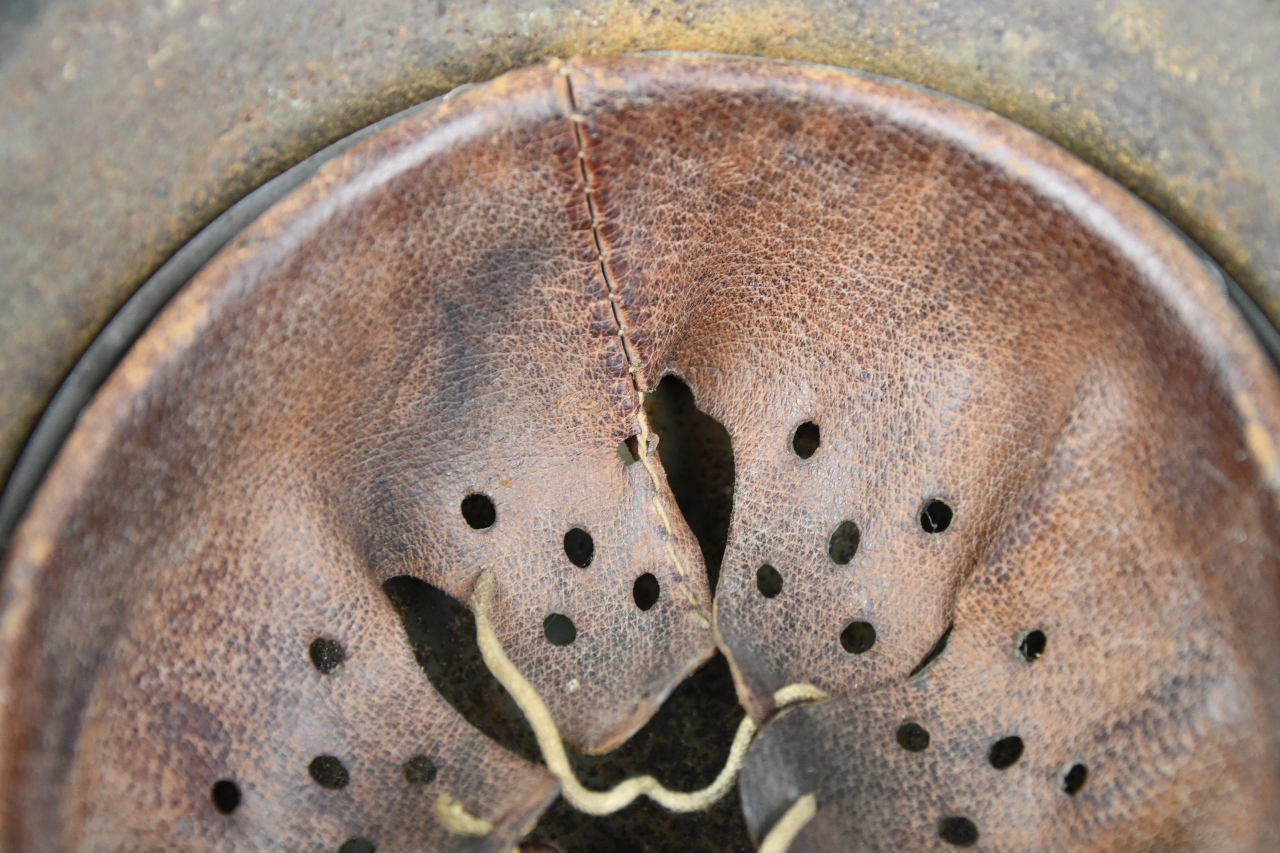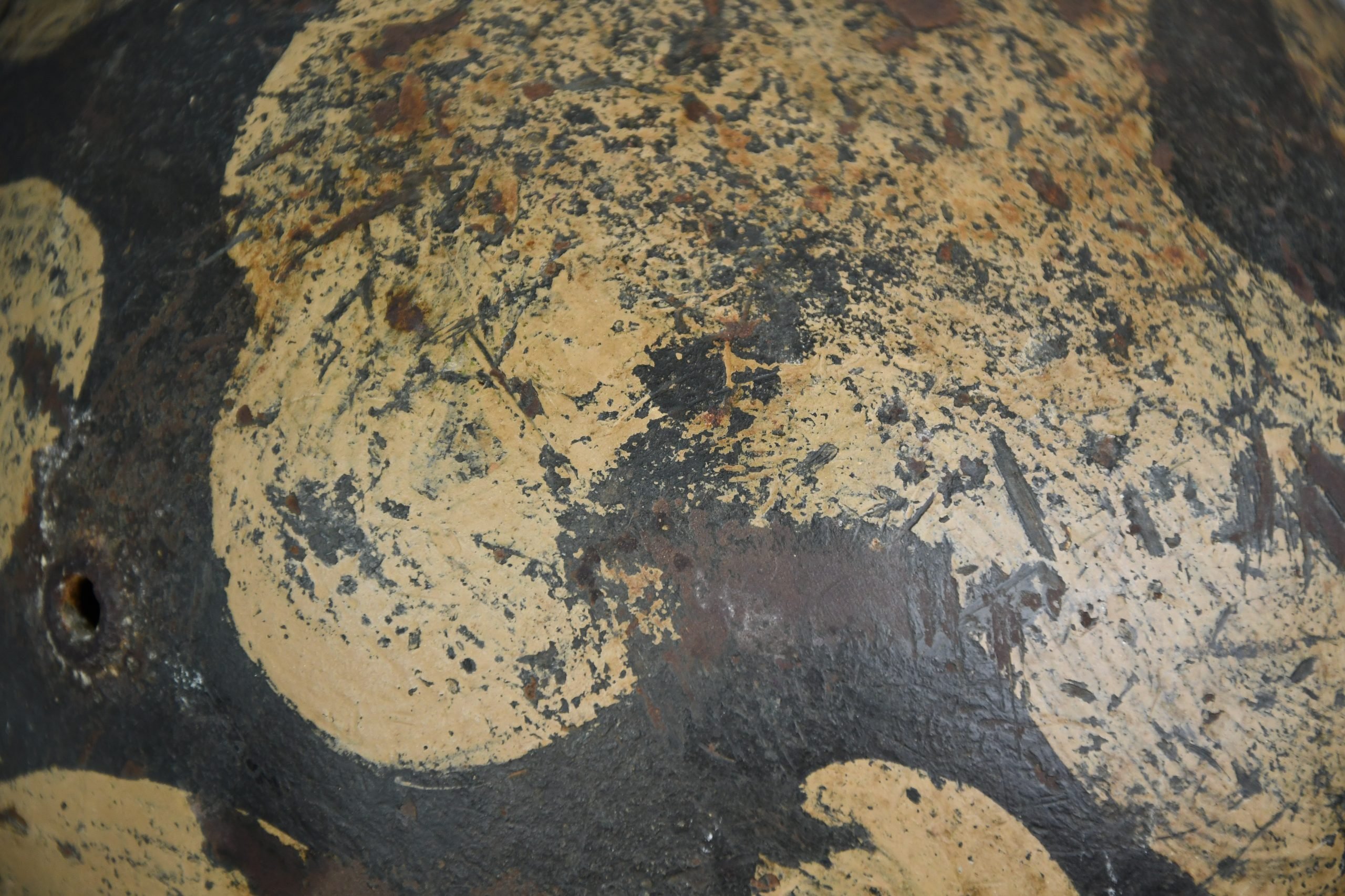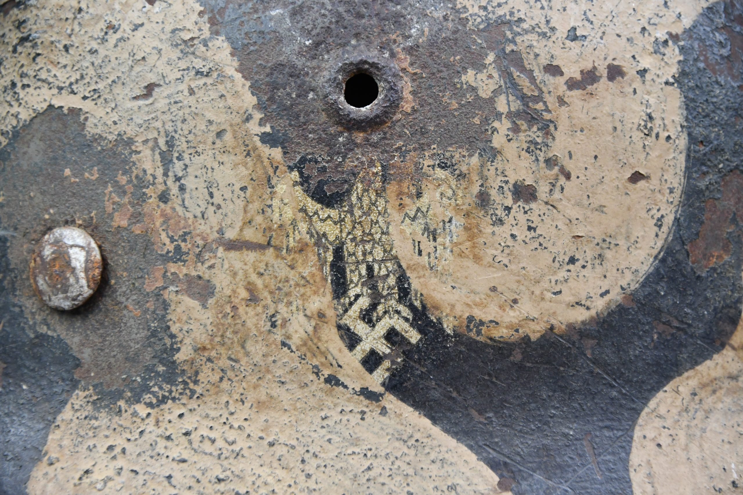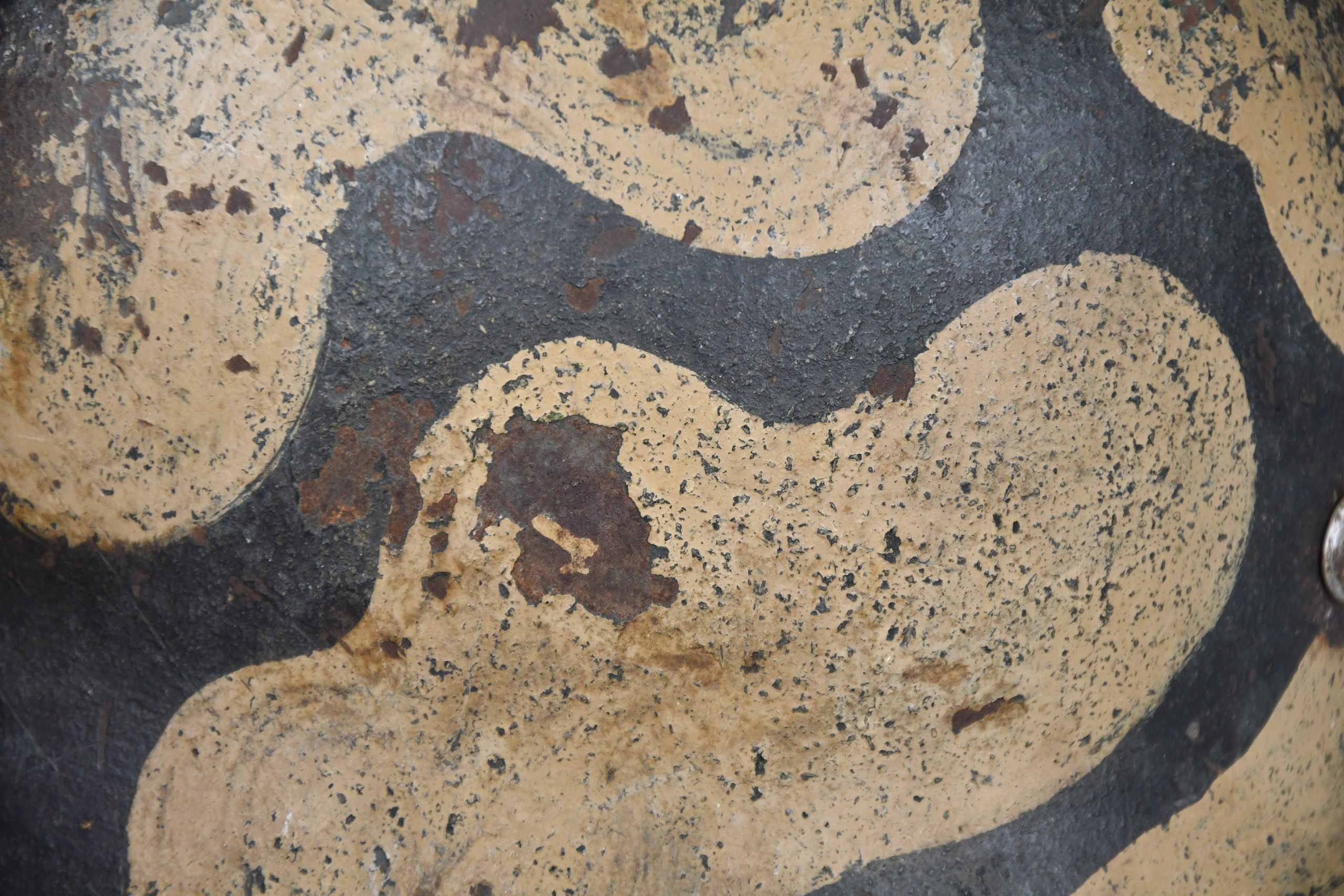 Offering a very attractive M42 army single decal helmet with so called turtle camouflage. A known pattern, see attachment with similar published example. The army decal, being an ET-pattern eagle, is still clearly visible through the cruvy camouflage figures. The helmet is complete with an original liner in good condition. The leather is made out of pig skin, a more desirable variant. Draw string is present. The liner was most likely added to the helmet at one point in time in my opinion. Nevertheless this is an ultra rare, extremely desirable camouflage helmet! Shell markings are difficult to read but based on the decal and design I would say this is an ET64 helmet.