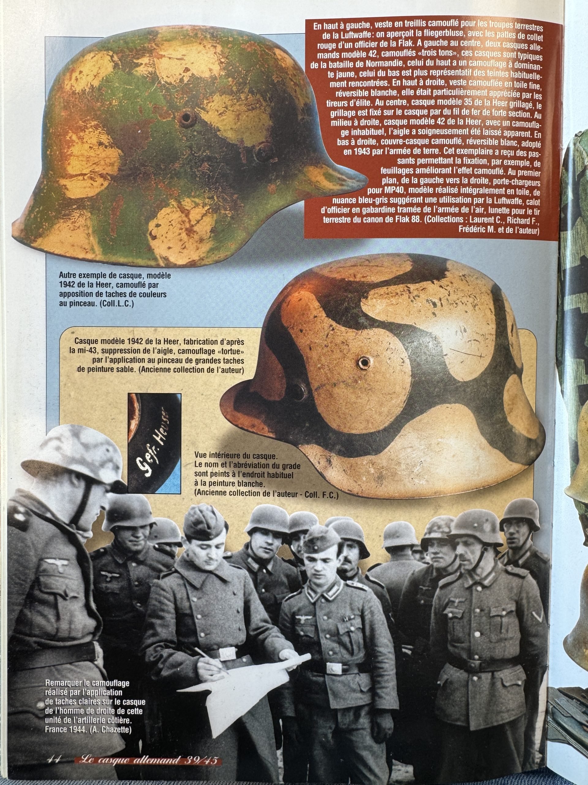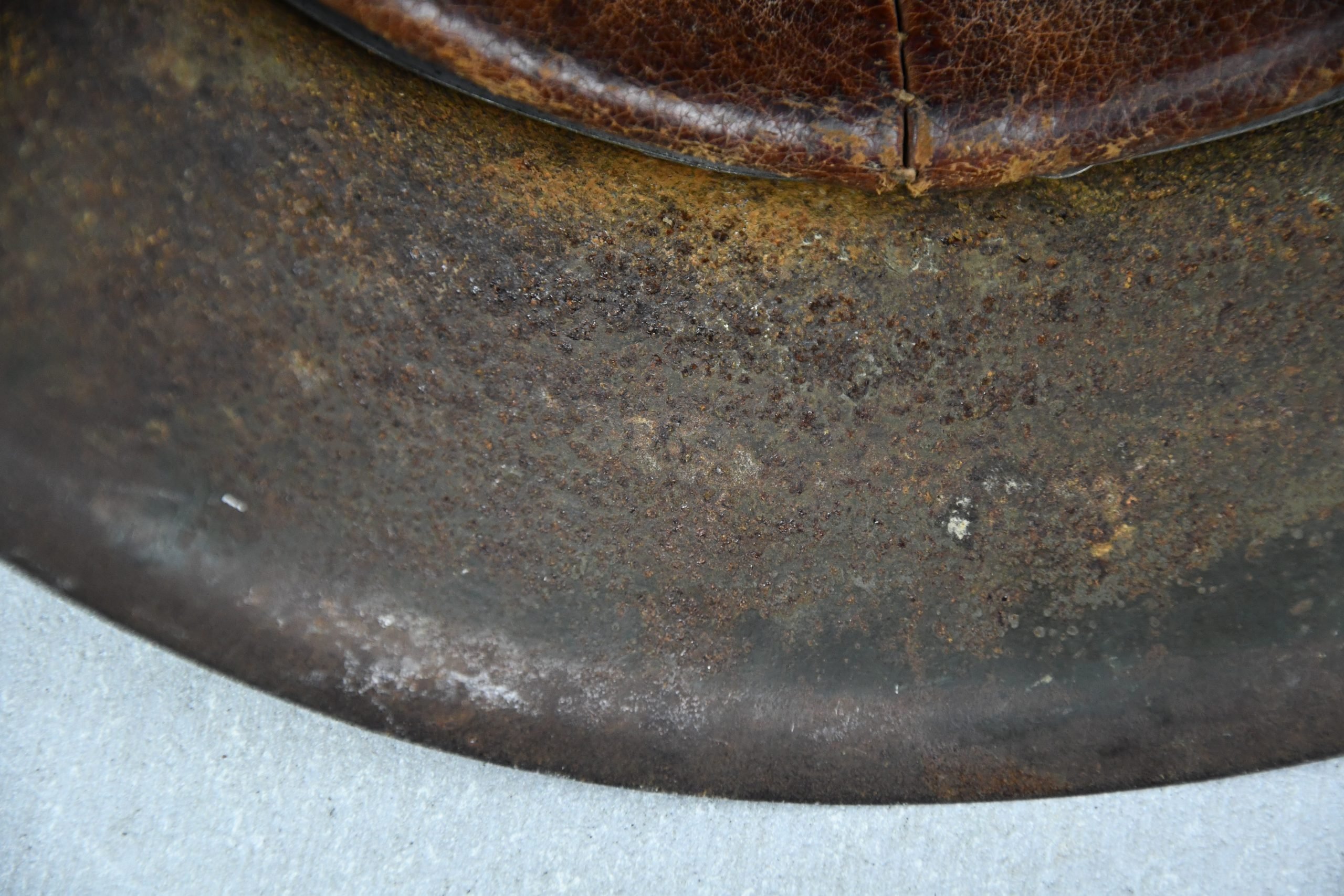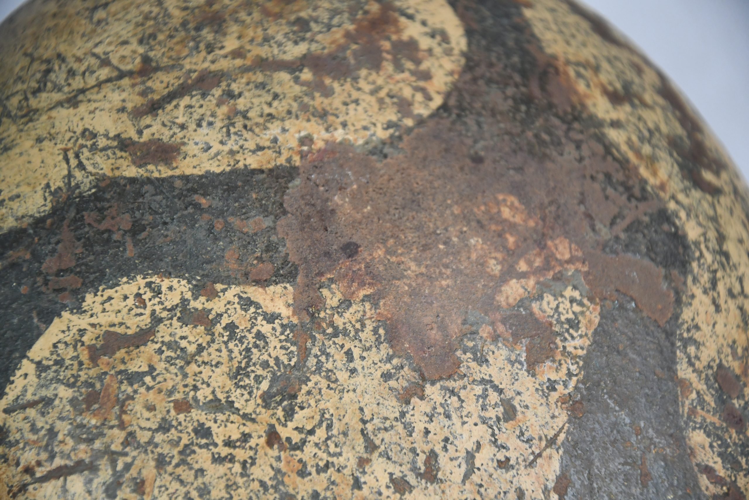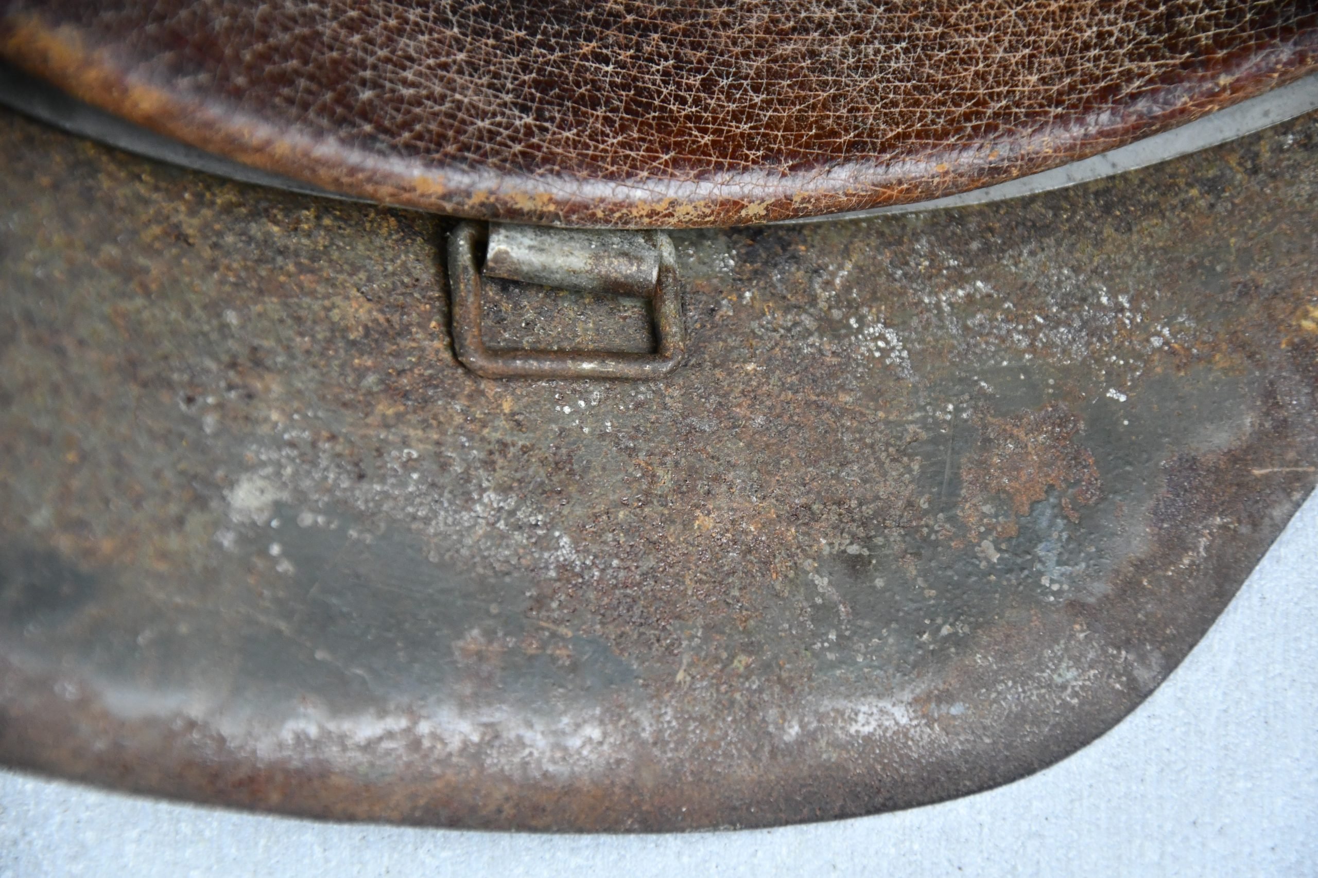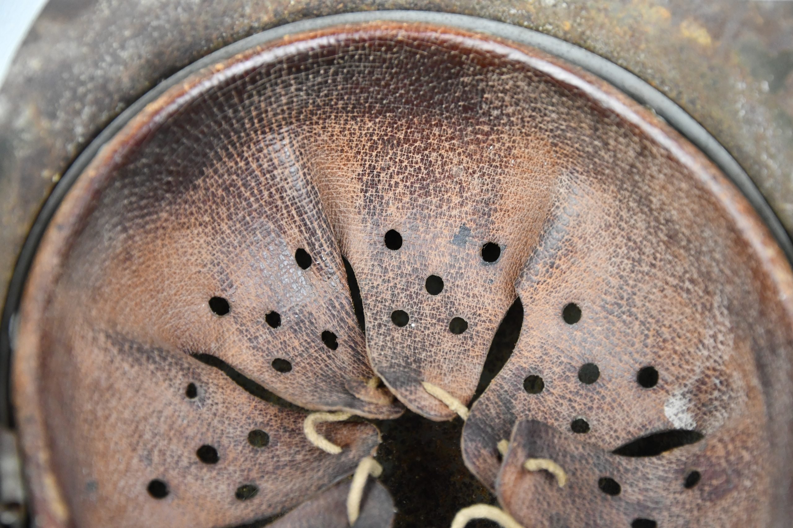 Offering a very attractive M42 army single decal helmet with so called turtle camouflage. A known pattern, see attachment with similar published example. The army decal, being an ET-pattern eagle, is still clearly visible through the cruvy camouflage figures. The helmet is complete with an original liner in good condition. The leather is made out of pig skin, a more desirable variant. Draw string is present. The liner was most likely added to the helmet at one point in time in my opinion. Nevertheless this is an ultra rare, extremely desirable camouflage helmet! Shell markings are difficult to read but based on the decal and design I would say this is an ET64 helmet.