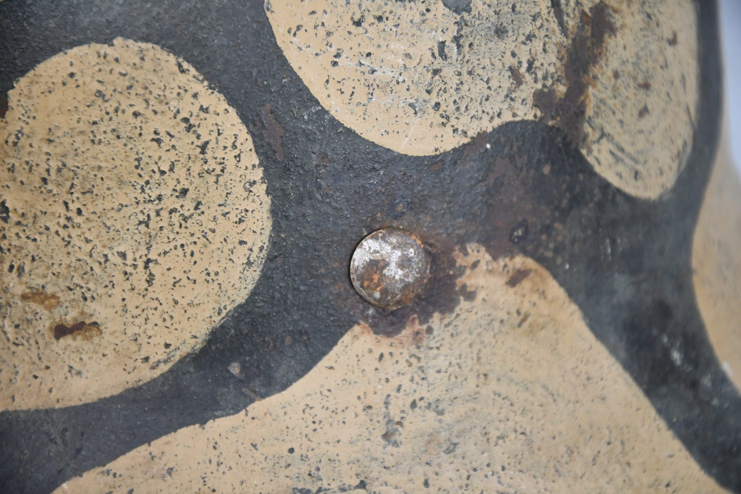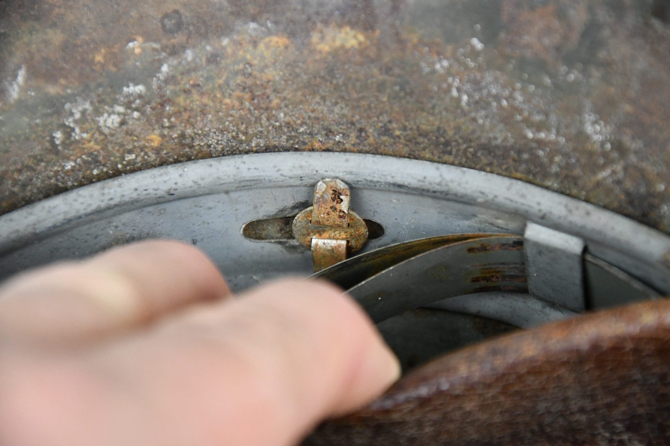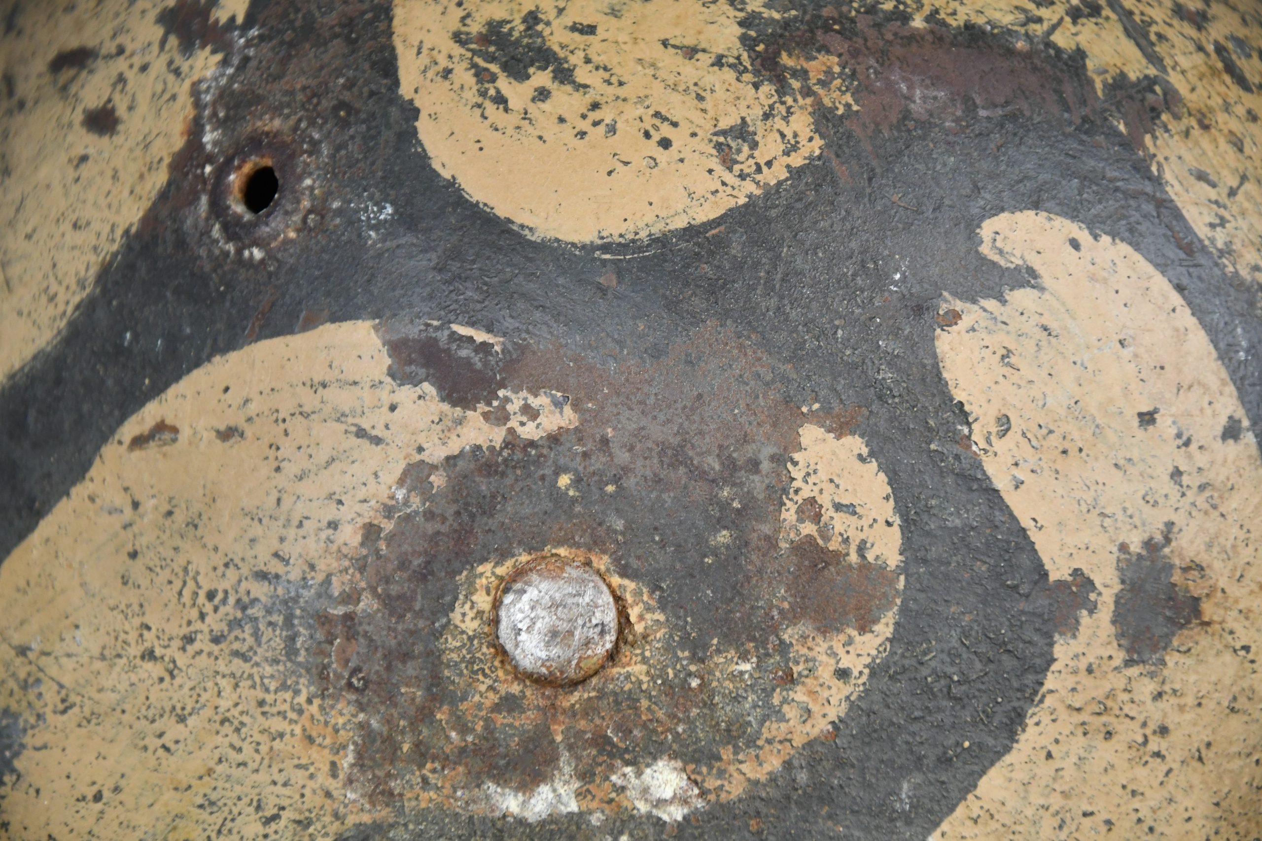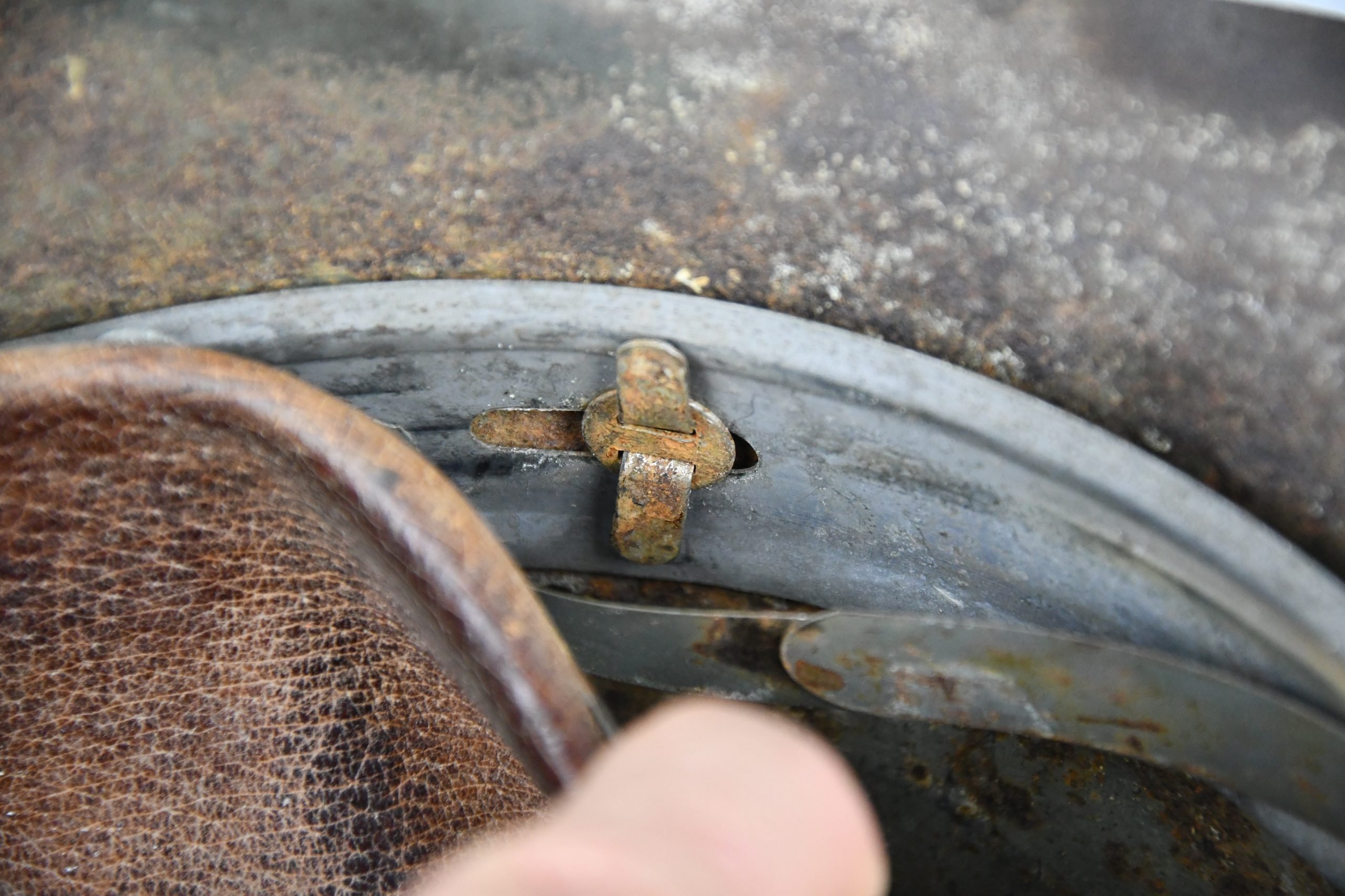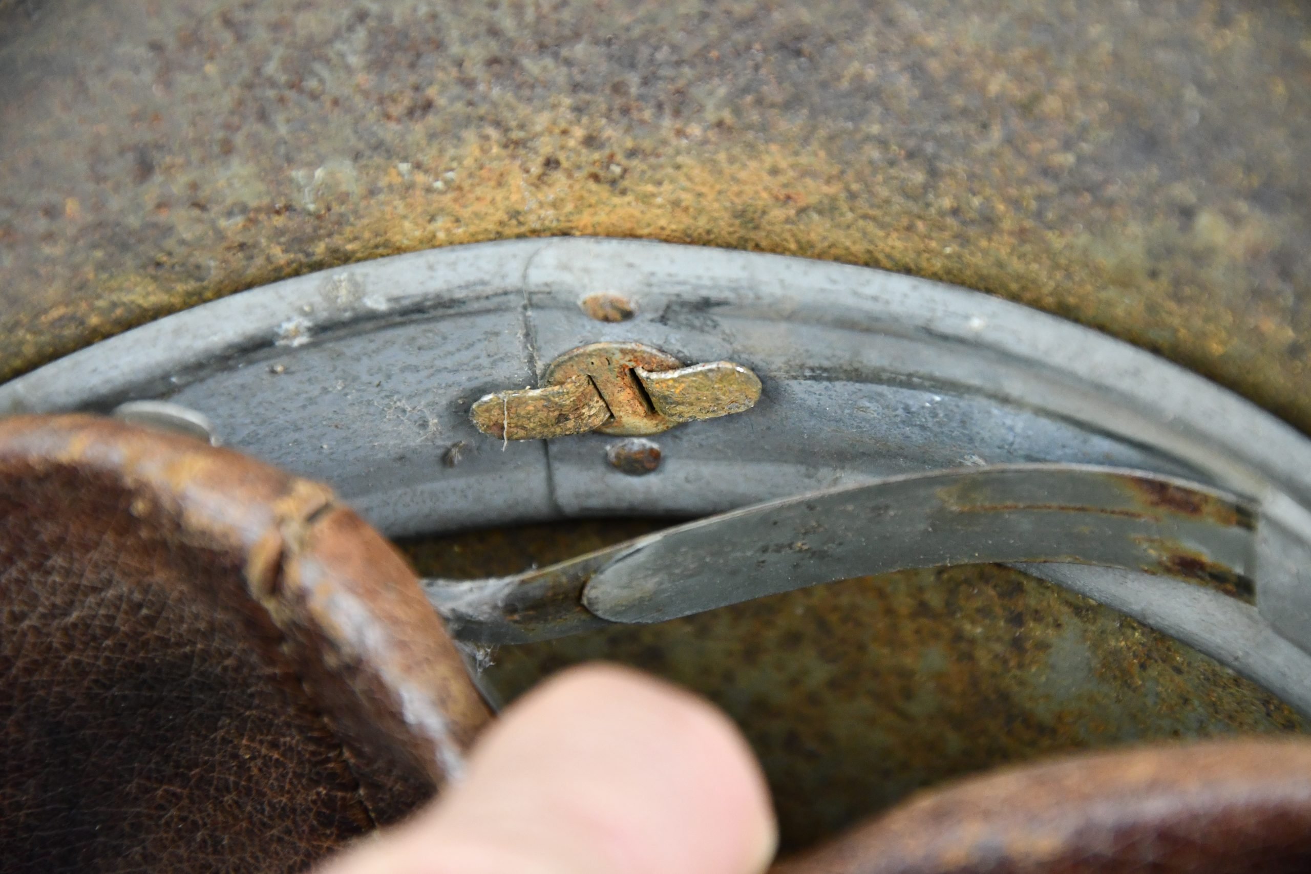 Offering a very attractive M42 army single decal helmet with so called turtle camouflage. A known pattern, see attachment with similar published example. The army decal, being an ET-pattern eagle, is still clearly visible through the cruvy camouflage figures. The helmet is complete with an original liner in good condition. The leather is made out of pig skin, a more desirable variant. Draw string is present. The liner was most likely added to the helmet at one point in time in my opinion. Nevertheless this is an ultra rare, extremely desirable camouflage helmet! Shell markings are difficult to read but based on the decal and design I would say this is an ET64 helmet.