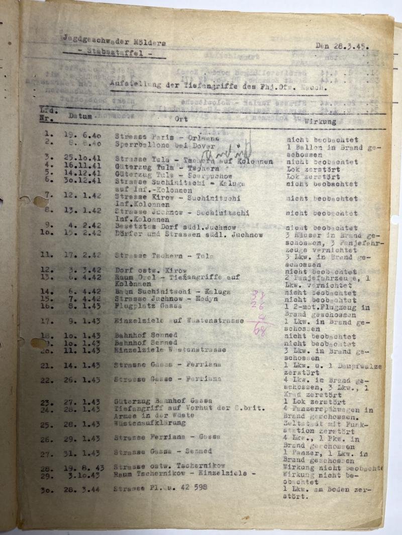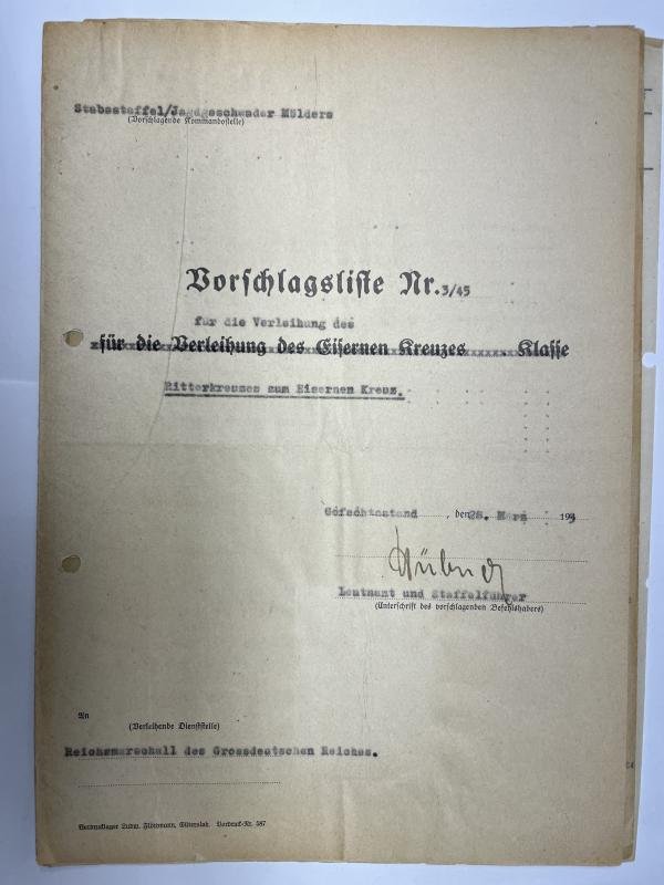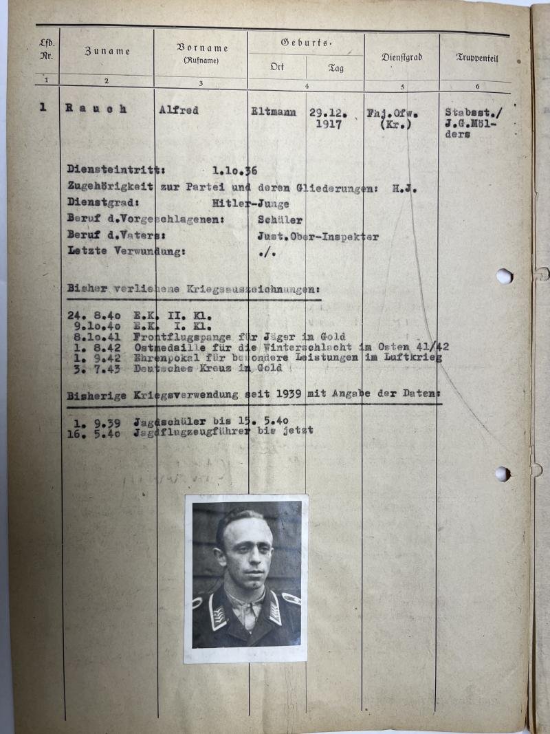 KC proposal of 'Fahnenjunker-Oberfeldwebel' Alfred Rauch who served within Stabstaffel 'Jagdgeschwader Mölders'.The proposal shows 52 aerial victories ,34 'Tiefangriffe' (deep attacks) and 102 'Jabo-Einsätze' (Jagdbomber missions)!!!!Unbelievable what these men achieved!?The proposal has been signed 6 times by 'Leutnant' and 'Staffelführer' Wilhelm Hübner ( 'Ehrenpokale' 8-5-1944 ,DKiG 1-10-1944,RK 28-2-1945)With 62 aerial victories ,Hübner was KIA on 28-2-1945!!Great example of KC proposal with seldom seen info on subject!?!