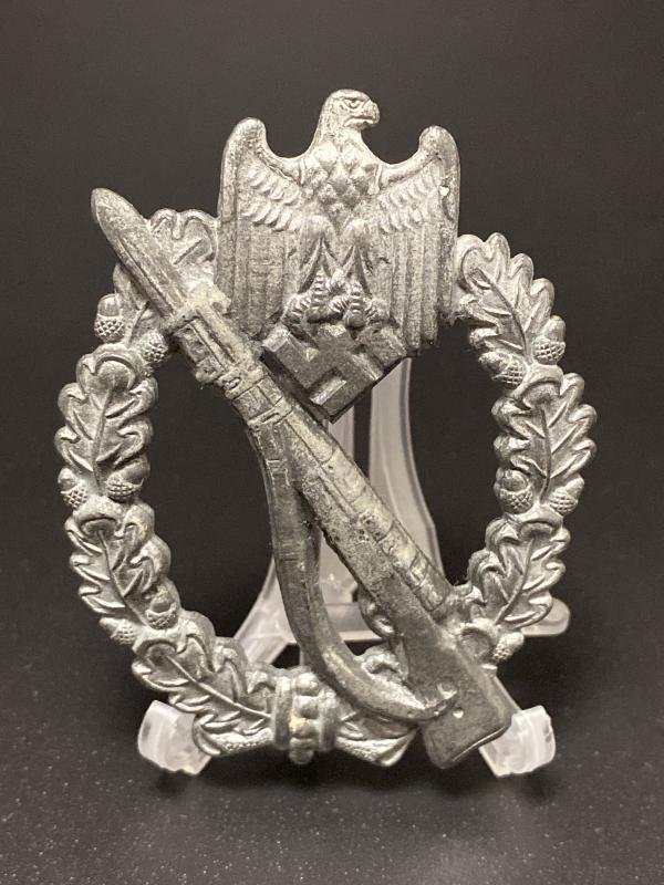 Original Silver Infantry assault badge made by BSW. Rare Crimped hinge and hook example. A nice badge.