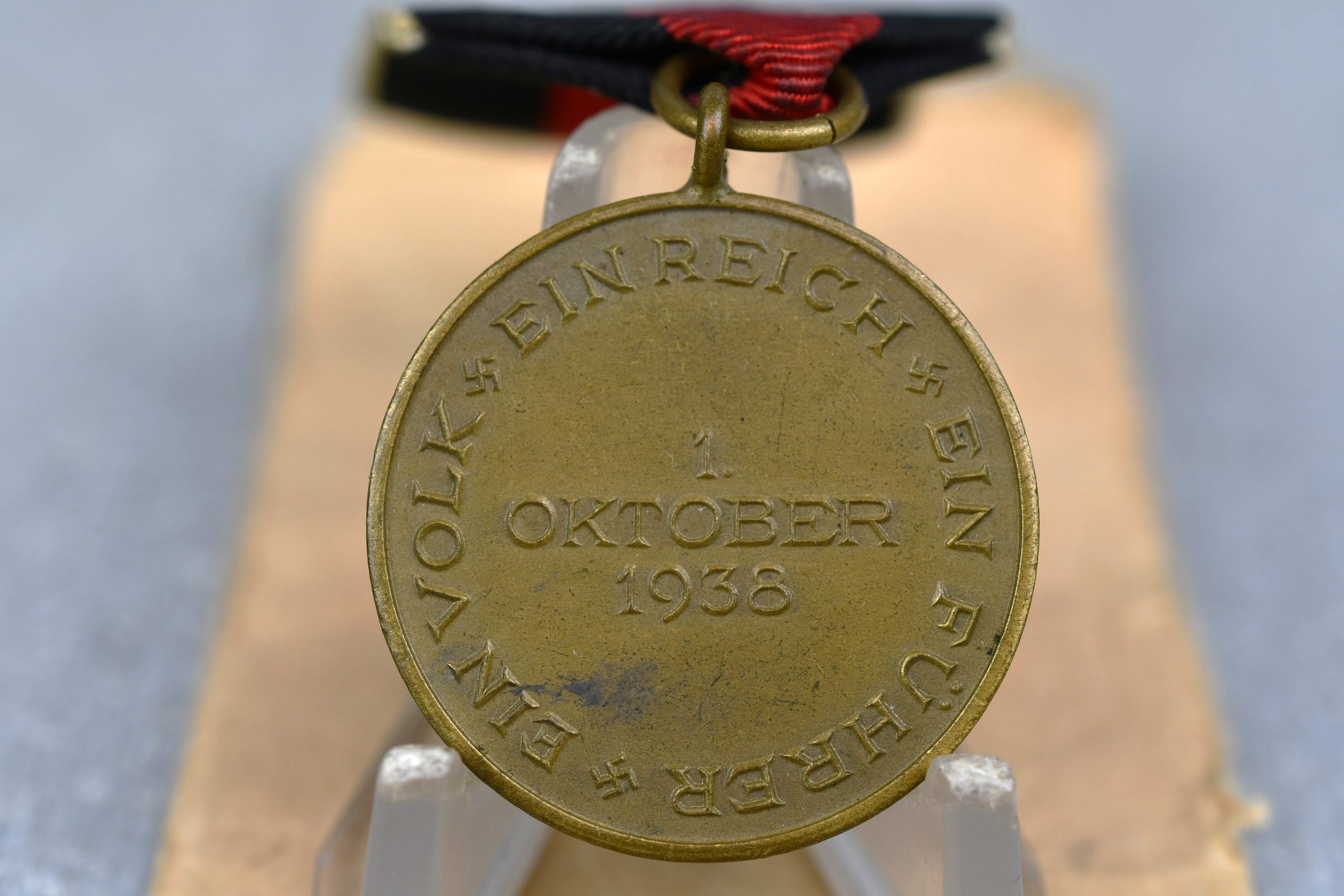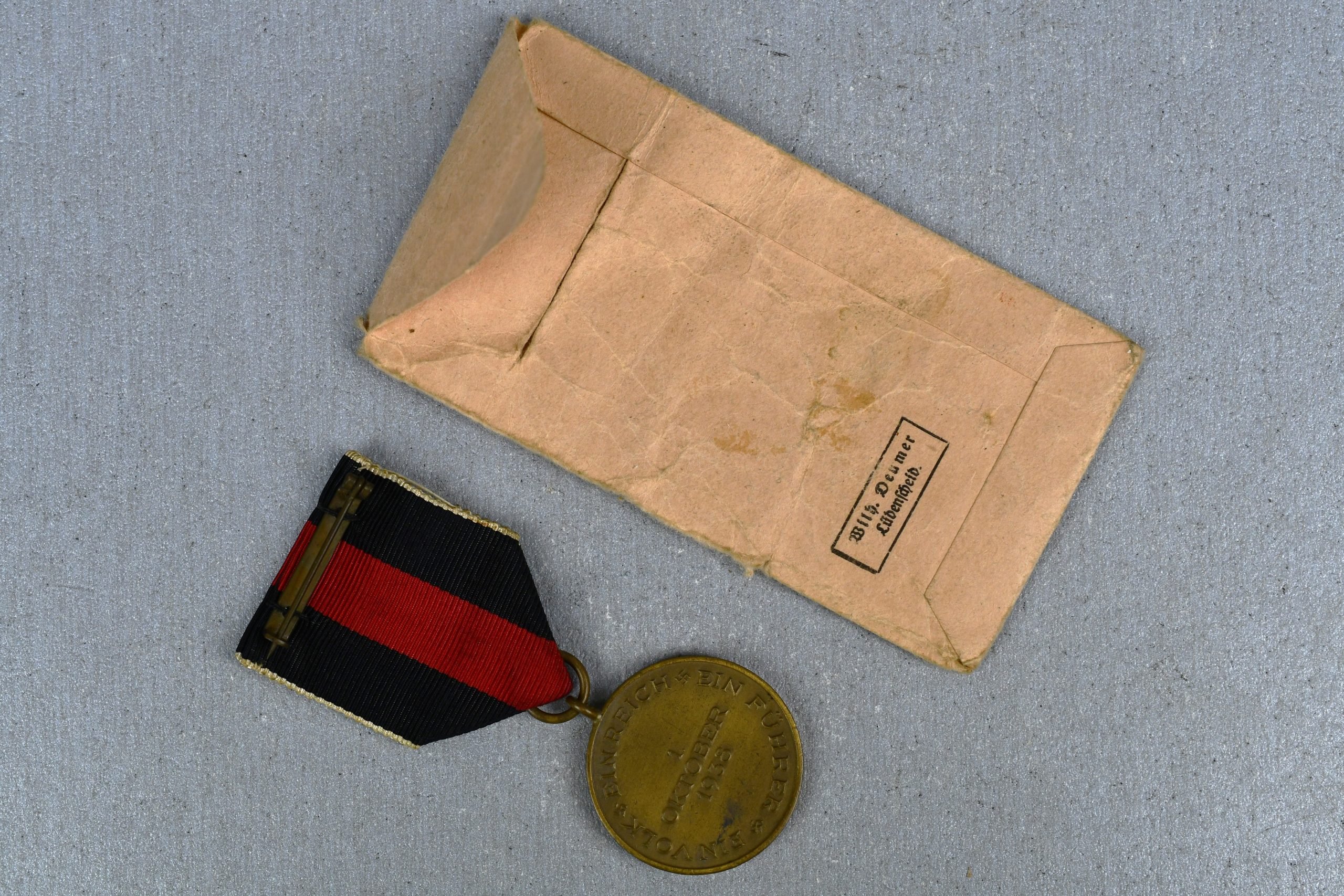 Sudetenland occupation '1 Oktober 1938' medal with award envlope by W. Deumer