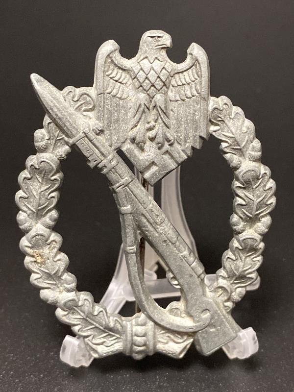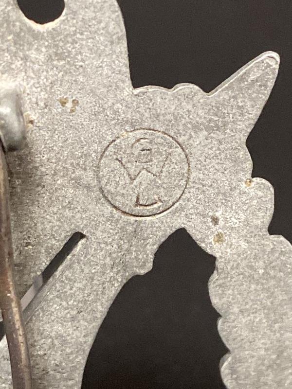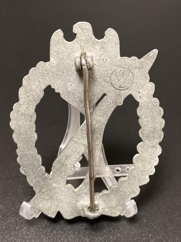 Original Silver Infantry Assault Badge made by GWL with makers mark present. Some of the silver finish remains. Correct pin, hinge and hook assembly for the factory.