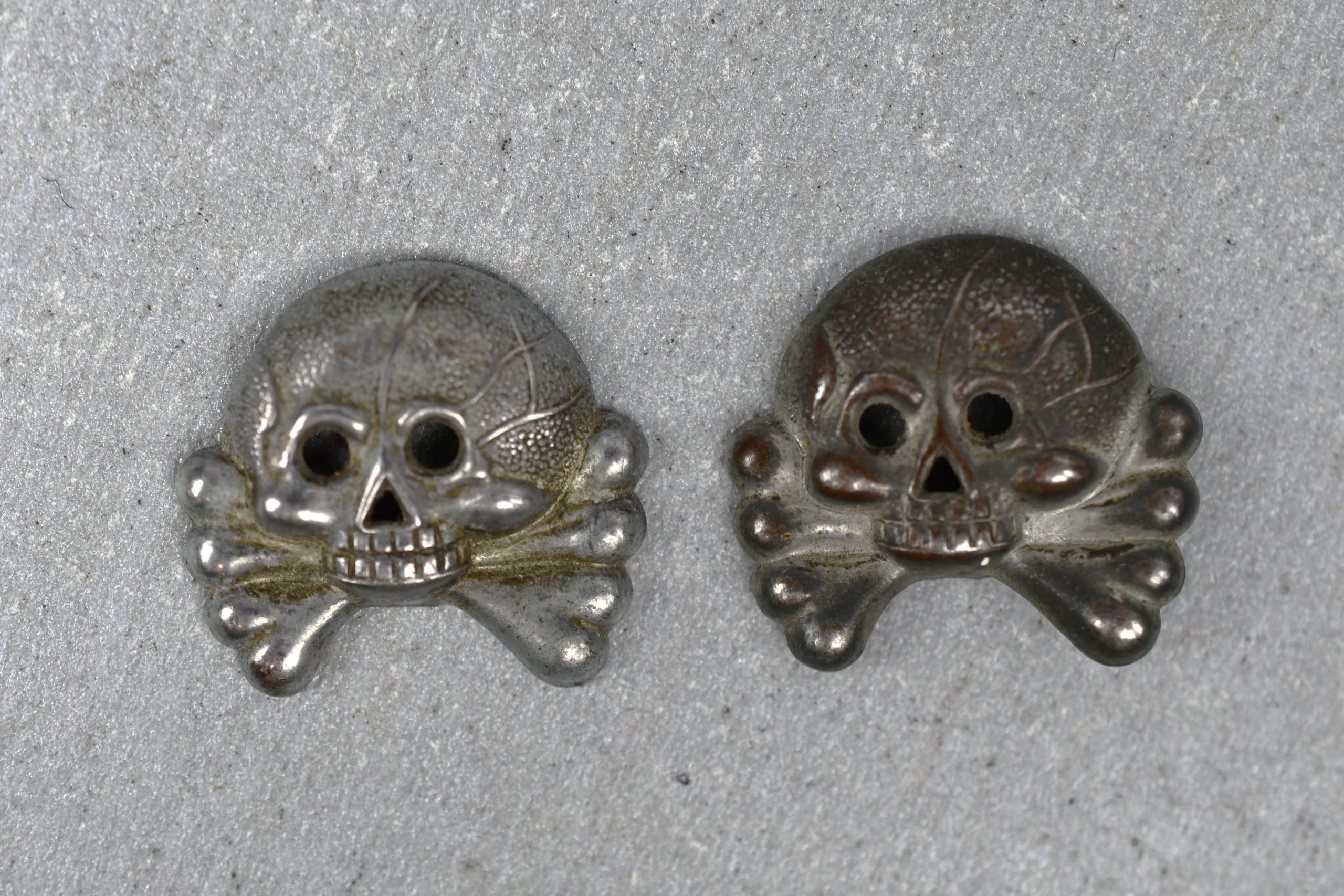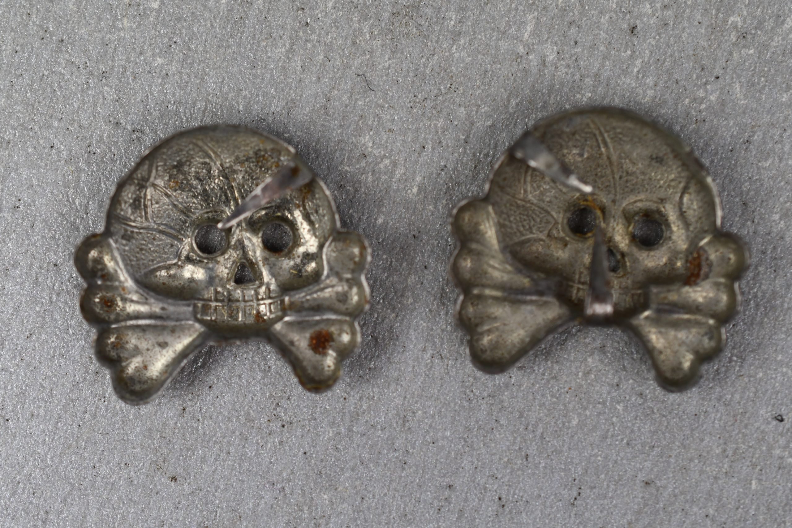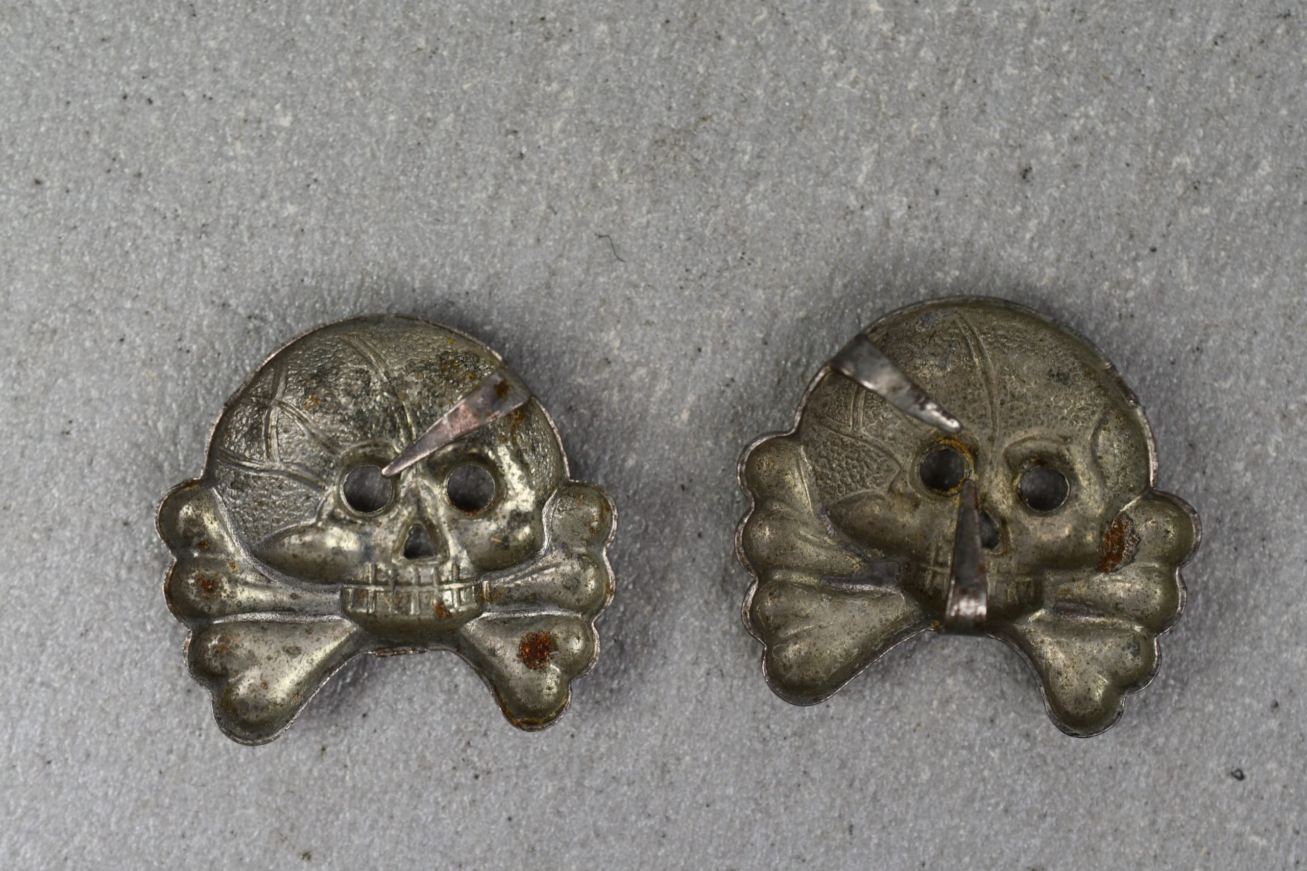 Genuine mid war zinc constructed panzer skulls for the collar tabs in good condition. Some of the prongs are still intact. Show nice and sharp details!