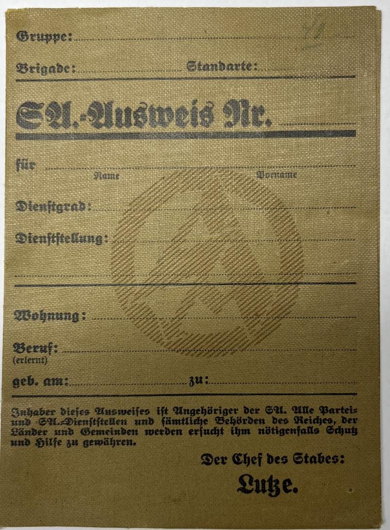 Linen based 'SA-Ausweis' (I.D.) in unused condition.