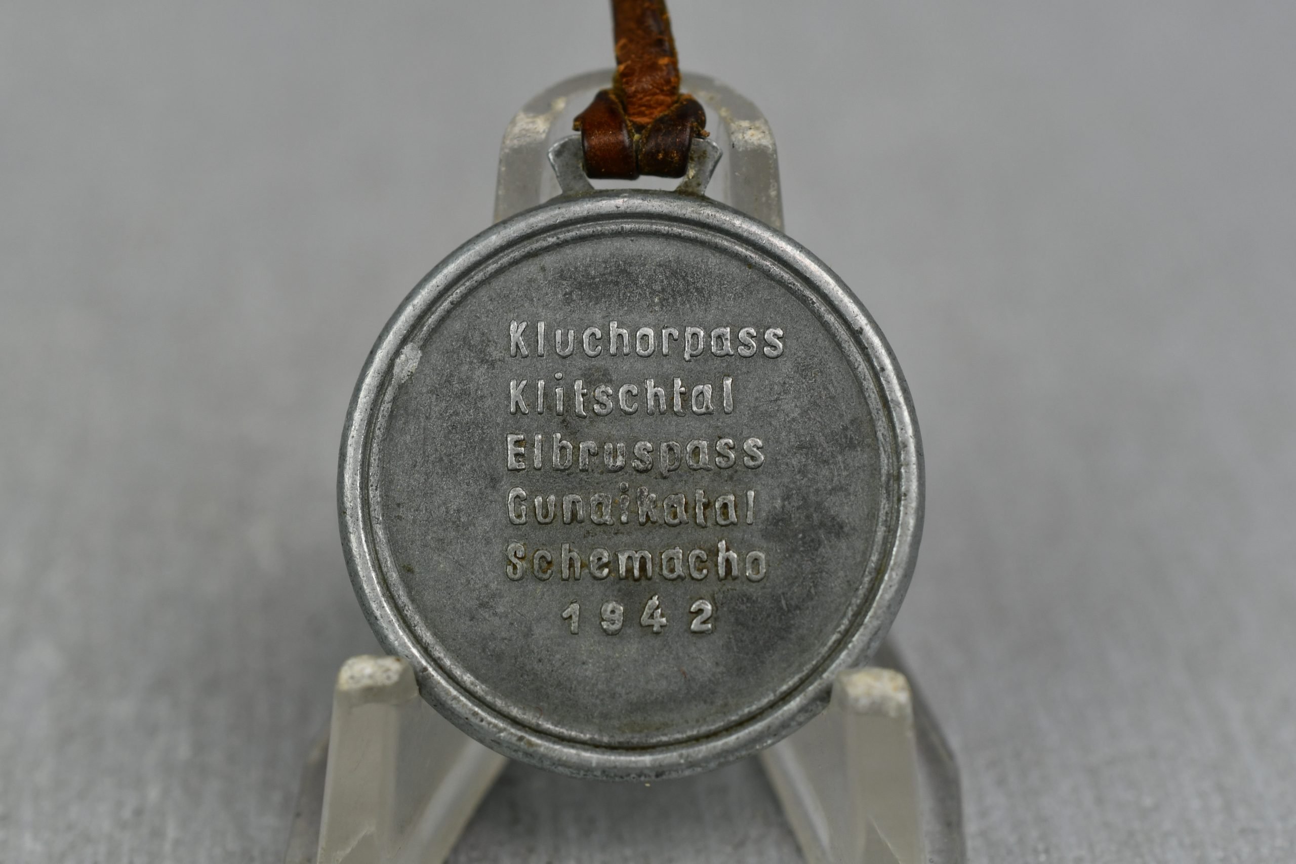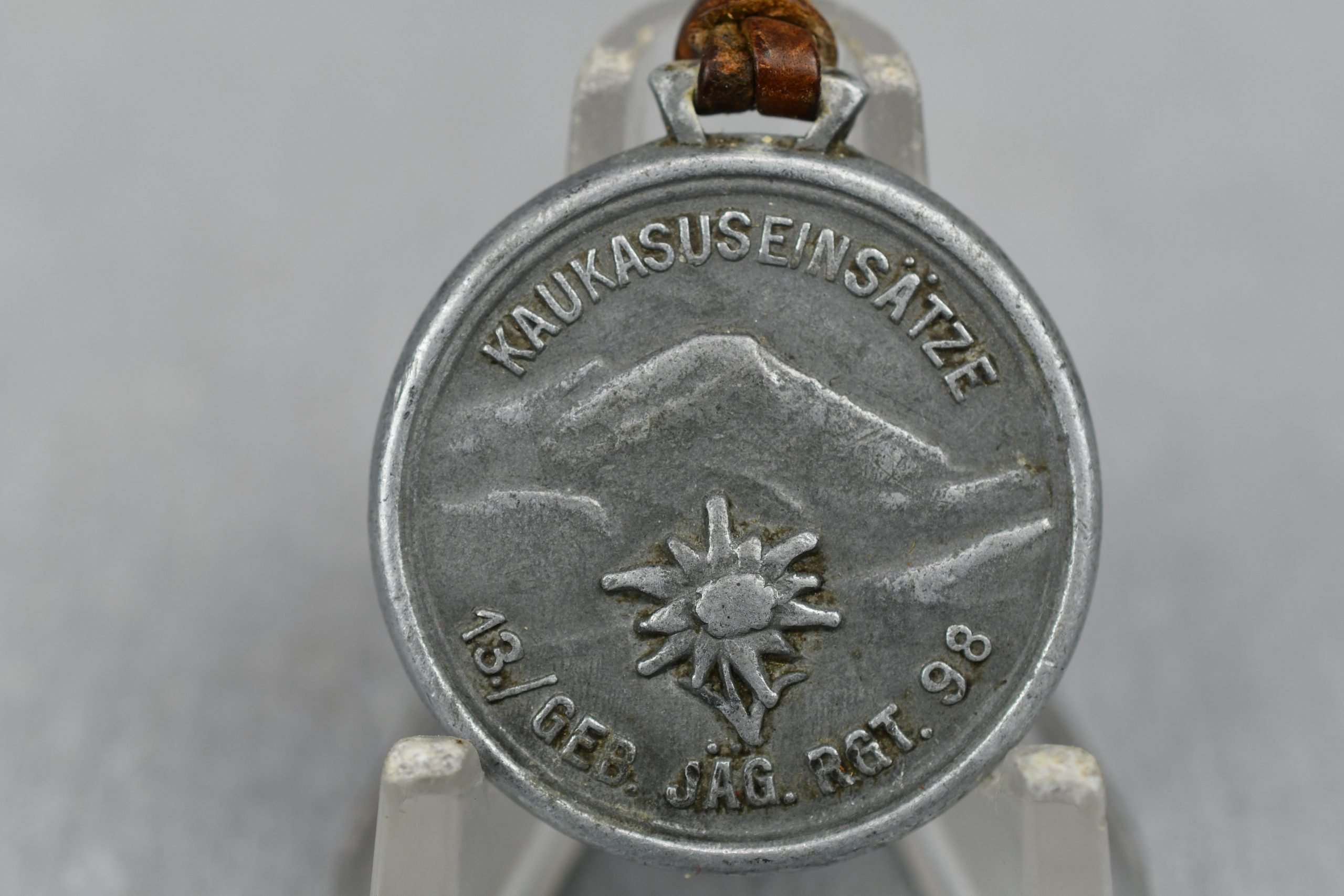 Gebirgsjäger commemorative medal in good condition. Rarely seen example of the famous Gebirgsjäger-Regiment 98 (13th company), awarded for those who served in the Russian Caucasus Mountains 'Kaukasuseinsätze' in 1942. The reverse shows different valleys in those mountains where they served; Kluchorpass, Klitschtal, Elbruspass, Gunaikatal, Schemacho. Complete with genuine leather hanger attached.