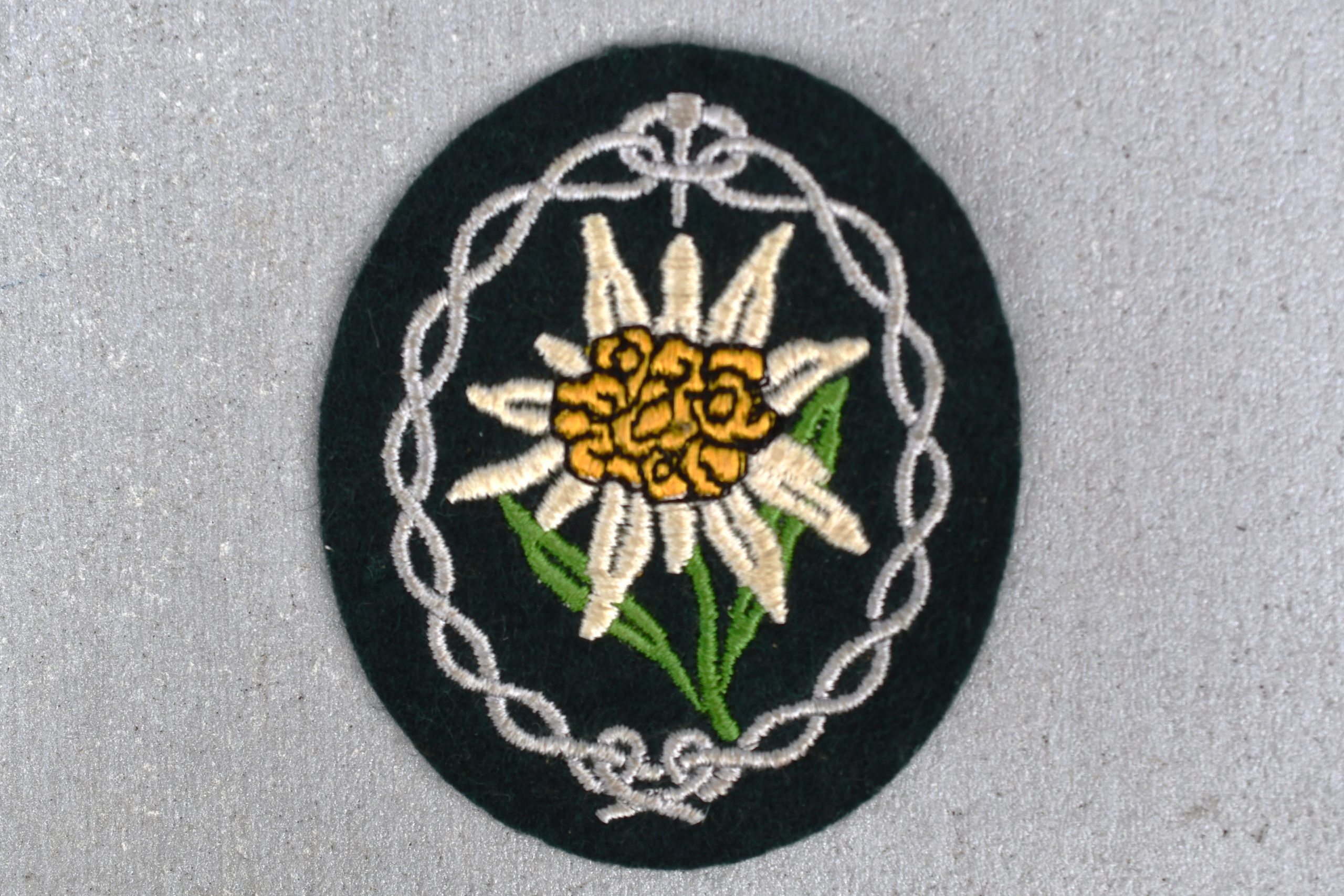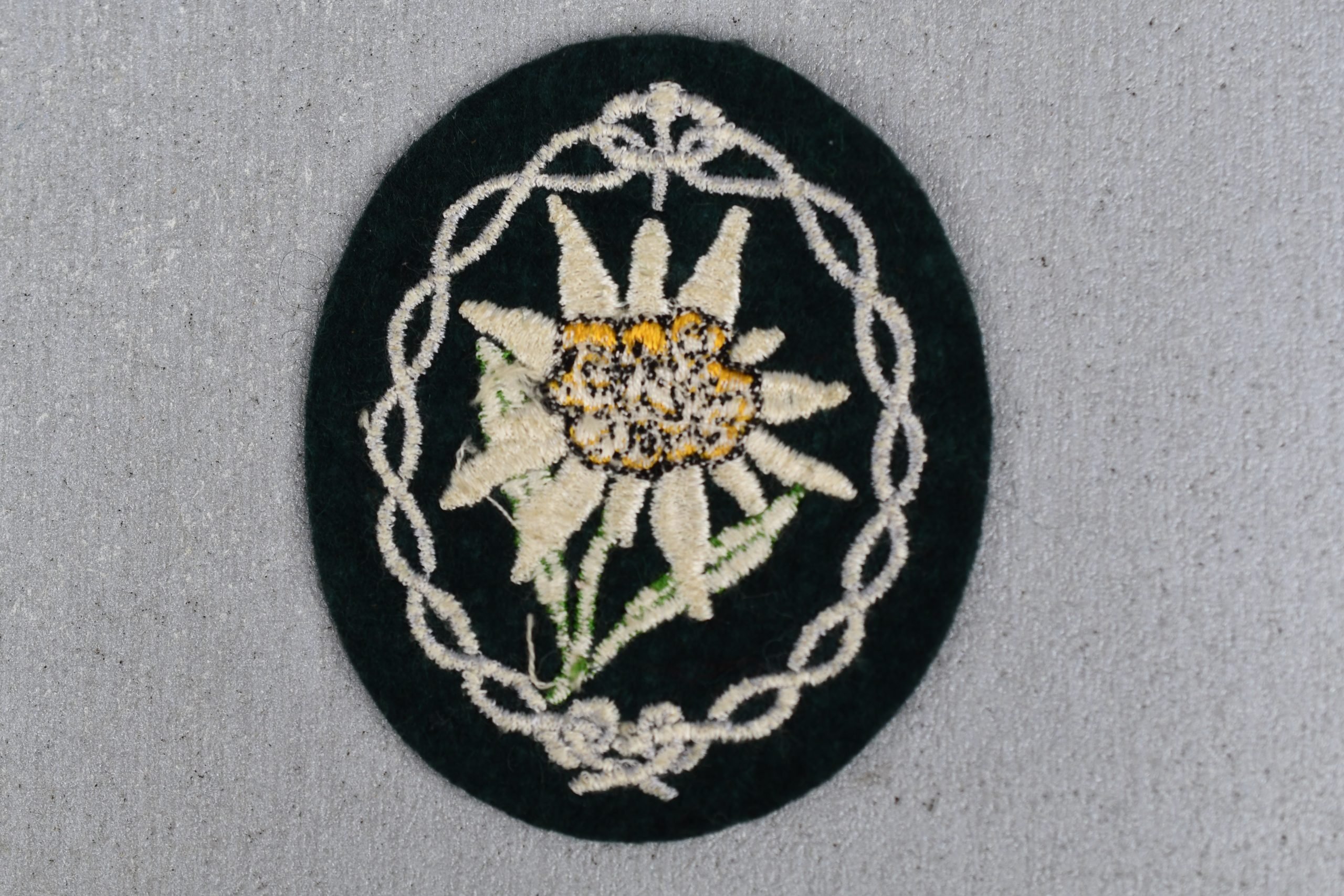 Unissued and MINT, genuine mountain trooper sleeve badge picturing an Edelweiss flower. Embroidered standard issue example on dark green wool.