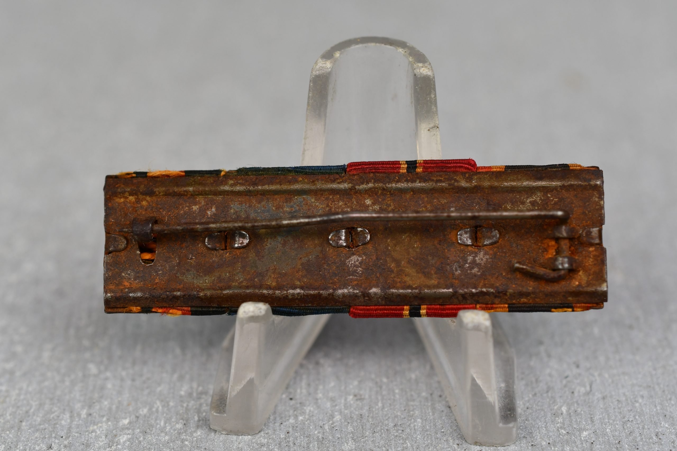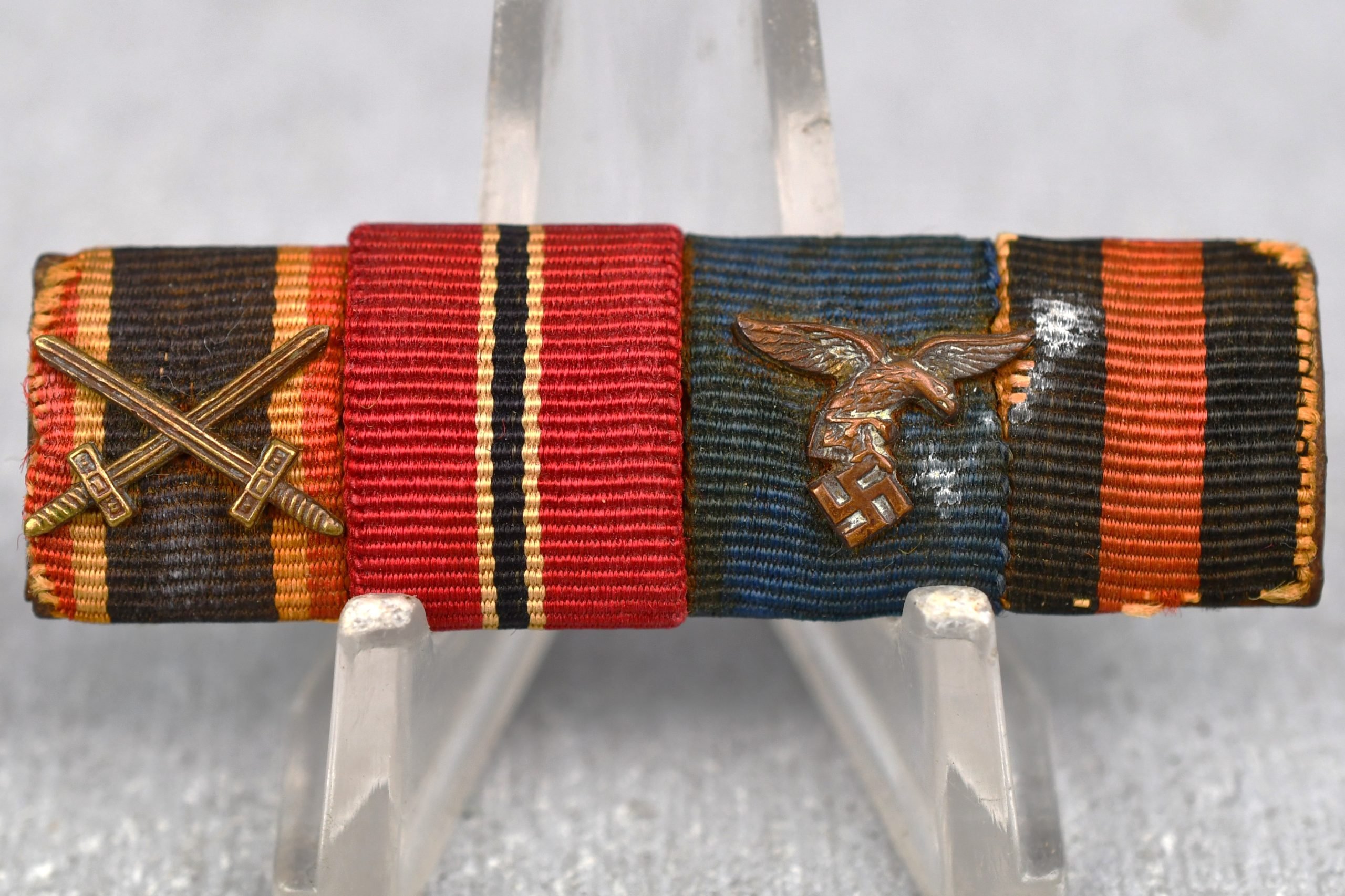 Interesting and rarely seen Luftwaffe 4-piece ribbon bar showing a War Merit Cross 2nd class with swords (Kriegsverdienstkreuz), Eastern Front Medal (Ostmedaille) Luftwaffe long service award, Sudetenland annexation medal.