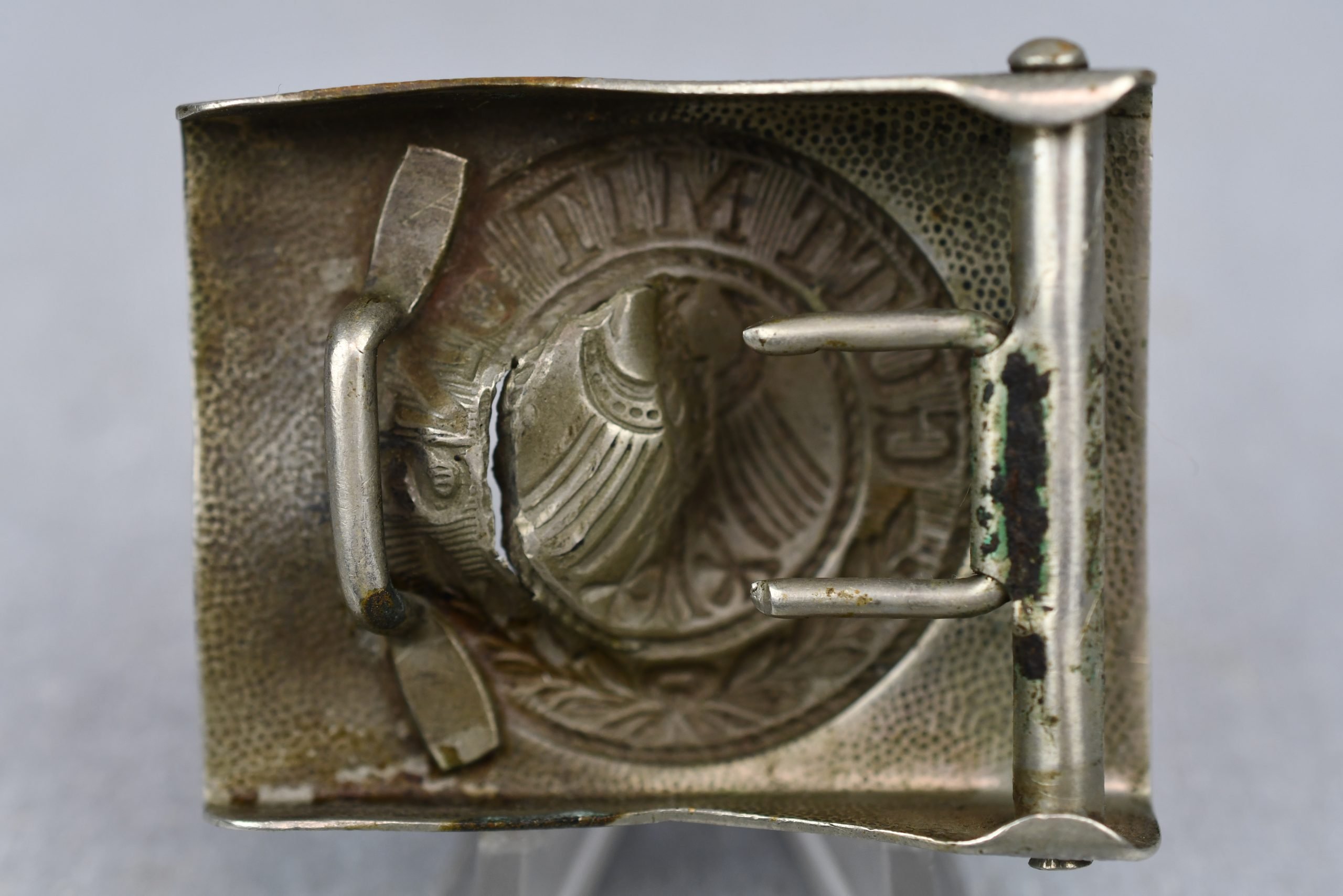 Very rare and desirable brass/nickle silver Reichsheer belt buckle in worn condition. Shows a bullet/shrapnel impact.