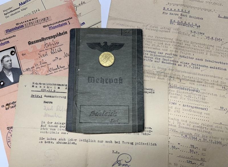 Wehrpass of 'Gefreiten' Karl Schleich who served within diverse units.The most interesting unit is: Nachrichten Btl.Afrika.Schleich entered Africa somewhere July 1942 and seems to have been in hospital forSchleich was discharged from active service on 2-9-1943.2) 'Ausmusterschein' (discharge document) of Schleich