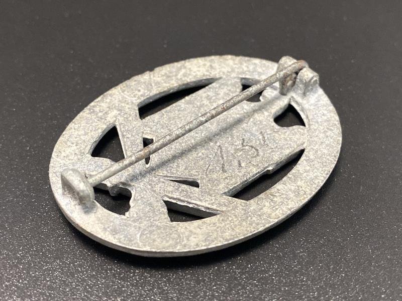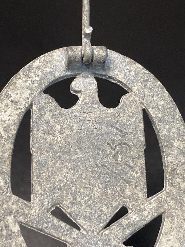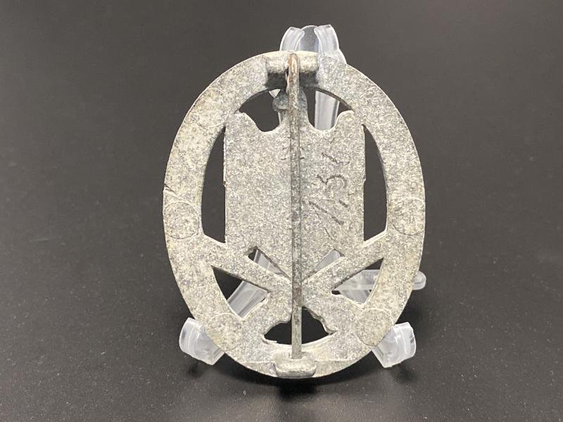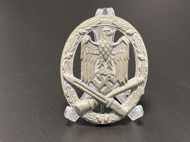 Original late war General Assault Badge made by Assmann marked '1'. Nice piece with die marks on the reverse. Correct pin, hinge and hook set up.