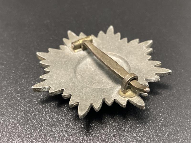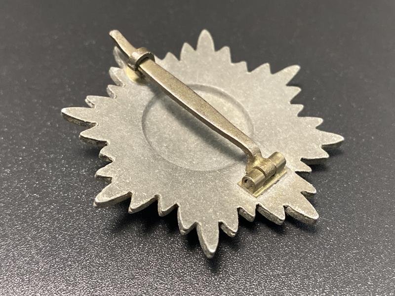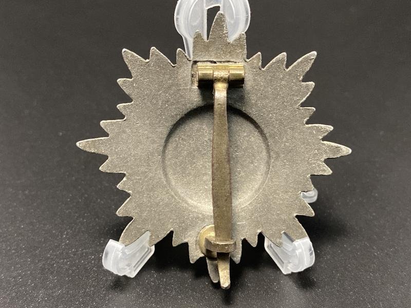 Original WW2 issue Ostvolk medal without swords first class in silver. Award constructed of zinc with silver finish. Complete with correct factory assembled pin, hinge and hook on the reverse. Canadian veteran bring back.