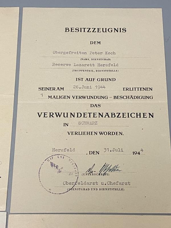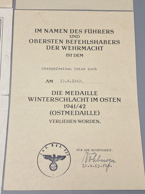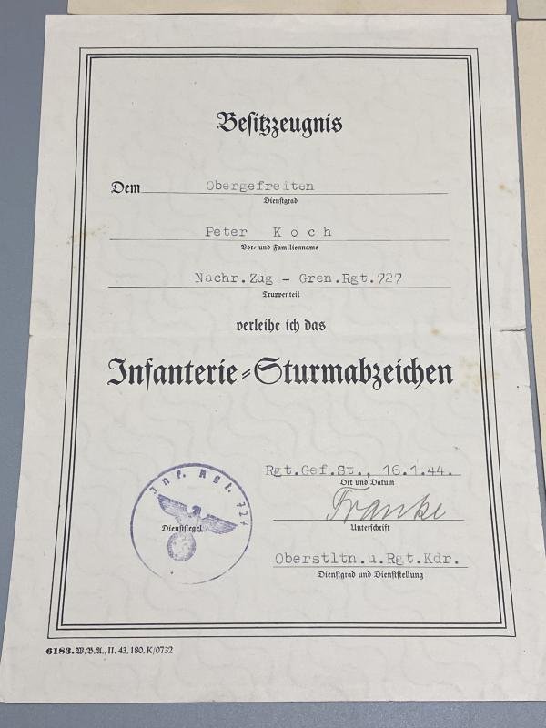 Original grouping of four citations to Obergefreiter Peter Koch of Grenadier Regiment 727 who were attached to 707 Infantry division operating in Russia with order police crushing resistance and being involved heavily with war crimes. Awards present are for the Iron Cross Second Class, Infantry Assault Badge in Silver, Eastern front medal and Wound badge in black. Awards have minor creasing due to age, one small rip in the ISA citation. Apart from this a nice original grouping to a controversial unit.