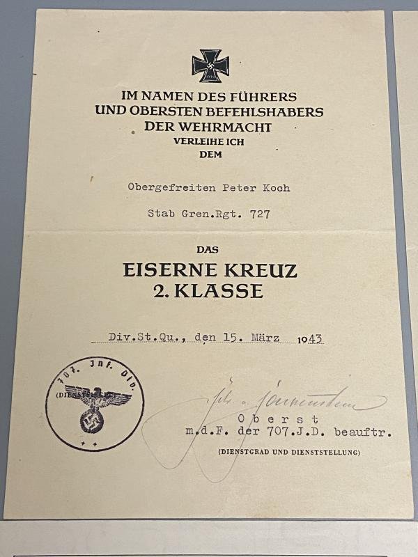 Citation Grouping Obergefreiter Peter Koch Gren.Rgt.727/ 707 Infantry Division