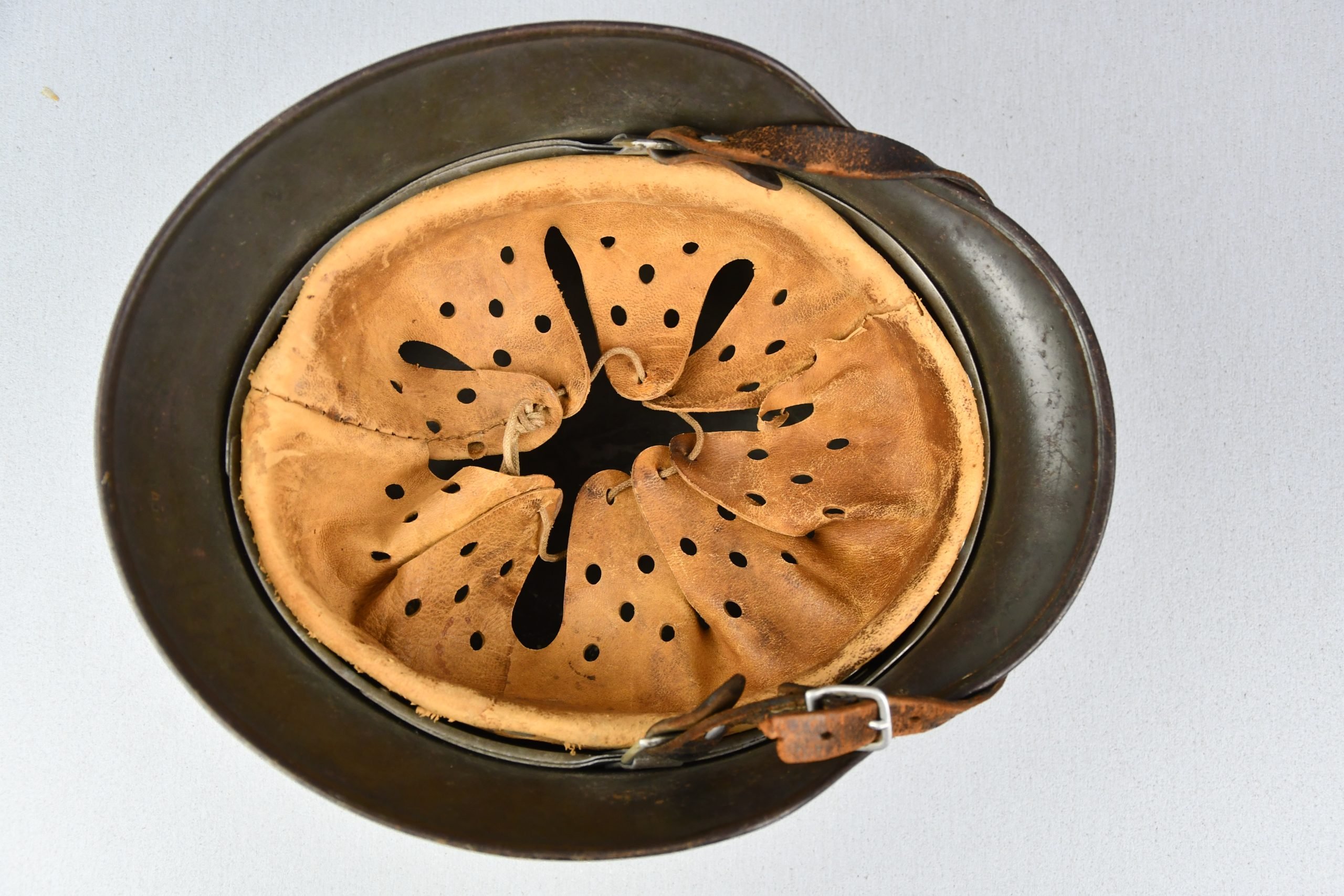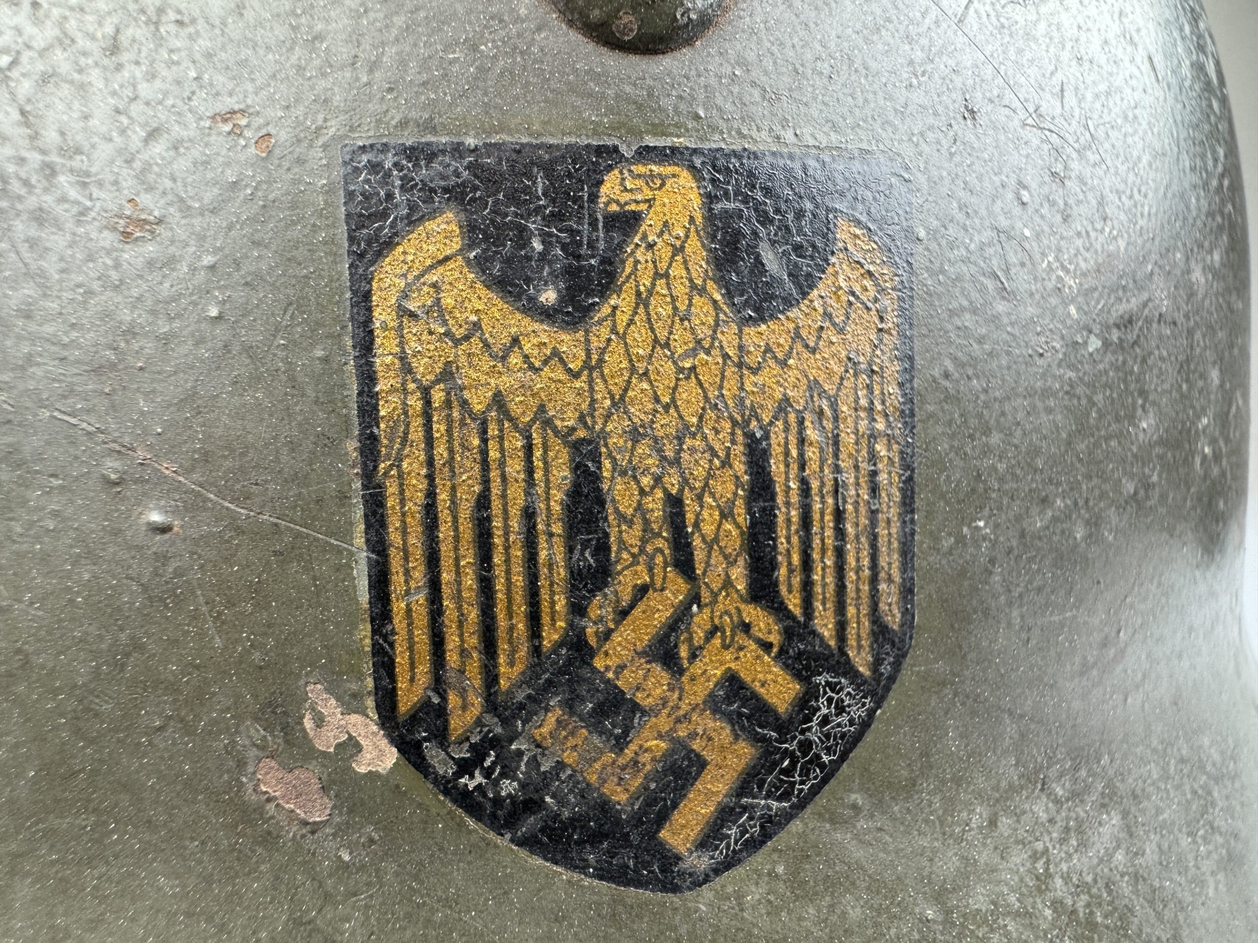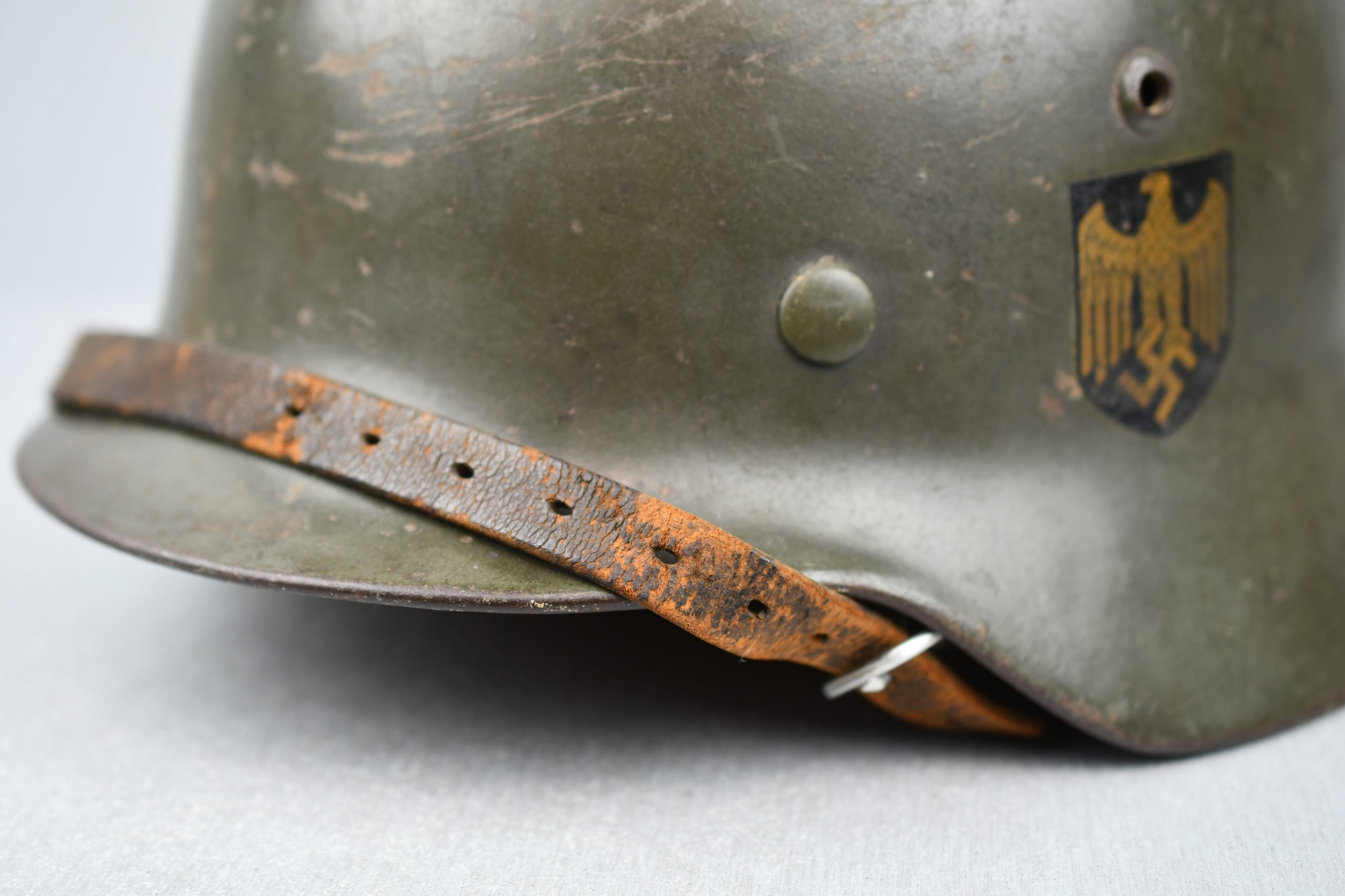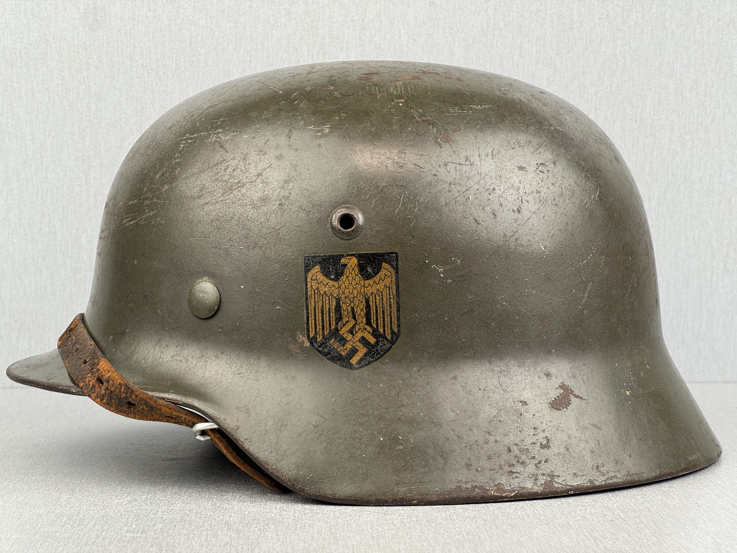 Extremely hard to find early 'apple green' M35 navy helmet. Started as a double decal example, but the tricolor shield was removed per regulations in 1940. The deep gold colored Kriegsmarine ET-pattern eagle sits firmly in place and shows normal wear. Its still retains sharp details. The helmet is covered in the early apple green paint showing average wear. The exterior shows a nice apple green color. Complete with original liner and aluminum band dated 1939. The full length draw string is present, as well is the early chin strap with aluminum buckle (tip broken off). Shell markings; ET66 โ 4579. The lot number database of Brian Ice shows many Kriegsmarine helmets in these 4500 series. Hard to find early KM helmet!