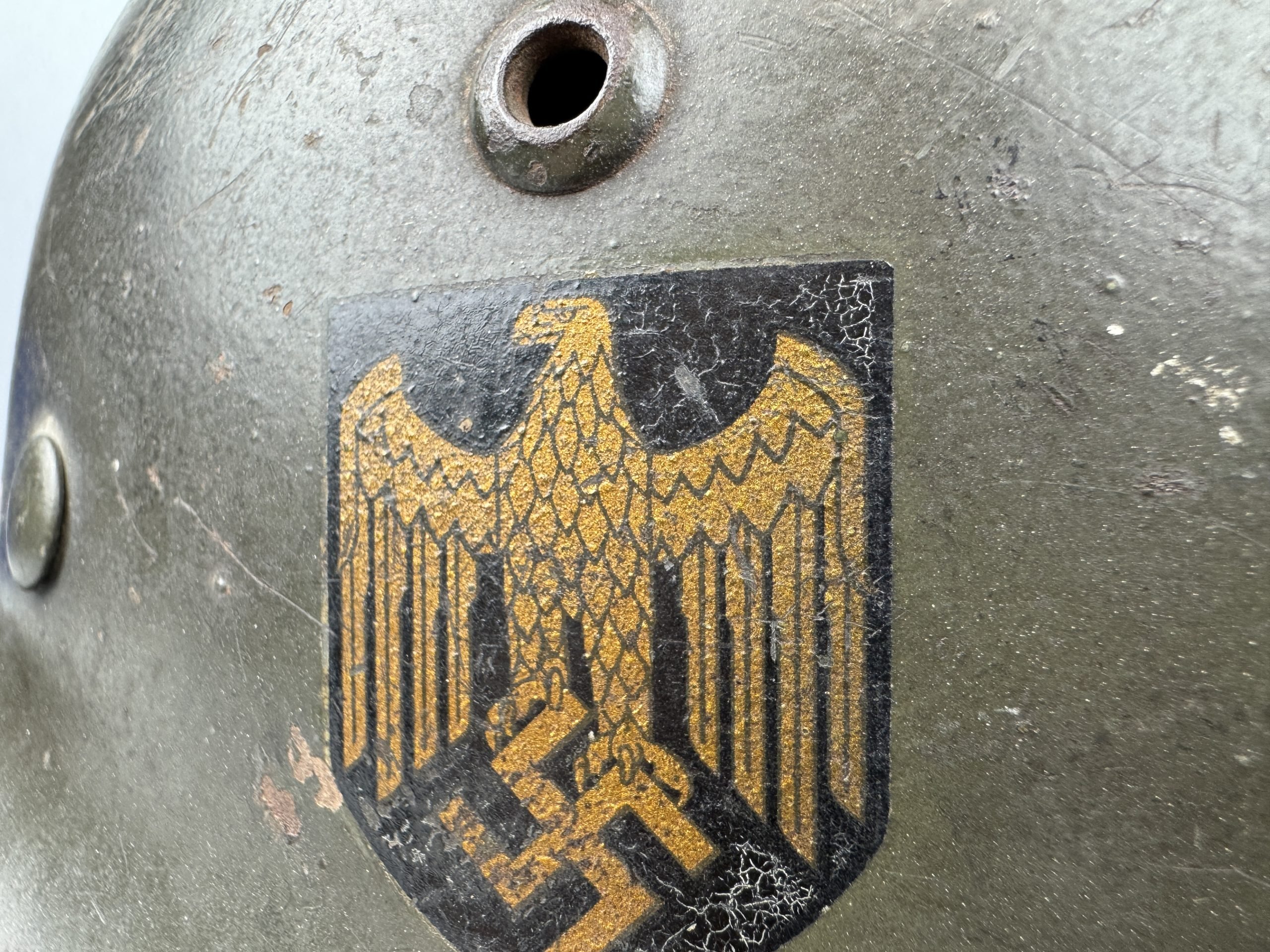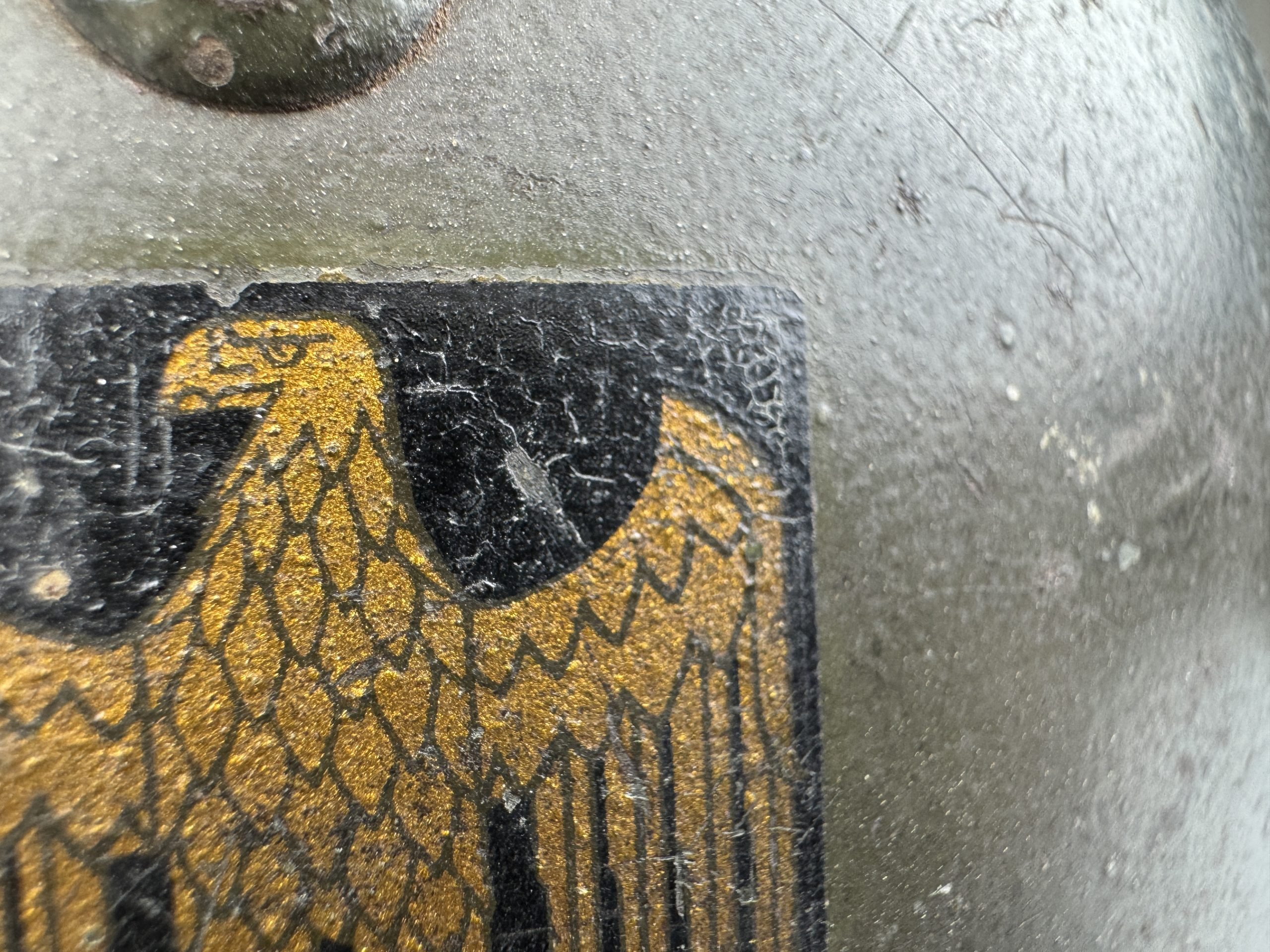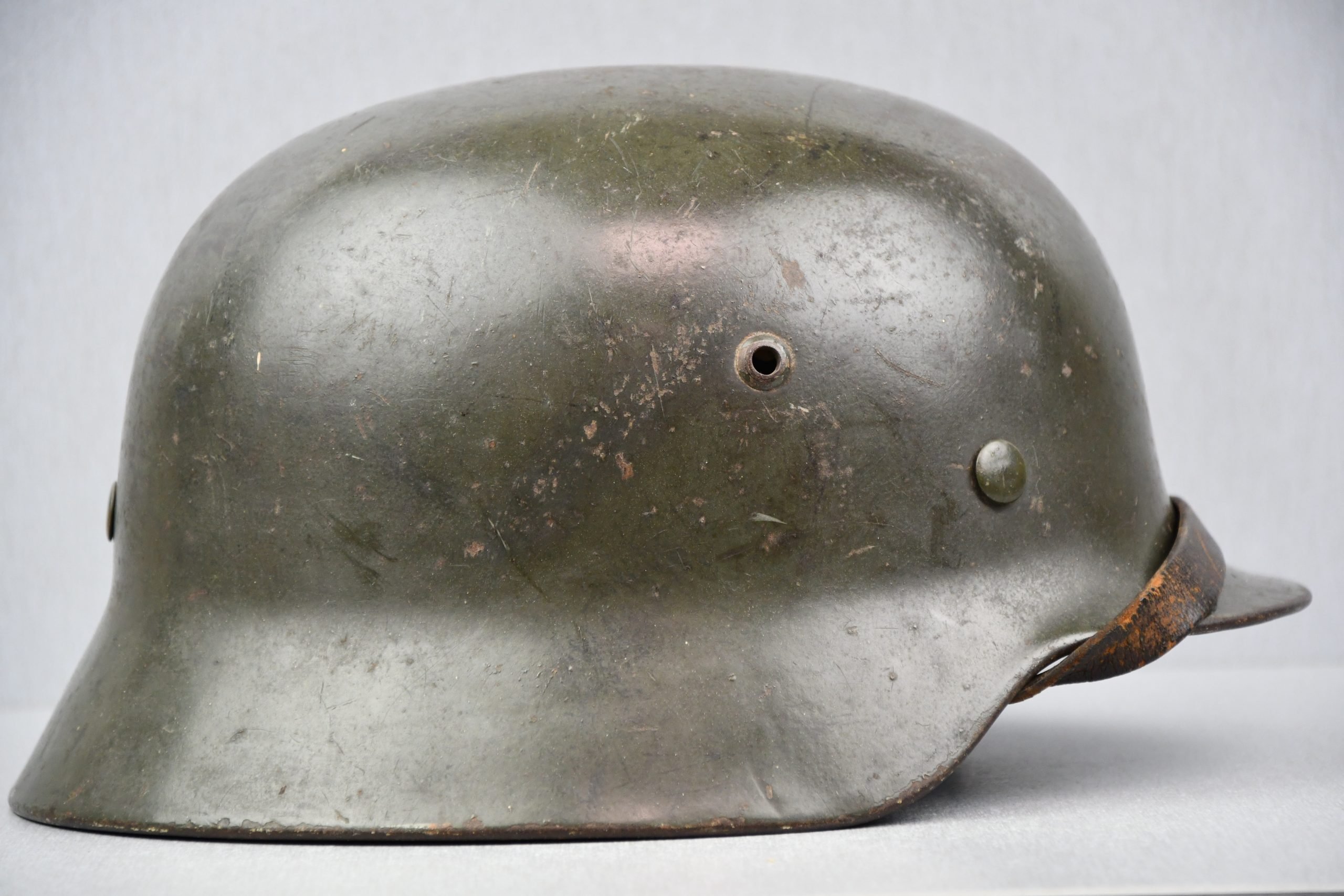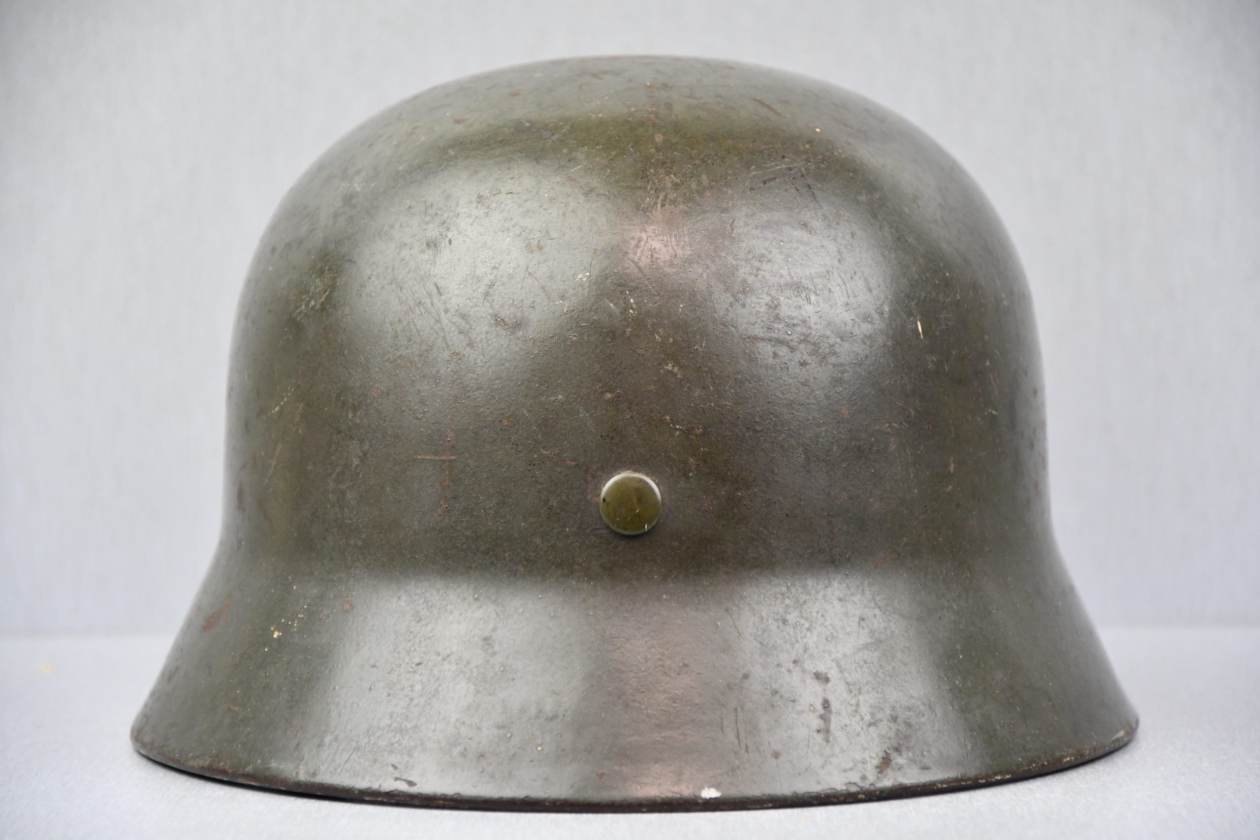 Extremely hard to find early 'apple green' M35 navy helmet. Started as a double decal example, but the tricolor shield was removed per regulations in 1940. The deep gold colored Kriegsmarine ET-pattern eagle sits firmly in place and shows normal wear. Its still retains sharp details. The helmet is covered in the early apple green paint showing average wear. The exterior shows a nice apple green color. Complete with original liner and aluminum band dated 1939. The full length draw string is present, as well is the early chin strap with aluminum buckle (tip broken off). Shell markings; ET66 โ 4579. The lot number database of Brian Ice shows many Kriegsmarine helmets in these 4500 series. Hard to find early KM helmet!