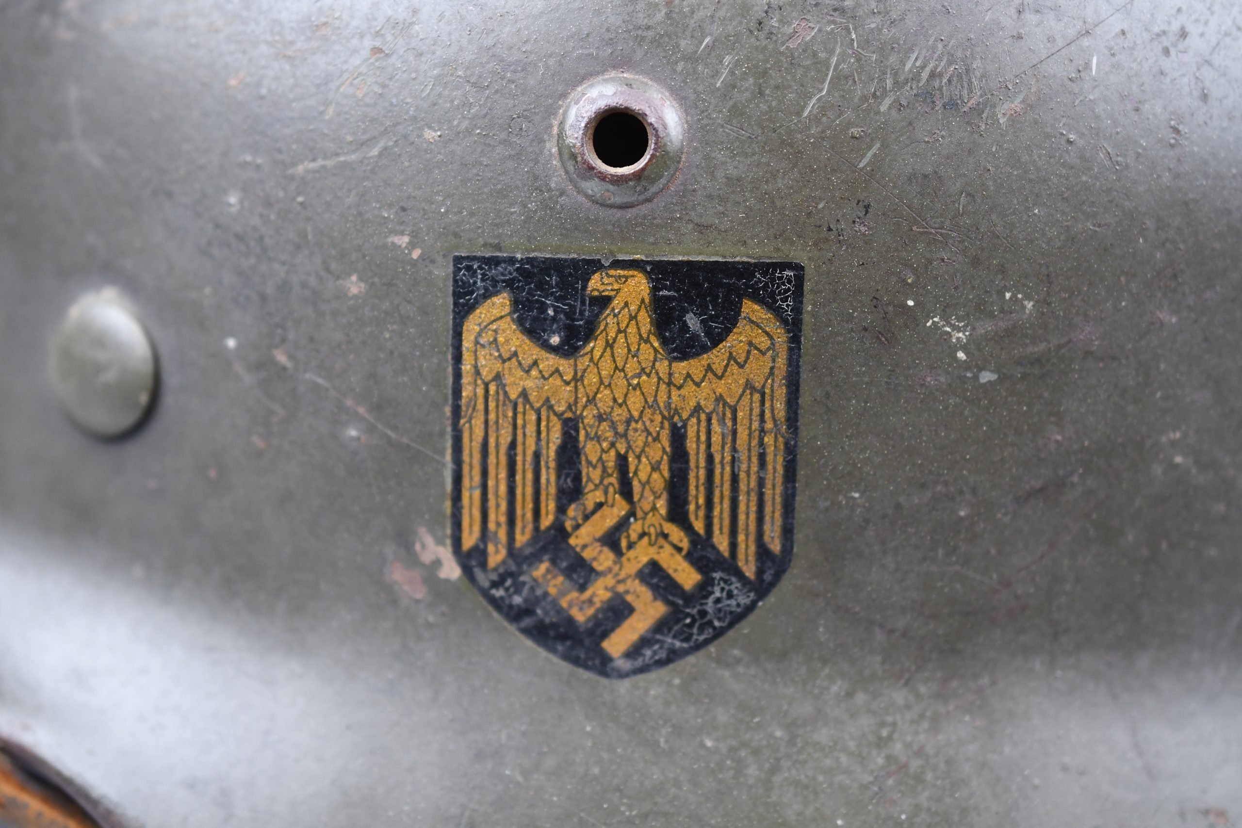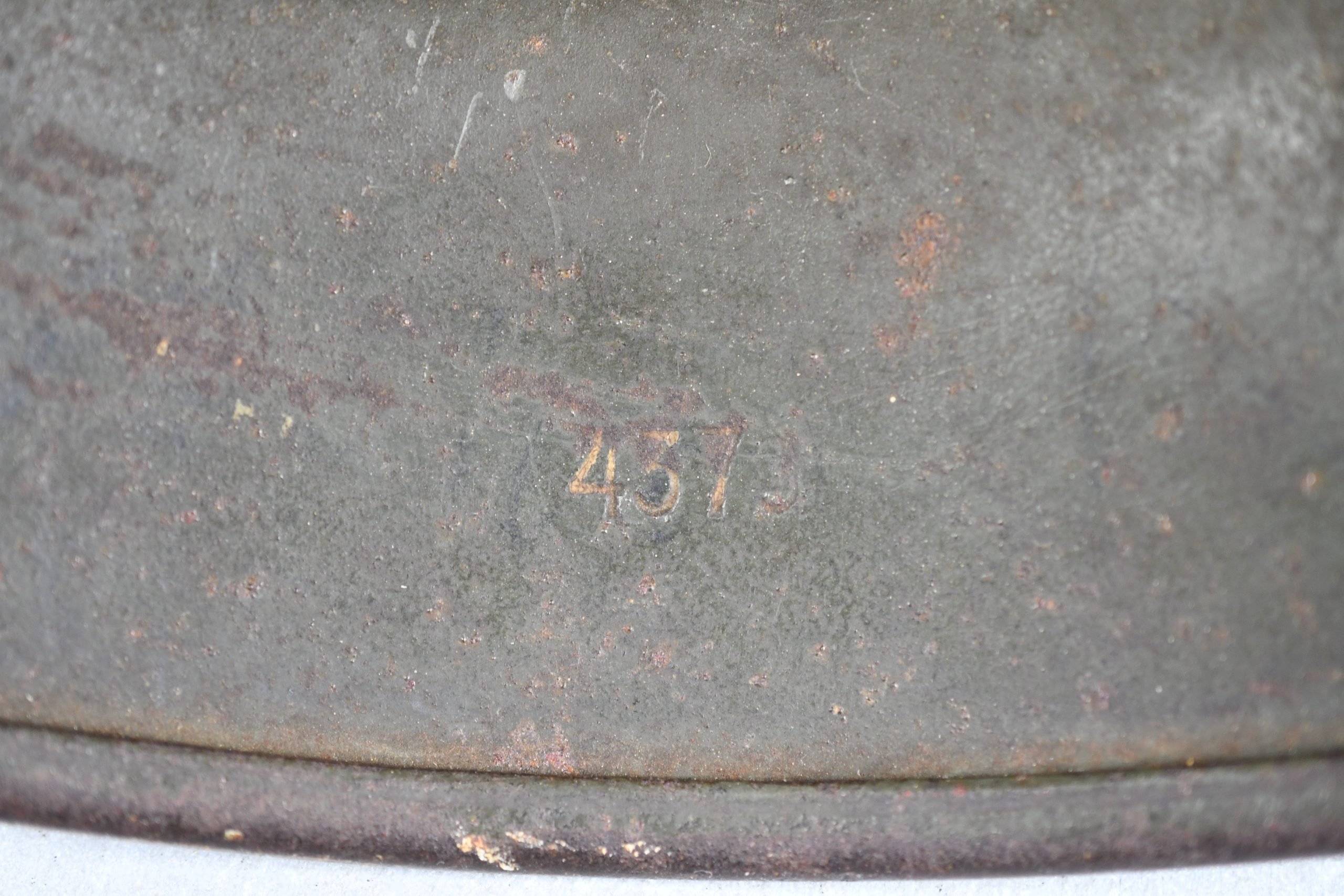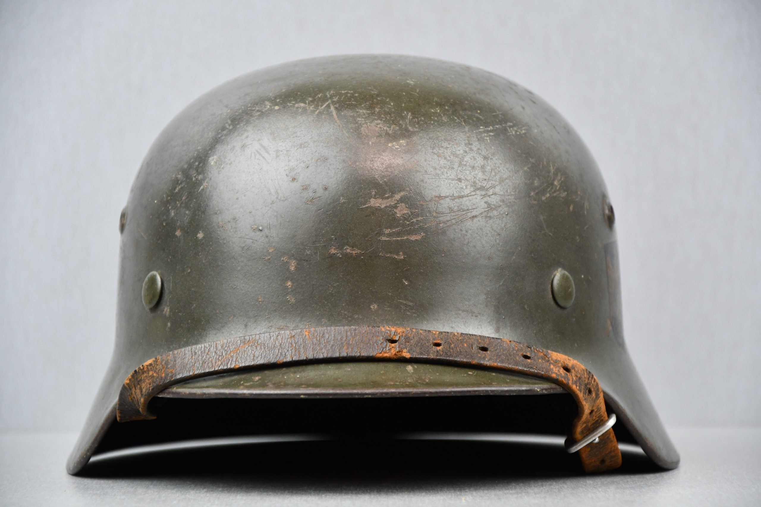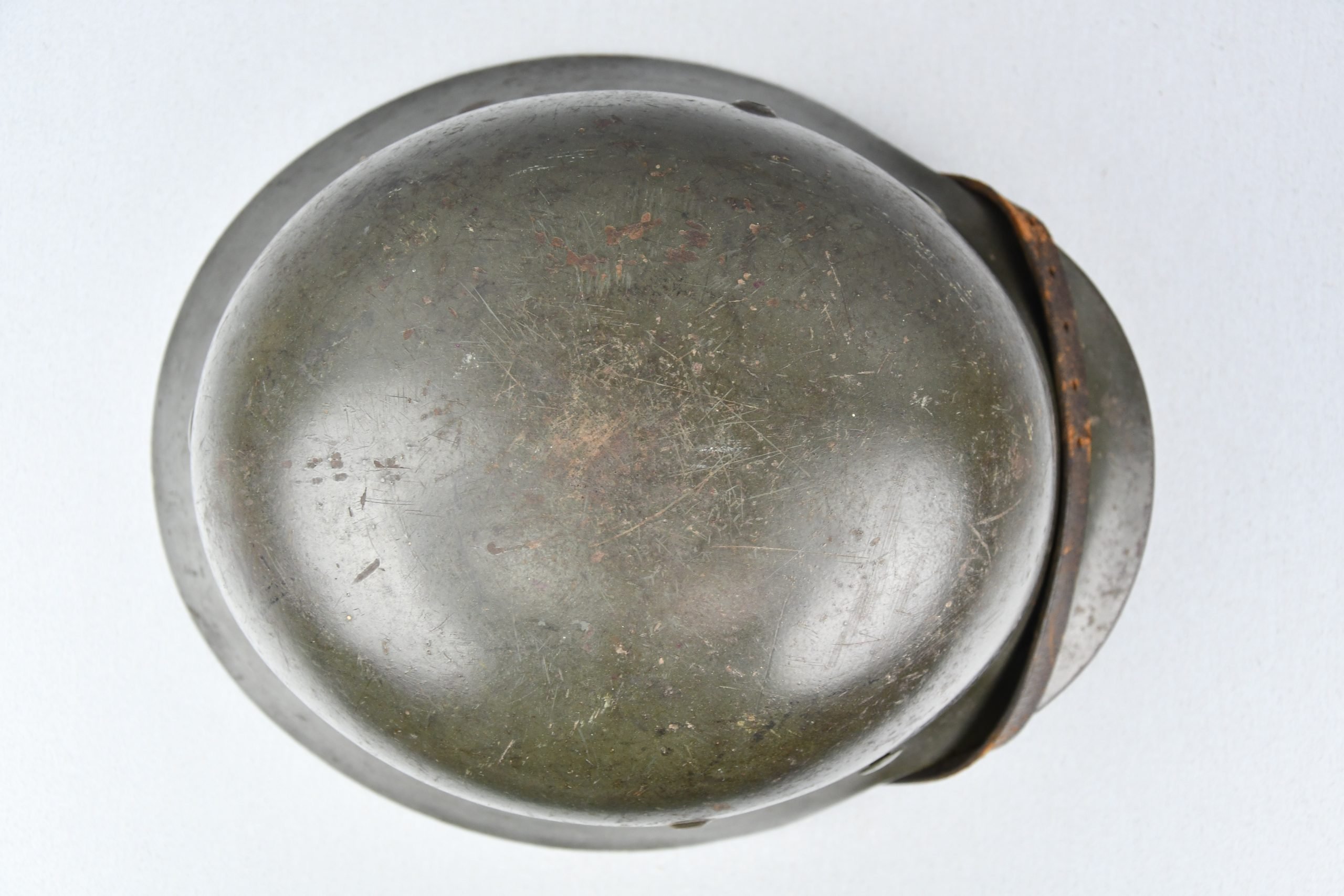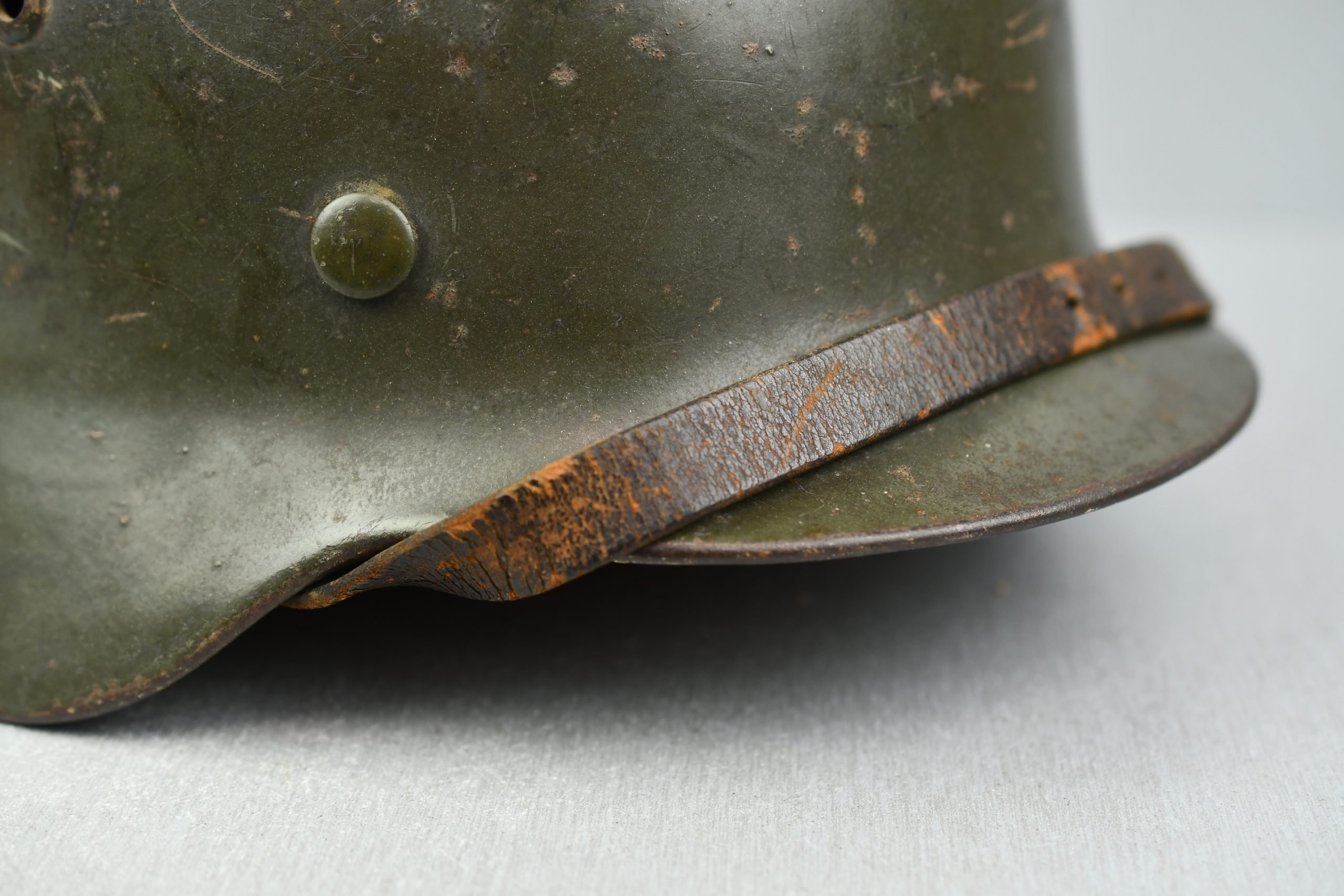 Extremely hard to find early 'apple green' M35 navy helmet. Started as a double decal example, but the tricolor shield was removed per regulations in 1940. The deep gold colored Kriegsmarine ET-pattern eagle sits firmly in place and shows normal wear. Its still retains sharp details. The helmet is covered in the early apple green paint showing average wear. The exterior shows a nice apple green color. Complete with original liner and aluminum band dated 1939. The full length draw string is present, as well is the early chin strap with aluminum buckle (tip broken off). Shell markings; ET66 โ 4579. The lot number database of Brian Ice shows many Kriegsmarine helmets in these 4500 series. Hard to find early KM helmet!