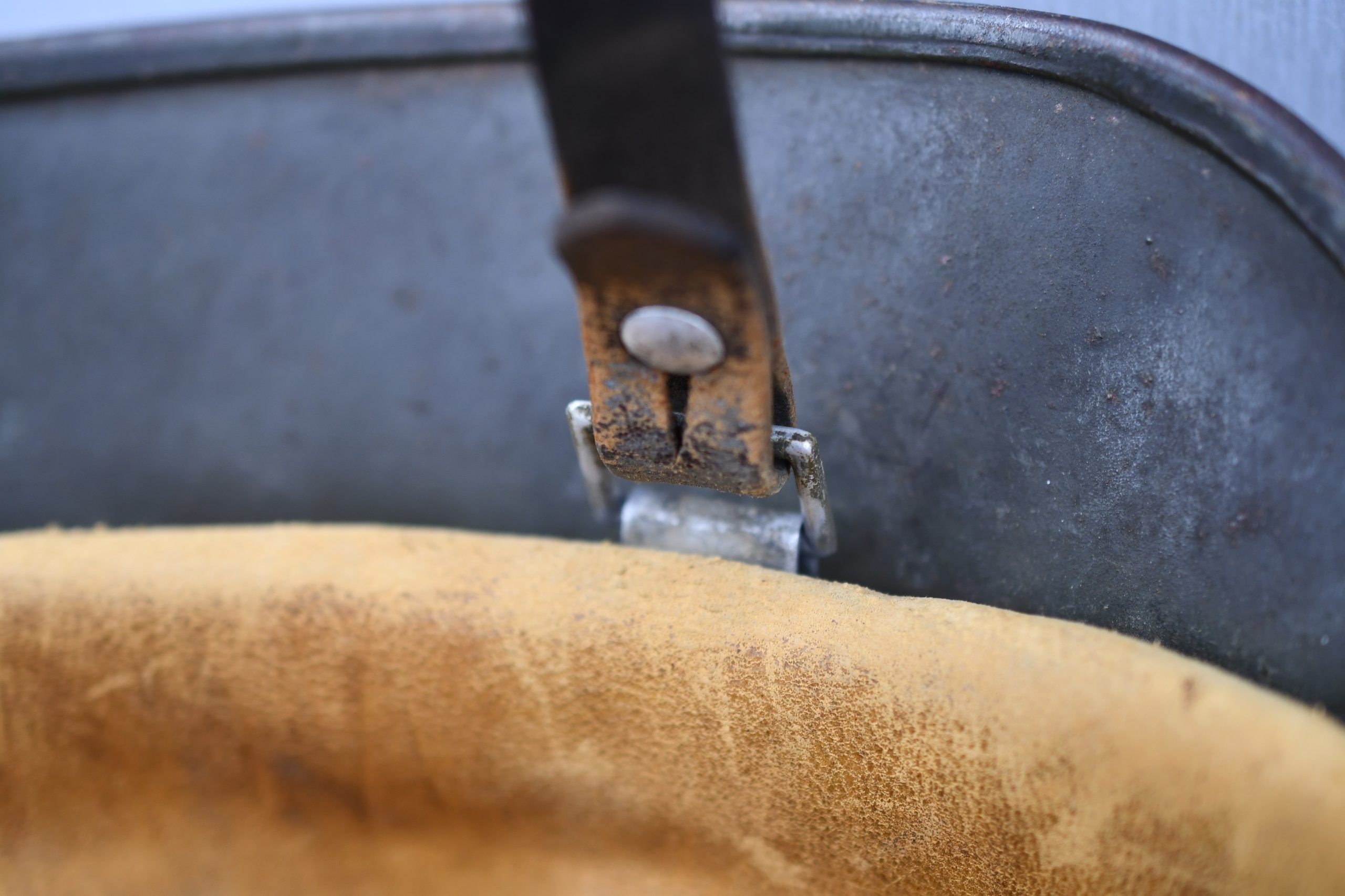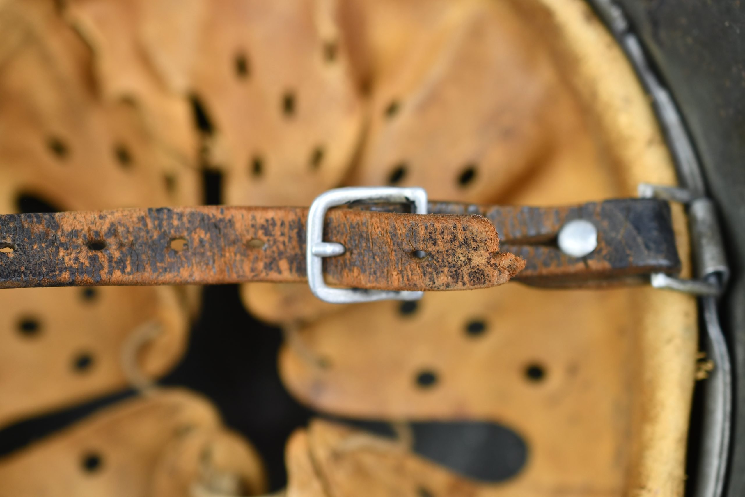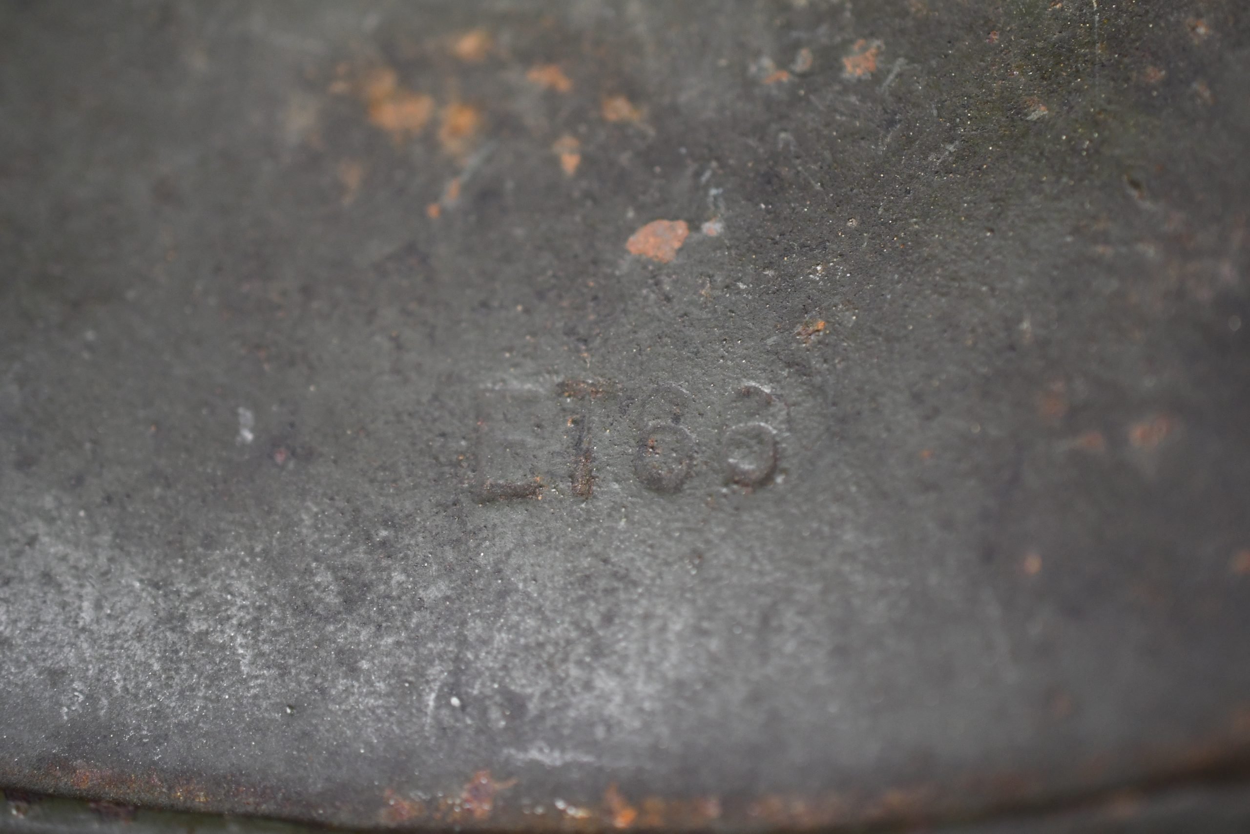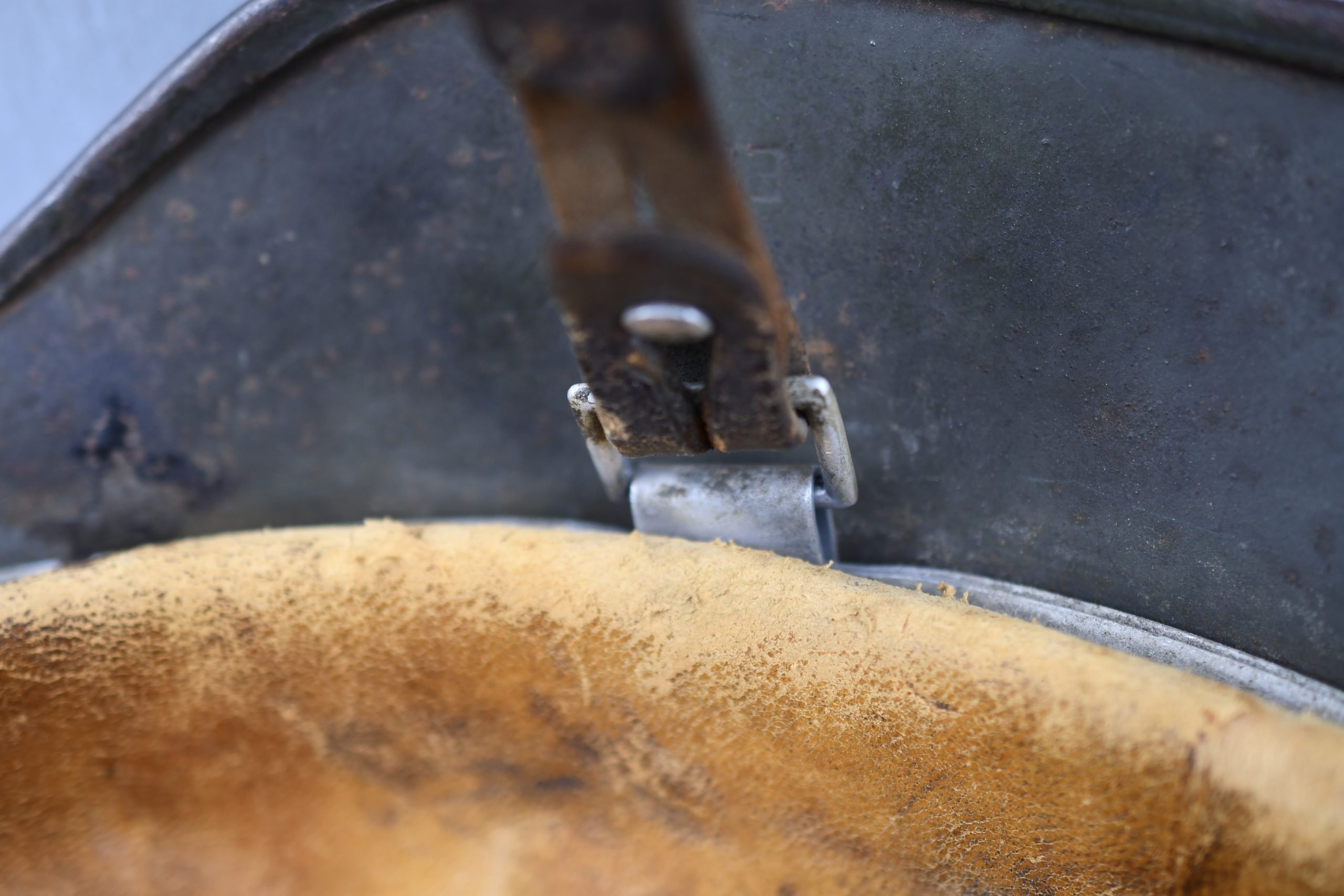 Extremely hard to find early 'apple green' M35 navy helmet. Started as a double decal example, but the tricolor shield was removed per regulations in 1940. The deep gold colored Kriegsmarine ET-pattern eagle sits firmly in place and shows normal wear. Its still retains sharp details. The helmet is covered in the early apple green paint showing average wear. The exterior shows a nice apple green color. Complete with original liner and aluminum band dated 1939. The full length draw string is present, as well is the early chin strap with aluminum buckle (tip broken off). Shell markings; ET66 โ 4579. The lot number database of Brian Ice shows many Kriegsmarine helmets in these 4500 series. Hard to find early KM helmet!