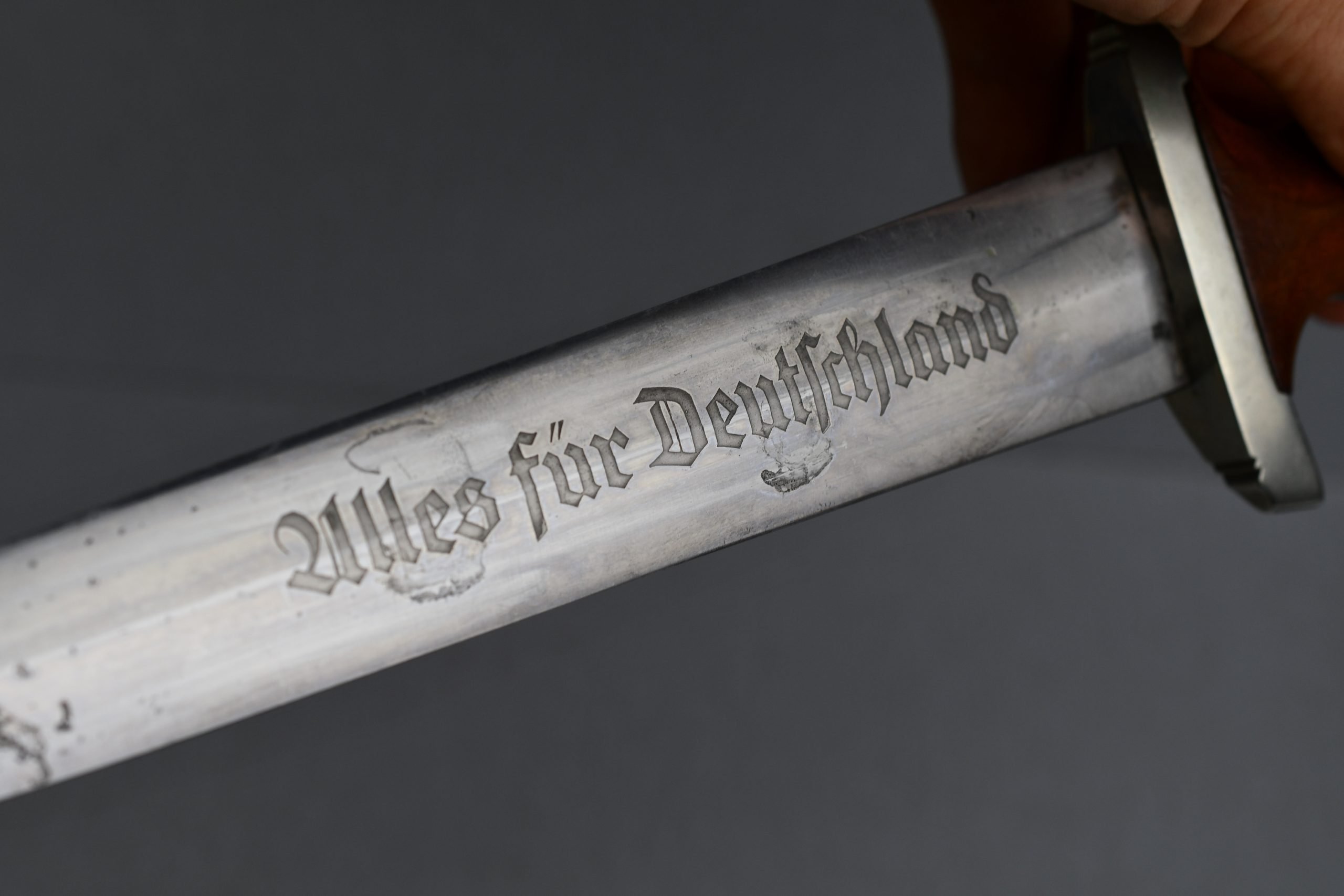 Early M33 SA dagger by Kober in very good β untouched β condition. Blade remains in good condition, uncleaned. Crossgraining is firmly present, as well is the motto Alles fΓΌr Deutschland. Cross guard marked on the reverse with 'Th', a match for this manufacturer. Scabbard black laqcuer still firmly present for more than 90%. Again this is a truely untouched and uncleaned piece. Stunning dagger by a desirable manufacturer Wilh. Kober & Co. Suhl. The company logo is on the reverse ricasso. This manufacturer is desirable and very rare. The blade shoulders perfectly meet the lower crossguard contour. Complete with early hanger A very nice early SA dagger!SHIPPING IN MAINLAND EUROPE ONLY!