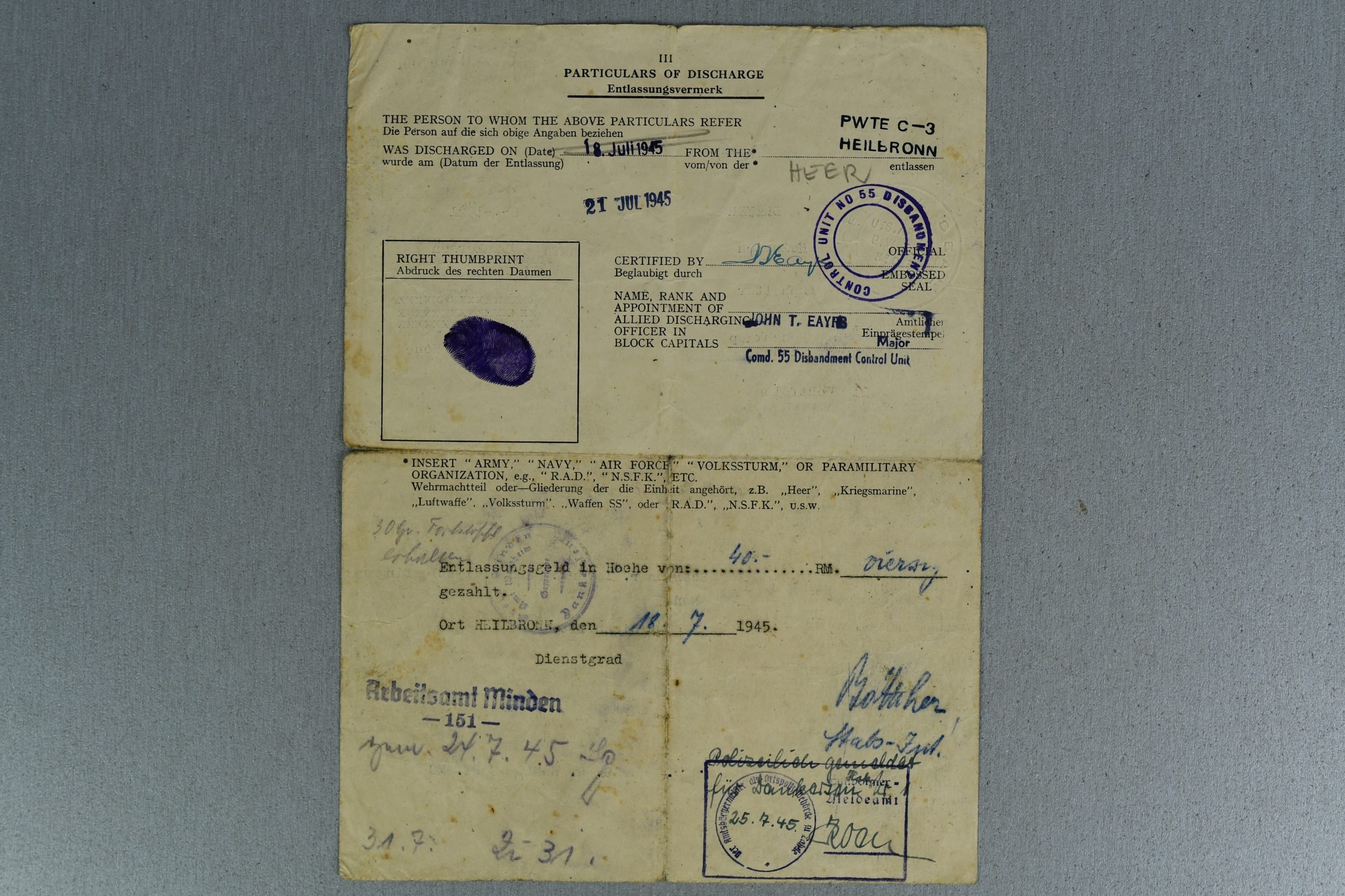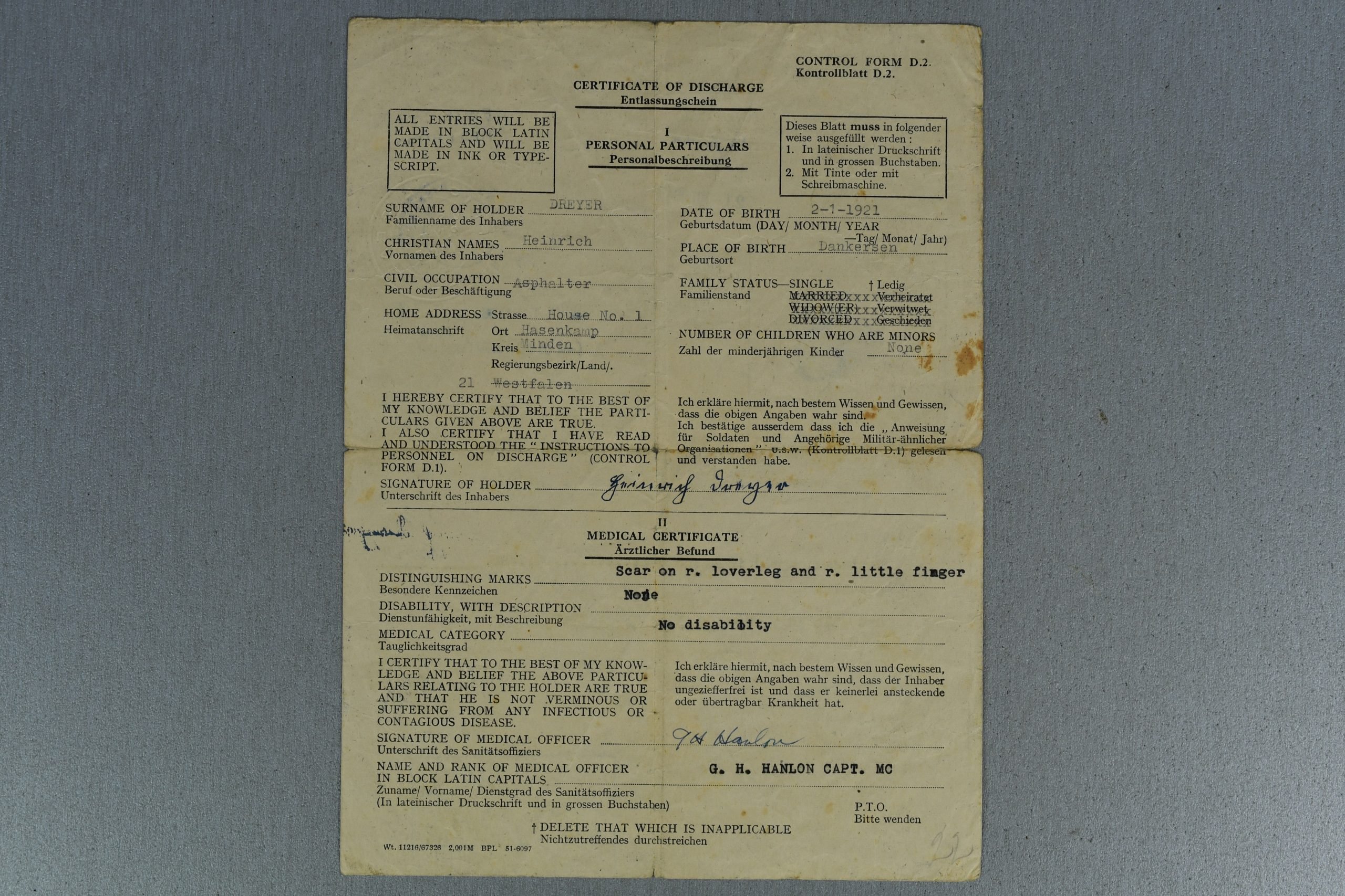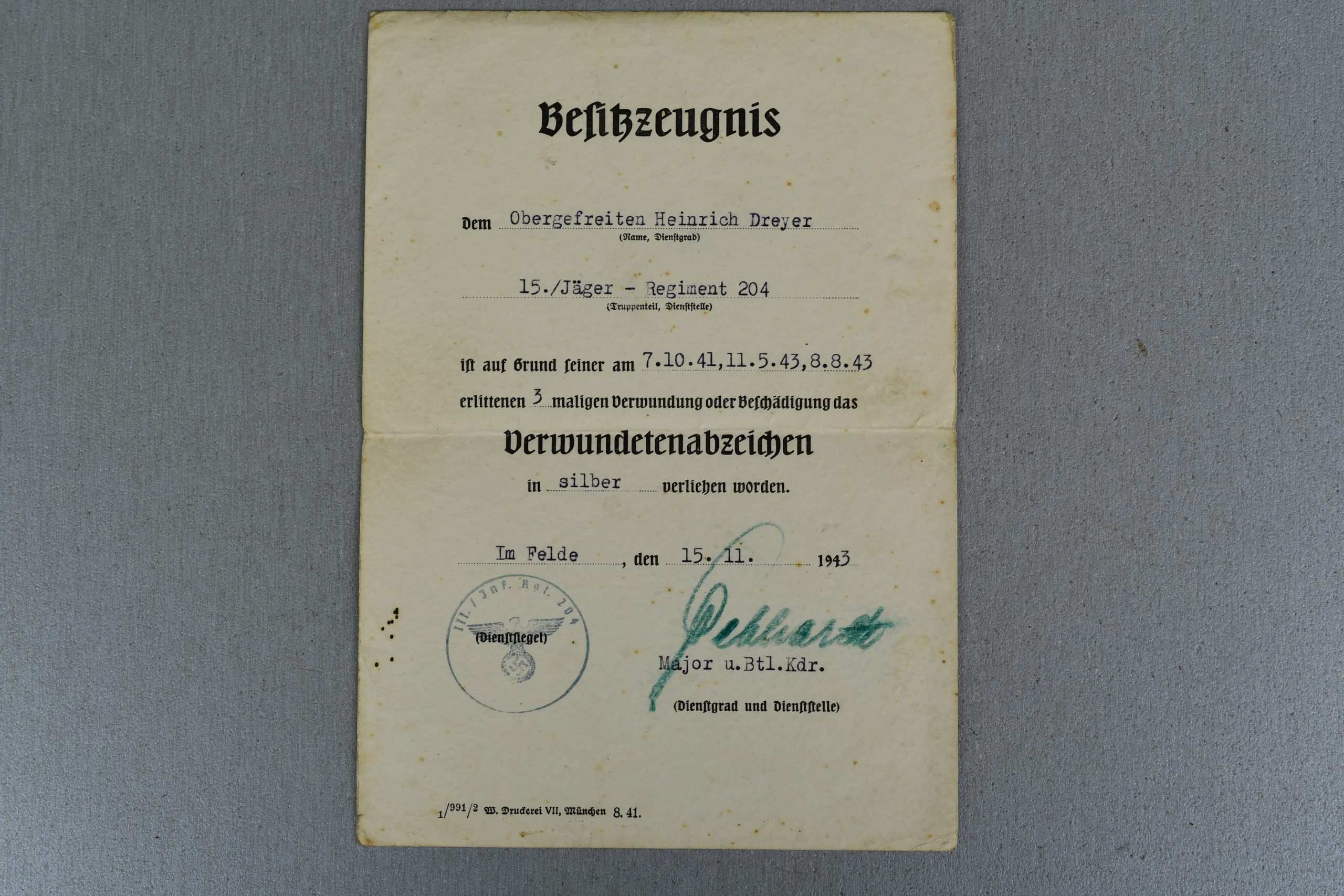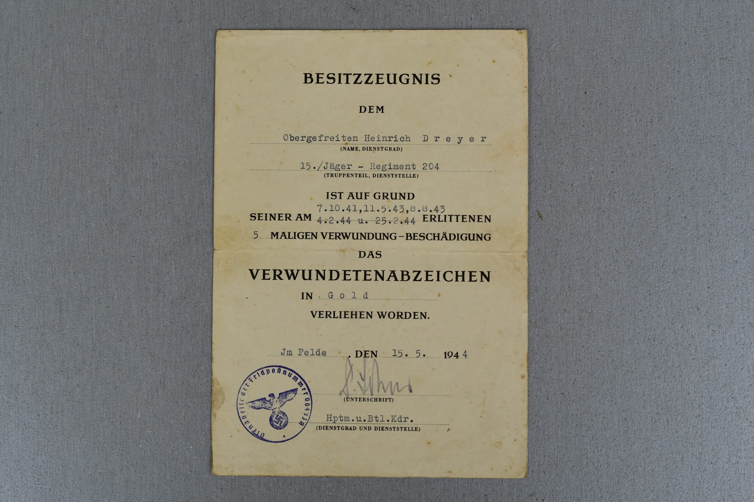 Army (Heer) document grouping Heinrich Dreyer JΓ€ger-Regiment 204 Wound badge in gold