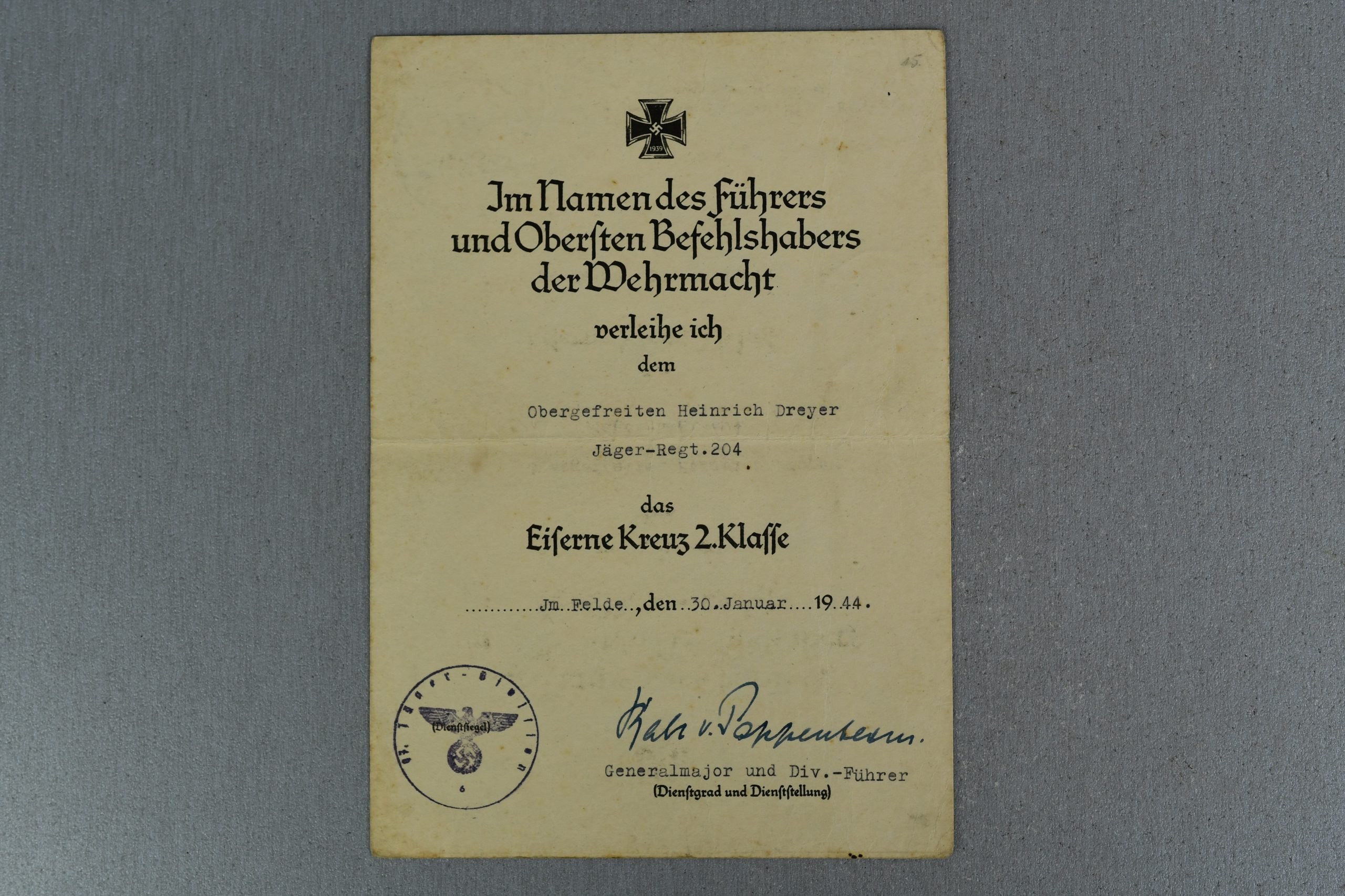 Very nice document grouping with many extra's, from the relatives from Obergefreiter Heinrich Dreyer part of JΓ€ger-Regiment 204. Nice award documents from the Iron Cross 2nd class, wound badge in silver and very rare document for the wound badge in gold!