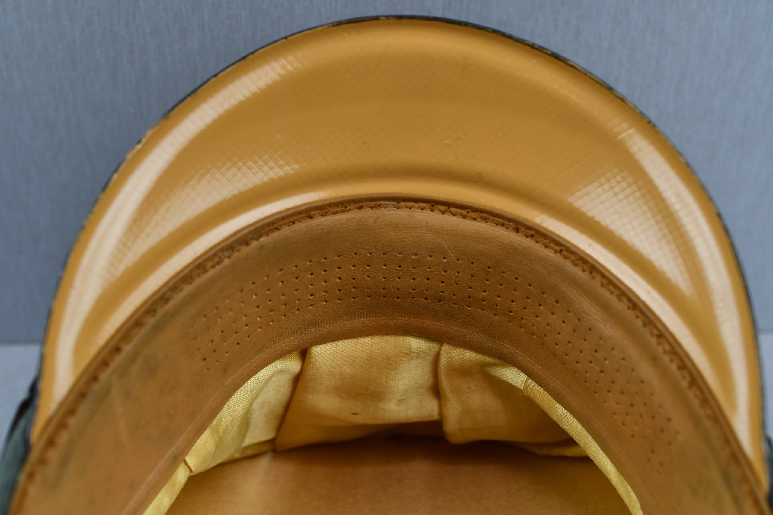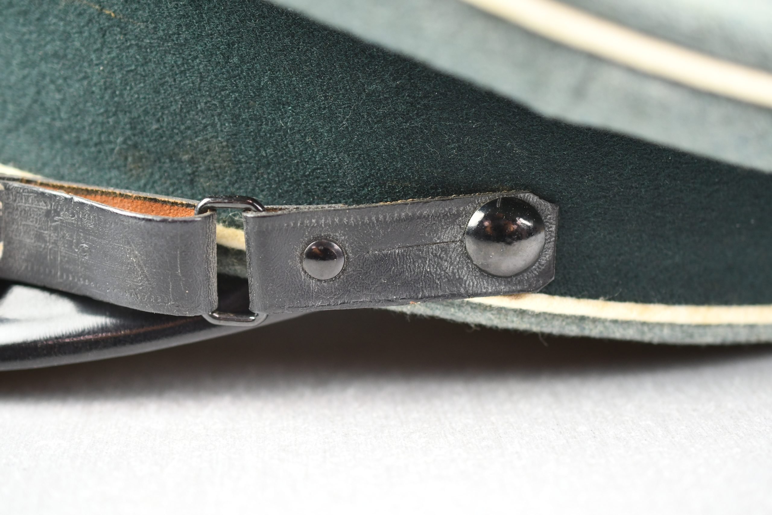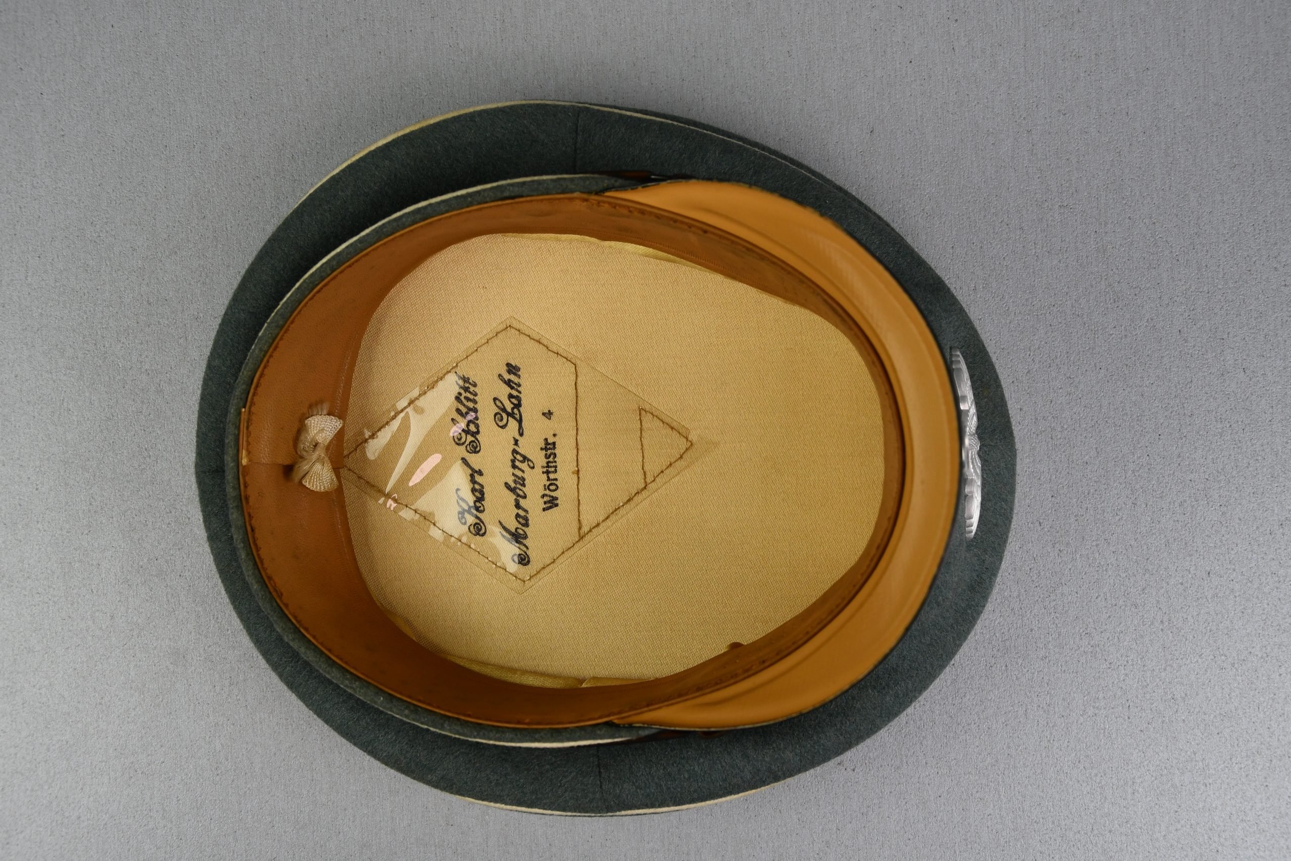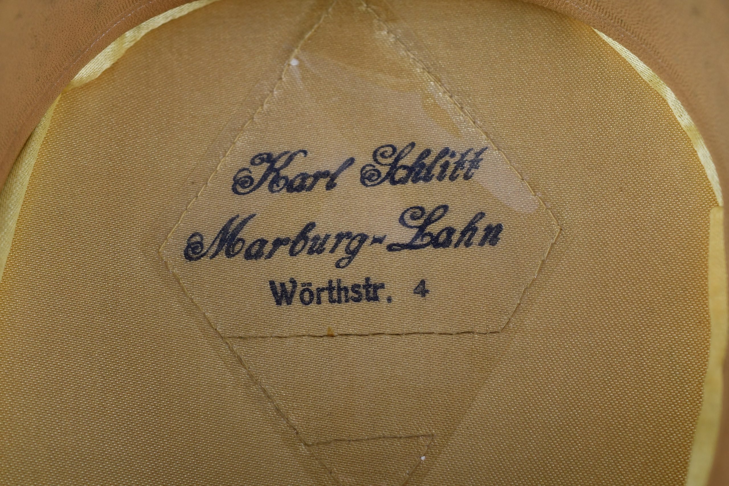 Beautiful army infantry visor for enlisted men in unworn β MINT β condition. Void of damages. White infantry piping surrounds the cap and looks bright. A set of early aluminium national insignia is period pierced through the front of the cap. Both eagle and cocarde show matching patina and nice details. The liner is complete with its sweatband. The celluloid sweat diamond is still present and shows manufacturer mark of Karl Schnitt Marburg-Lahn. Size +-57. Beautiful infantry cap!!