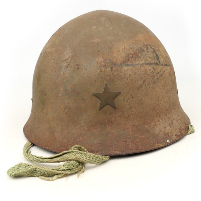World War 2 Japanese Type 90 Steel Helmet. The helmet is complete with original star insignia on front. The helmet is complete with its original leather type liner and chinstrap. The liner is nicely marked on the inside of one of the flaps. This helmet was taken home as a souvernir by a US GI during World War 2. The helmet is showing some minor surface rust and remains in uncleaned and untouched codition as found. Nice original WW2 Japanese helmet in good used condition!