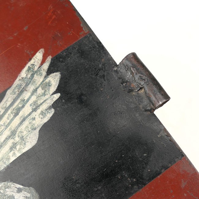 Luftwaffe Flak Artillery Officer's Staff Car Pennant (Fahrzeug Wimpel fΓΌr FLAK Offiziere). The metal pennant is showing a hand-painted Luftwaffe Eagle to each side. The Deep Red/Black/Deep Red stripes indicate that it is intended for a Luftwaffe Flak Anti-Aircraft Artillery Battalion. The pennant is sized approximately 39 x 24 cms. Rare and decorative original pennant in good used condition!