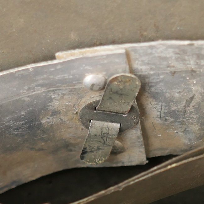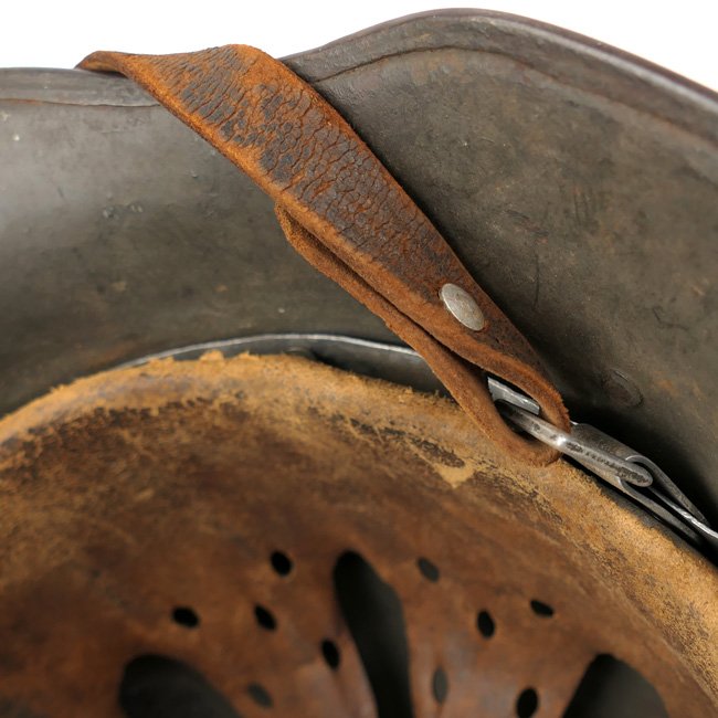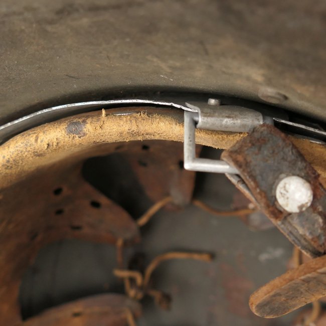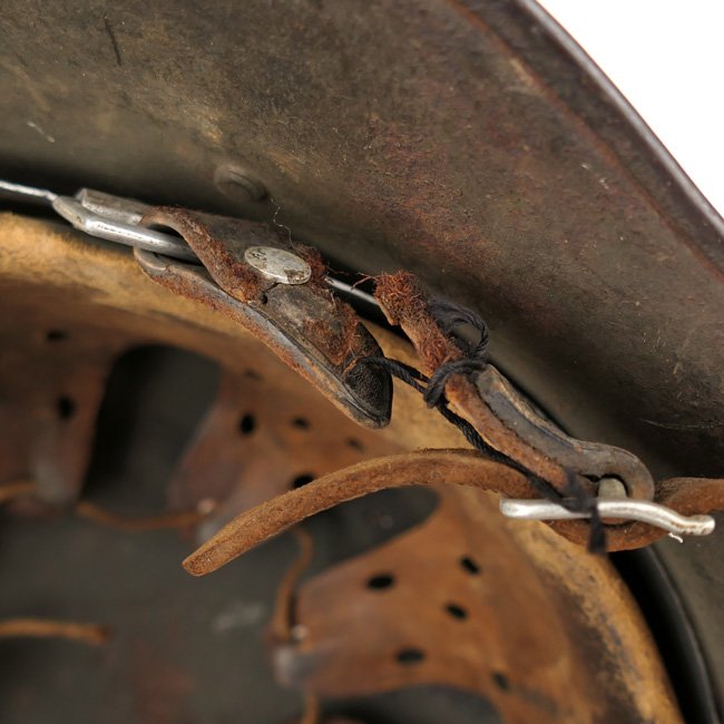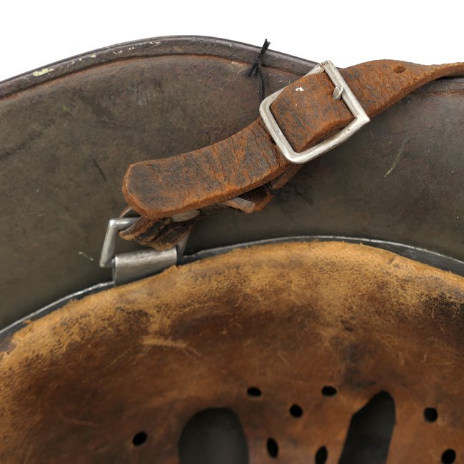 WH (Heer) Double Decal M17 Combat Helmet (Stahlhelm M17), reissued in the Wehrmacht. The Austrian M16/M17 helmet was almost identical to the German version with the positioning of the chinstrap liner rivets being the most readily identifiable difference. The steel construction M17 helmet was refurbished for usage in the Wehrmacht (Heer) by applying an Army decal. The steel construction helmet retains most of its original typical reissue style field-grey paint, the paint is showing some scratches and normal traces of usage and slight surface rust. The decal is in good condition with some minor damage and scratches caused by usage, the decal is present for about 75%. All three liner retaining rivets are intact. The interior of the helmet is an original early M31 liner having a single aluminum liner ring. The liner is approximately a size '57', the original liner cord is present. The helmet is complete with its original early damaged chinstrap, see photos. The helmet is in overall good used and untouched condition as found. Nice original reissued M17 helmet in good condition!