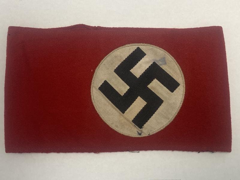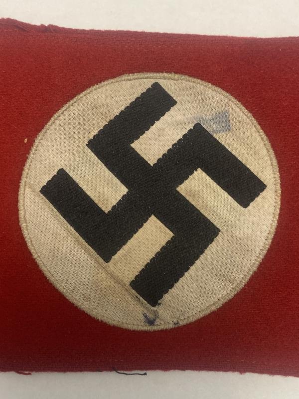 Original well worn NSDAP party armband. Made of wool with cotton roundel and woven swastika. Some threads visible where it was once sewn to a uniform.